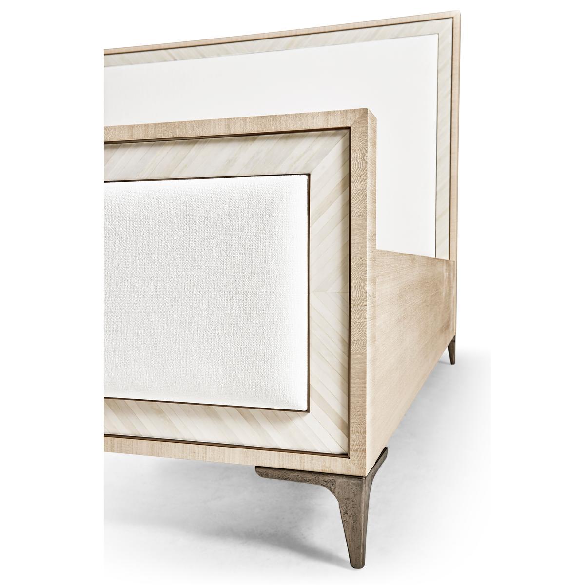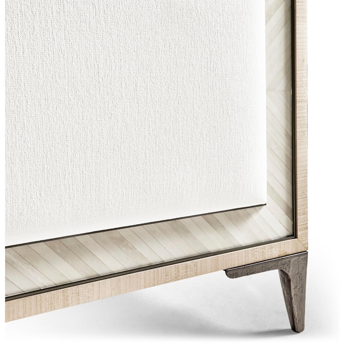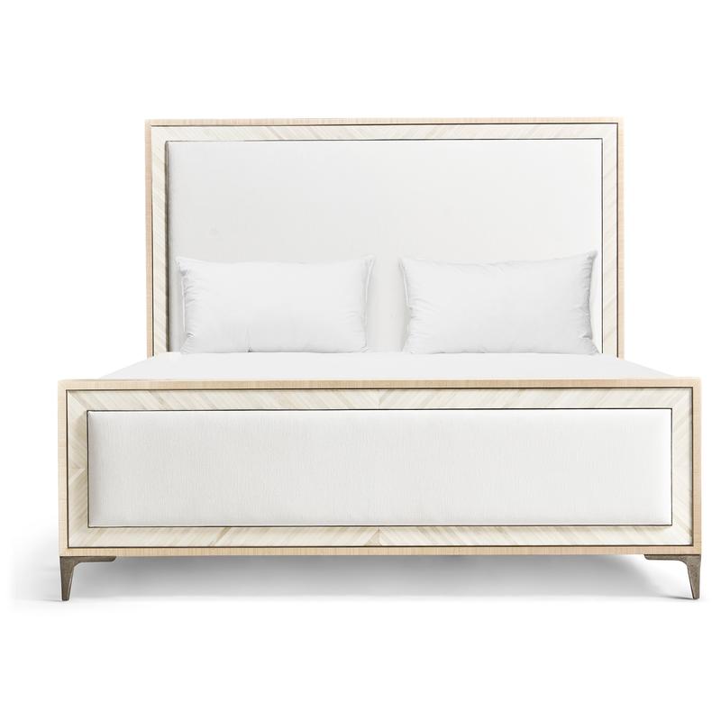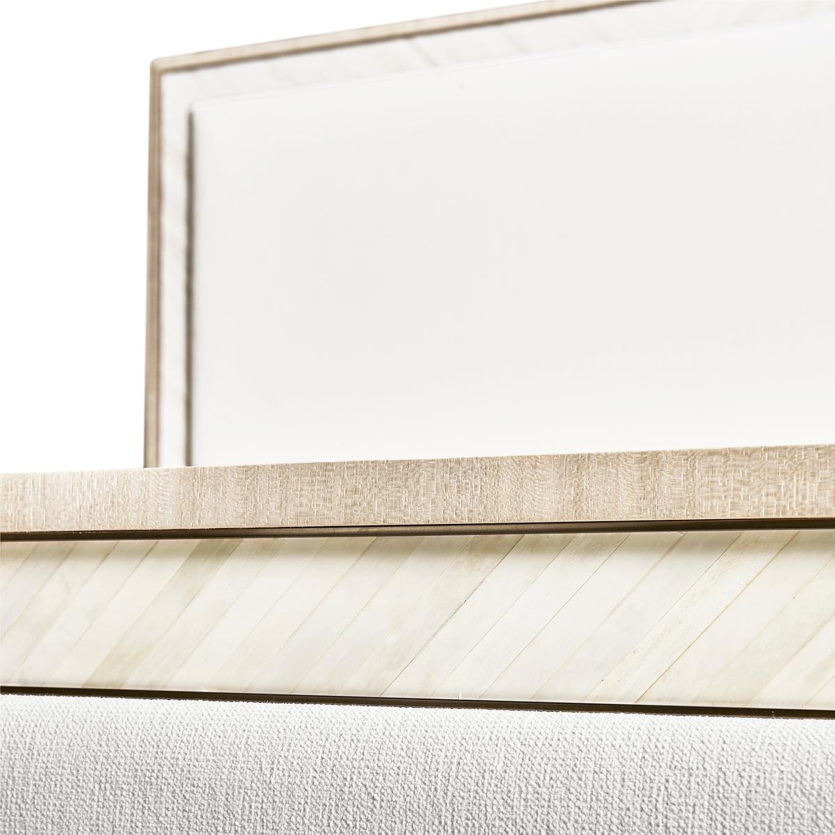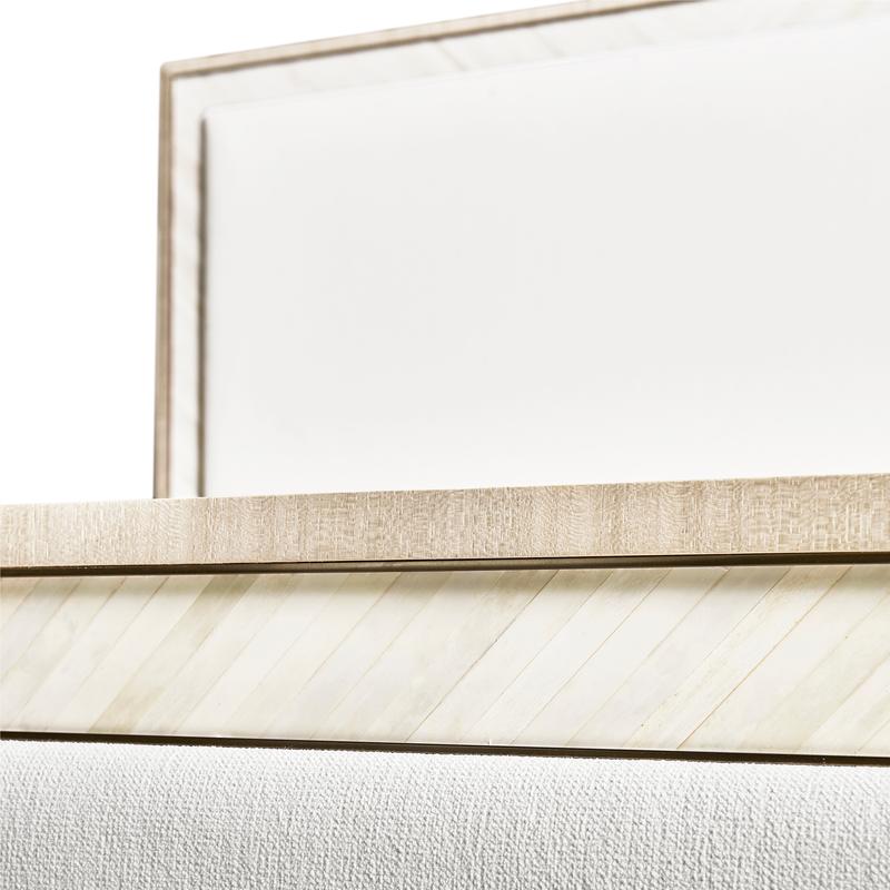 A showstopper of Jonathan Charles’ new Water portfolio, the Tideline bone & linen-blend upholstered bed is beautifully made from sustainably harvested materials with flawless craftsmanship. Performance linen-blend upholstery compliments flush bone inlay framed with stainless steel banding finished in satin white brass for undeniable elegance and understated glam. Delicately perched on custom cast stainless steel feet, Tideline elevates modern and contemporary bedroom spaces.