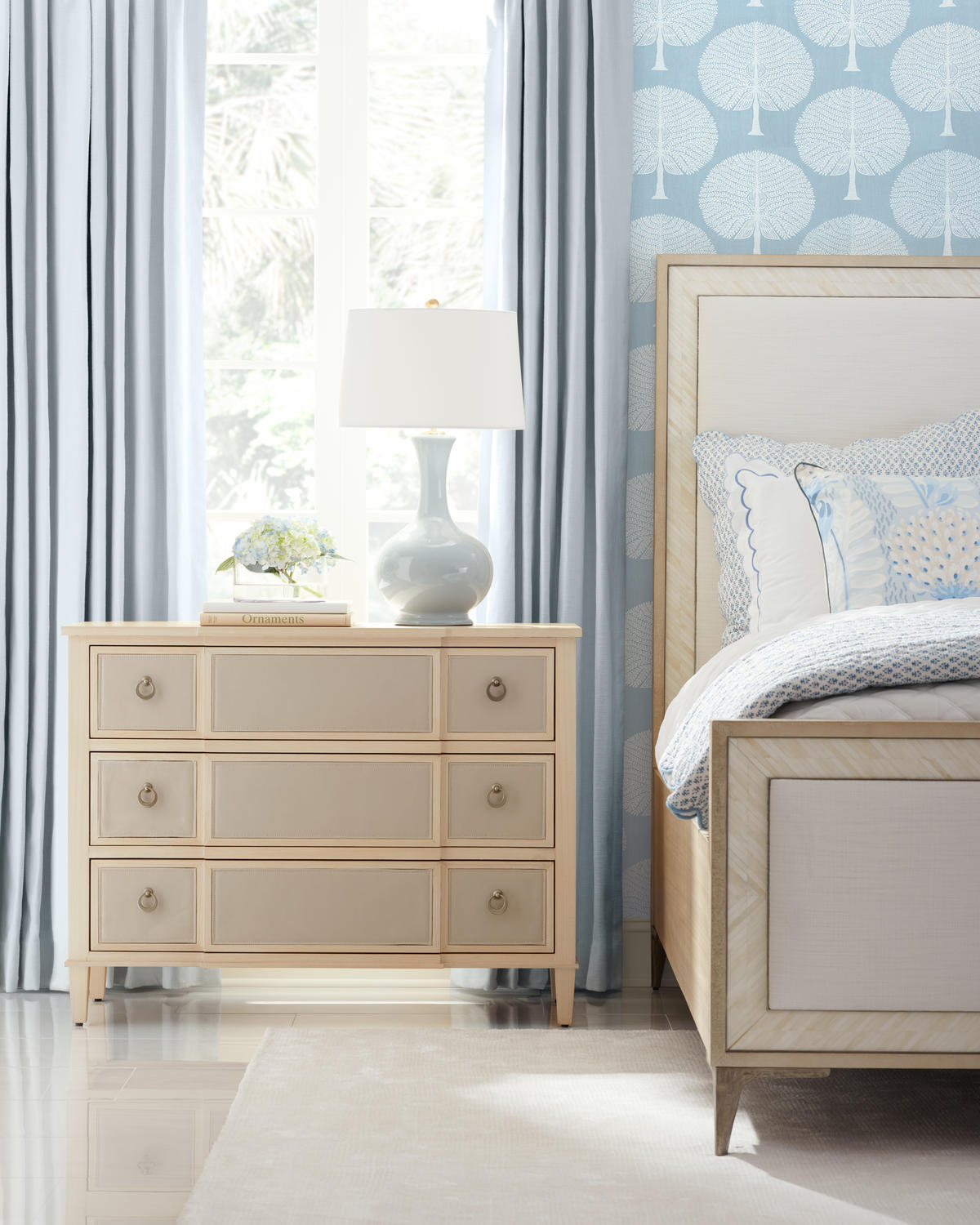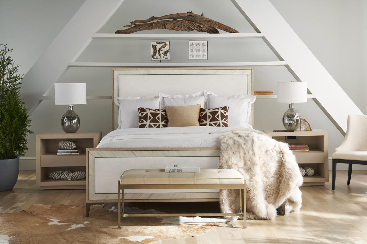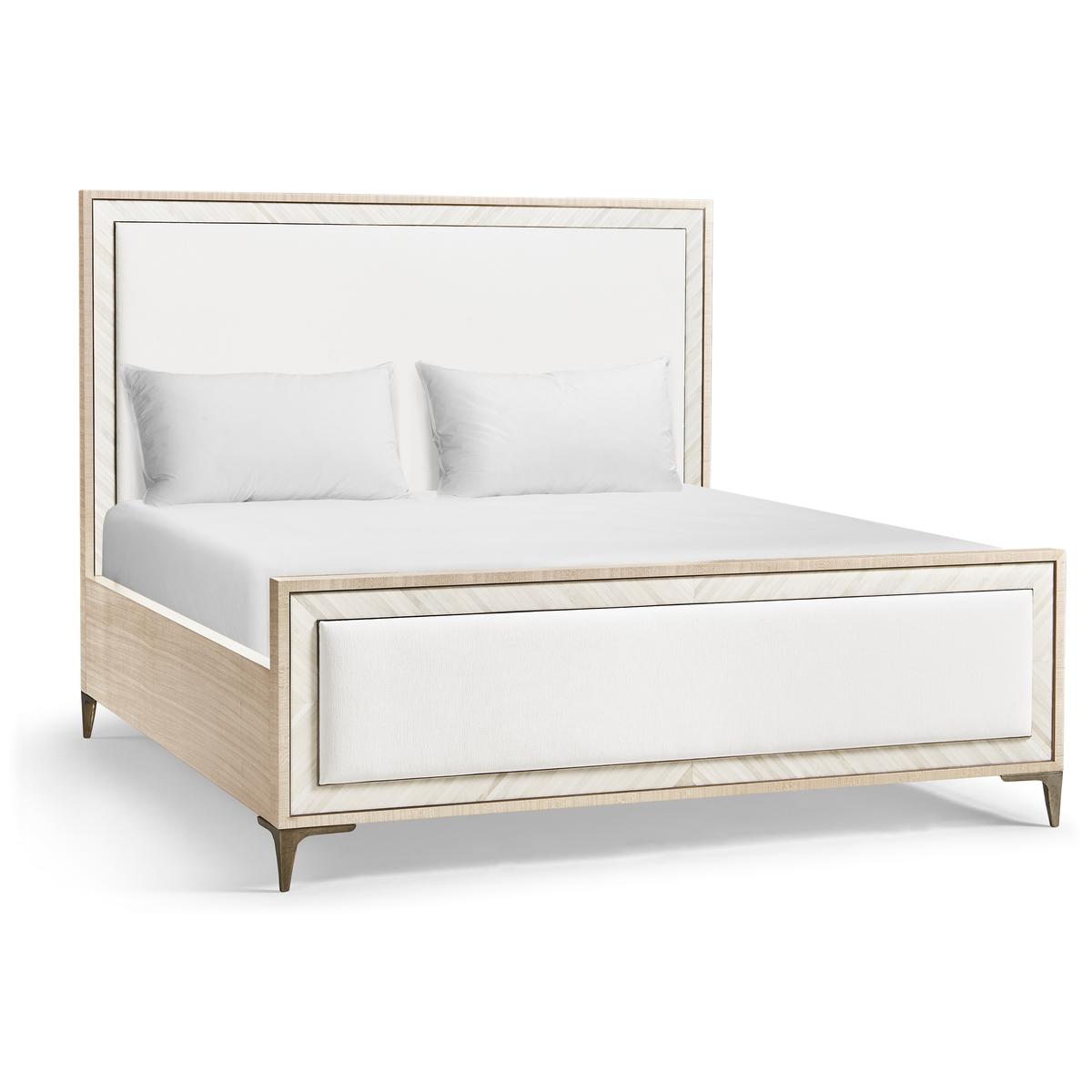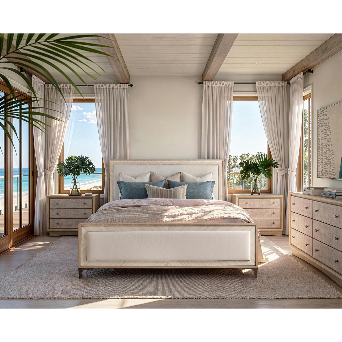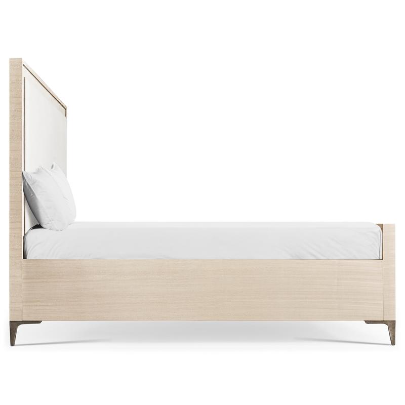 A showstopper of Jonathan Charles’ new Water portfolio, the Tideline bone & linen-blend upholstered bed is beautifully made from sustainably harvested materials with flawless craftsmanship. Performance linen-blend upholstery compliments flush bone inlay framed with stainless steel banding finished in satin white brass for undeniable elegance and understated glam. Delicately perched on custom cast stainless steel feet, Tideline elevates modern and contemporary bedroom spaces.