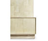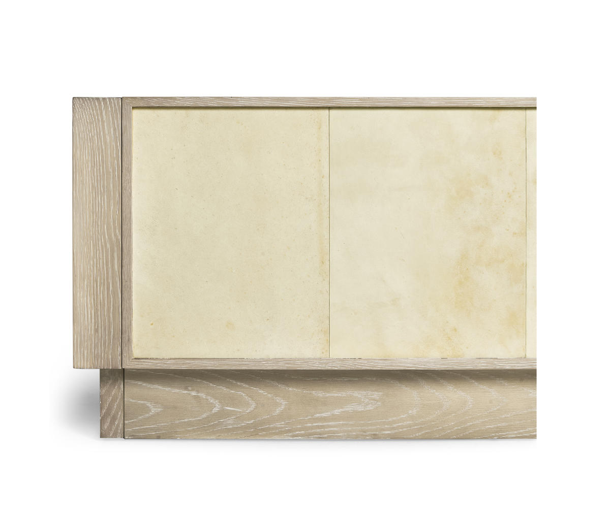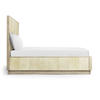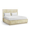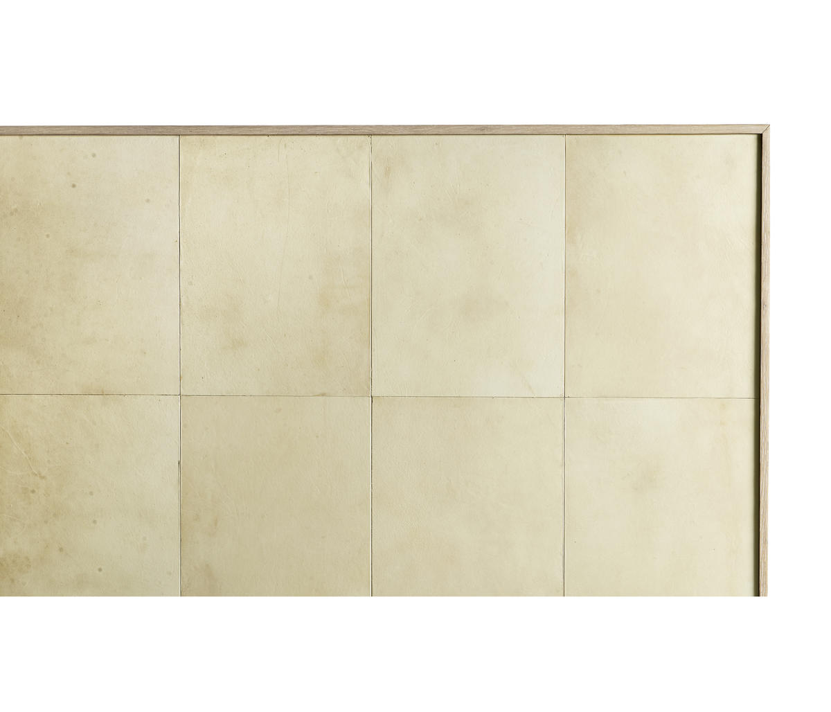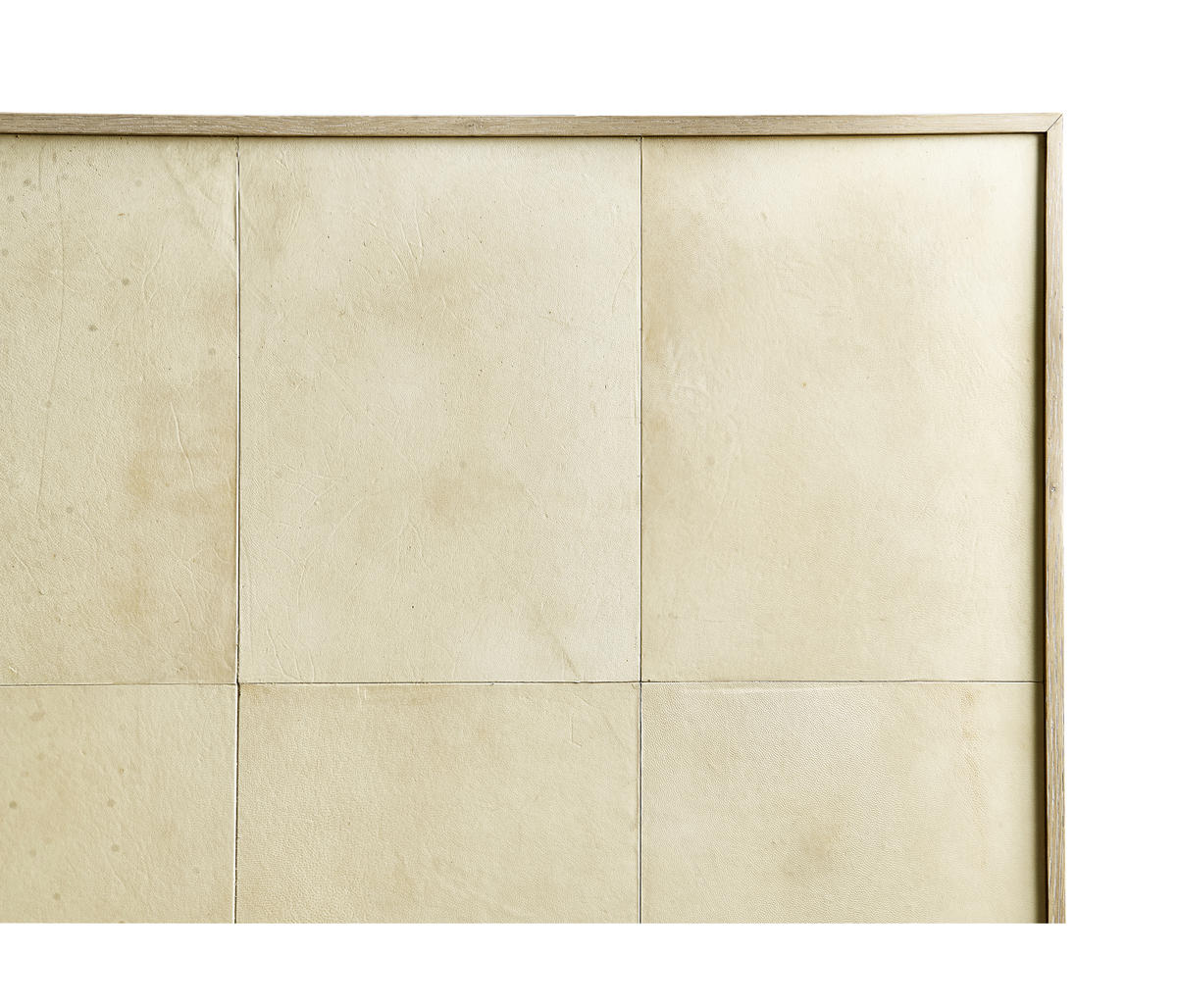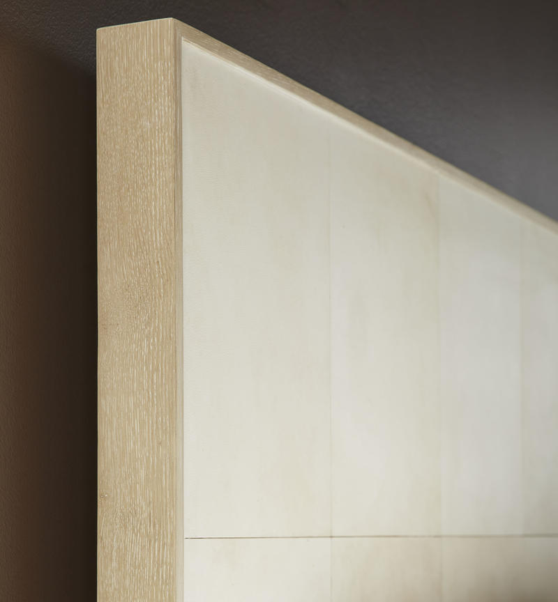 The Hydra King Bed brings a sophisticated contemporary aesthetic to any bedroom with its parchment inlay and refined craftsmanship. Constructed from oak solids and flat-cut random match oak veneers, it features genuine, untreated parchment panels that are sealed with a clear coat for enhanced durability. The oak-framed headboard, footboard, and side rails provide a sleek, structured look, while the plinth-style oak base adds a modern, floating effect. Designed for both style and functionality, the bed includes a mattress support board, eliminating the need for a boxspring. The Hydra King Bed is a statement piece that blends natural materials with contemporary elegance.