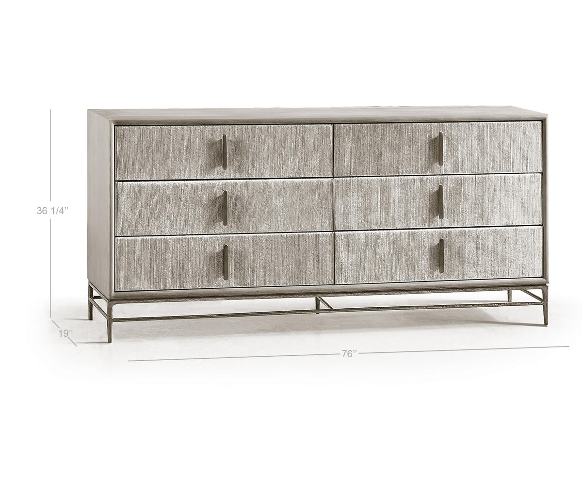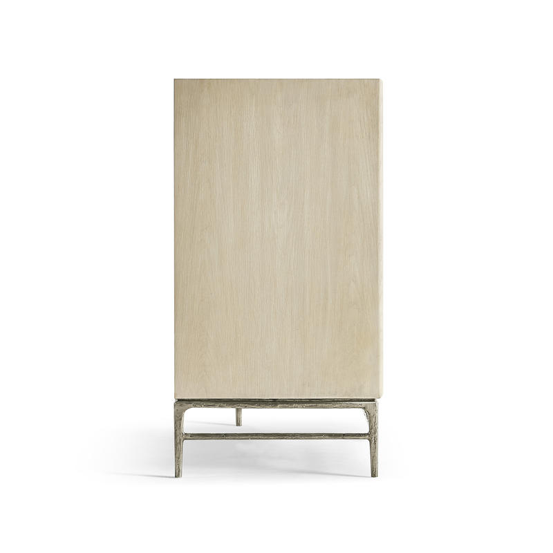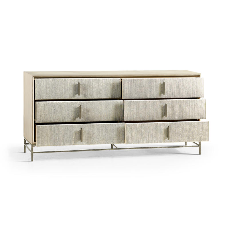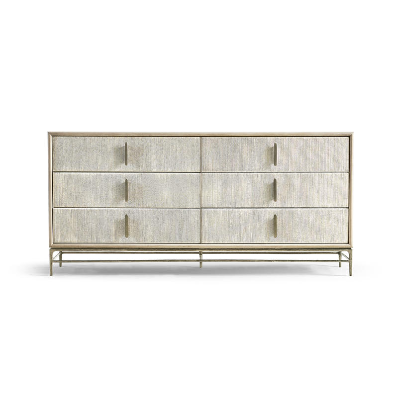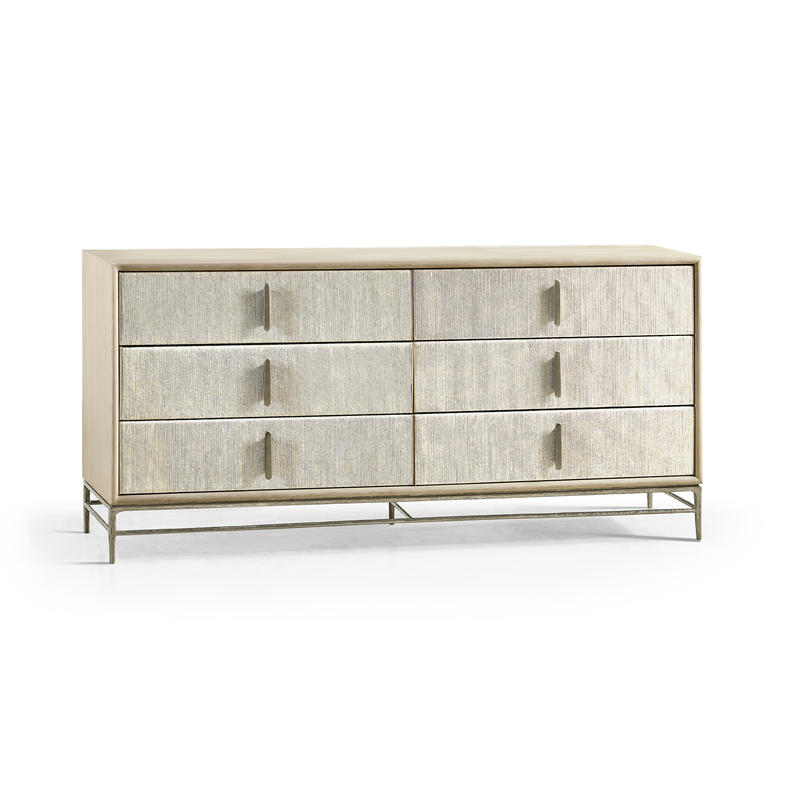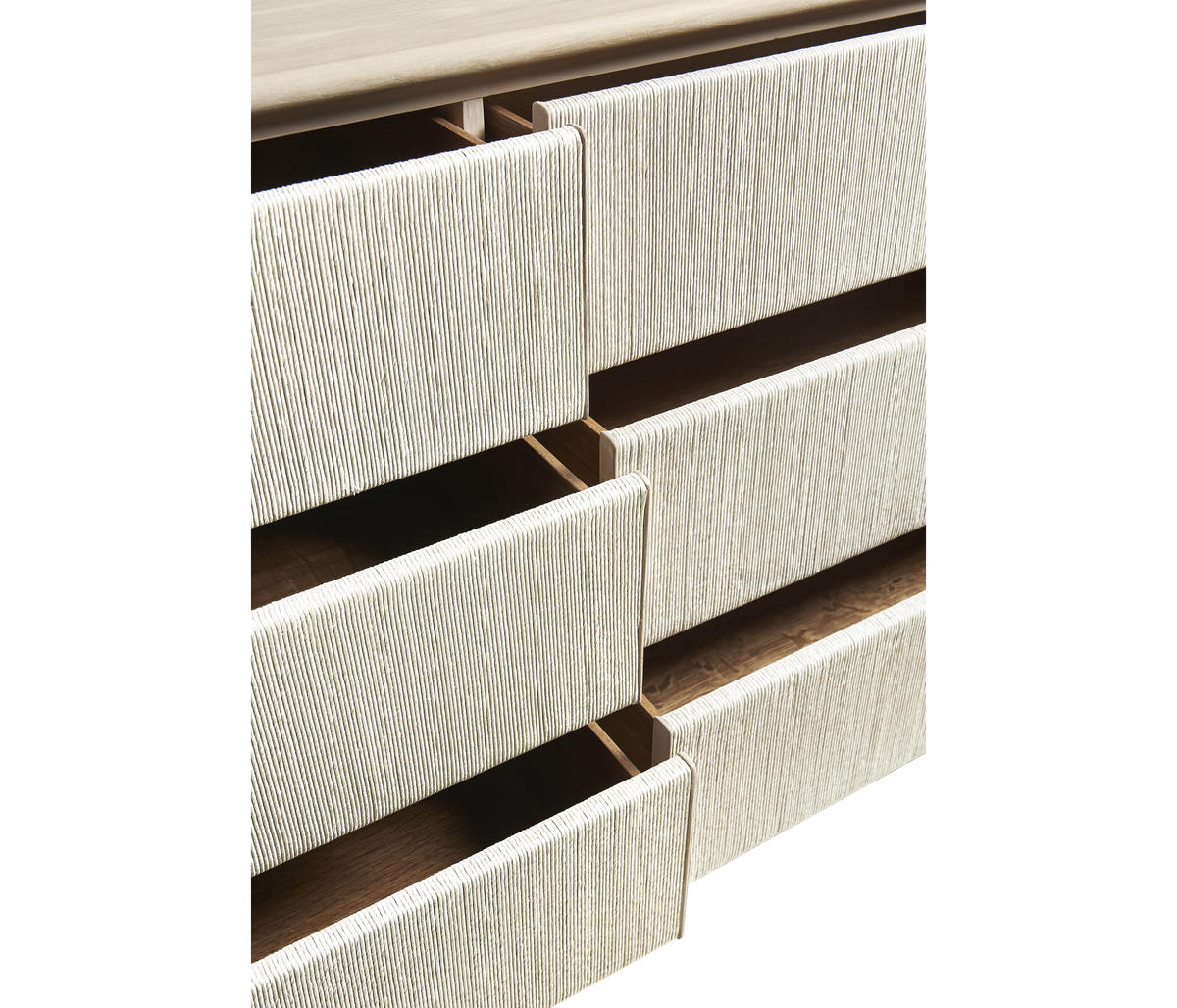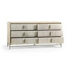 The stylish design of Jonathan Charles’ Clapotis double dresser, replete with six Danish cord-wrapped drawer fronts and bleached oak veneers adds style to the classic tone and feel of contemporary vision without shortcuts. Cast stainless steel base and vertical hardware handcast in Jonathan Charles’ foundry are finished in elegant satin white brass for a luxurious and sleek effect befitting refined and eclectic spaces.