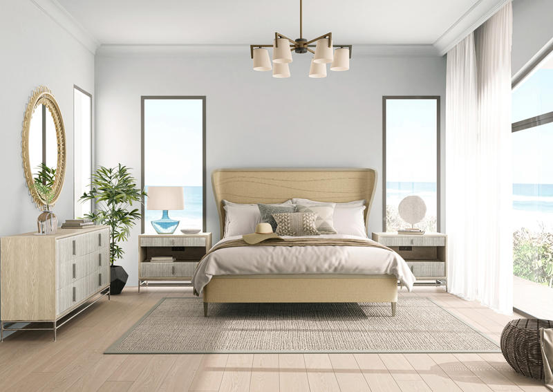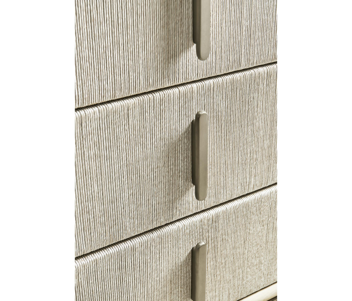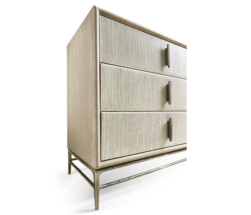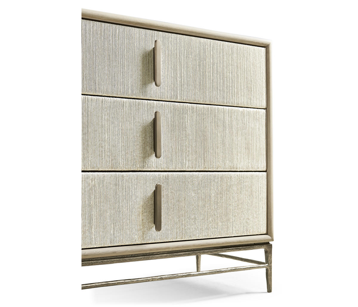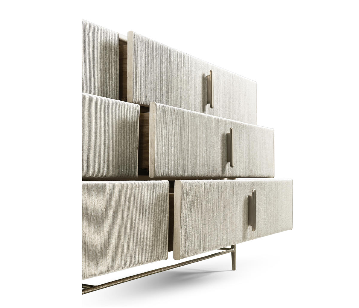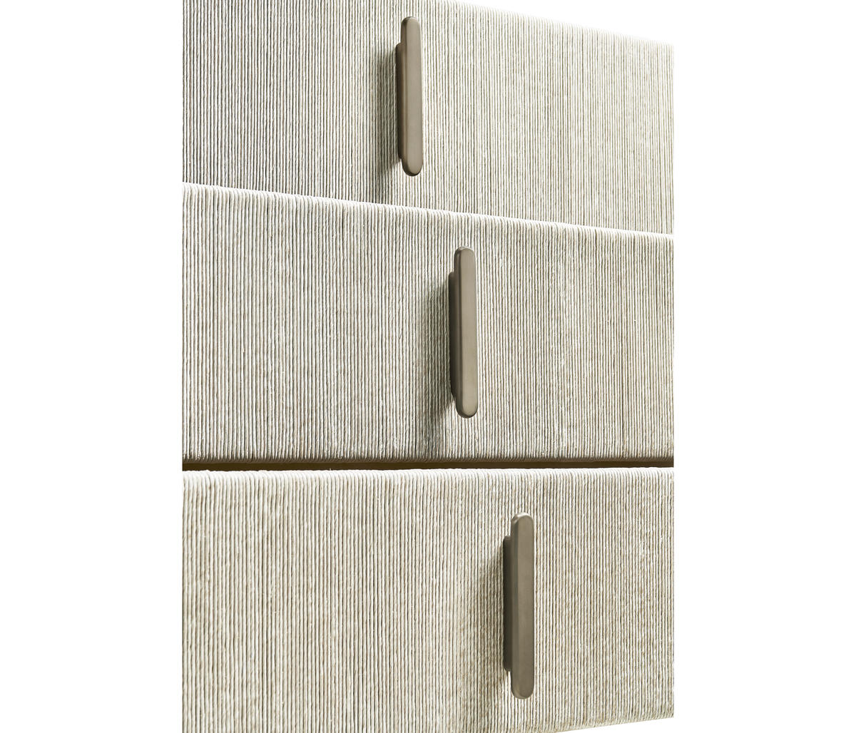 The stylish design of Jonathan Charles’ Clapotis double dresser, replete with six Danish cord-wrapped drawer fronts and bleached oak veneers adds style to the classic tone and feel of contemporary vision without shortcuts. Cast stainless steel base and vertical hardware handcast in Jonathan Charles’ foundry are finished in elegant satin white brass for a luxurious and sleek effect befitting refined and eclectic spaces.