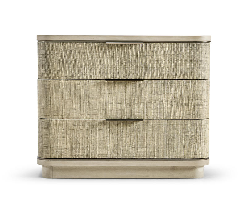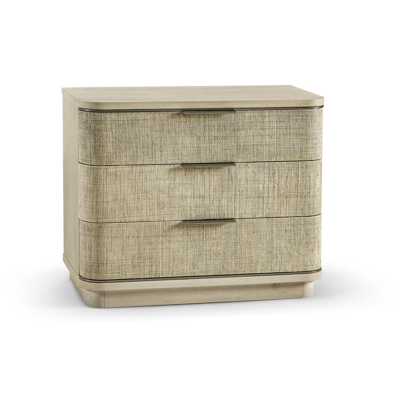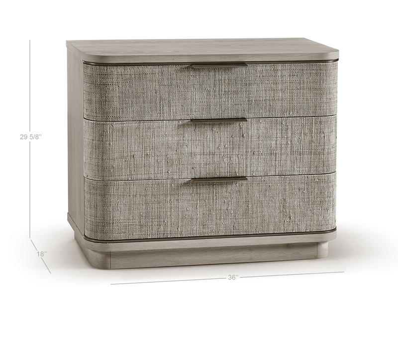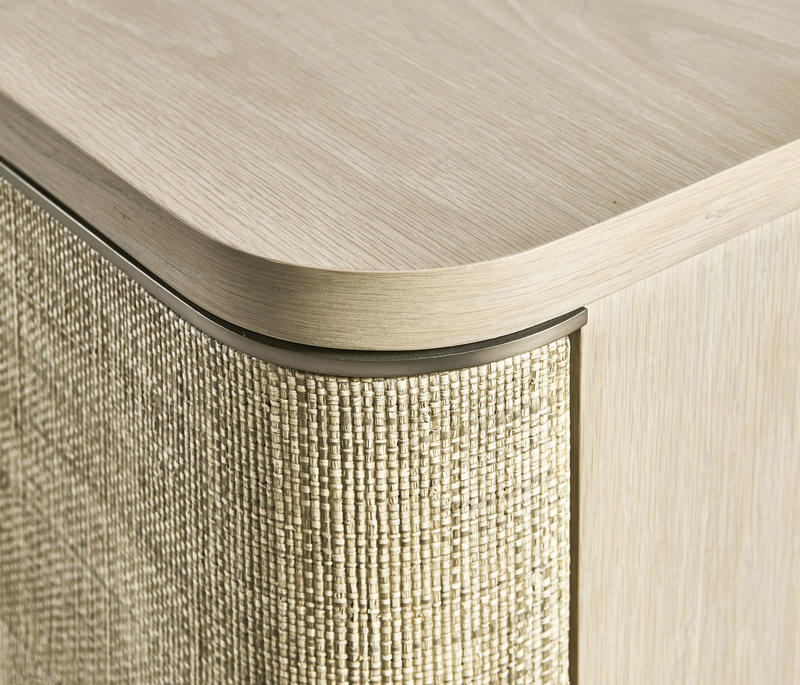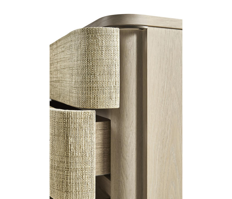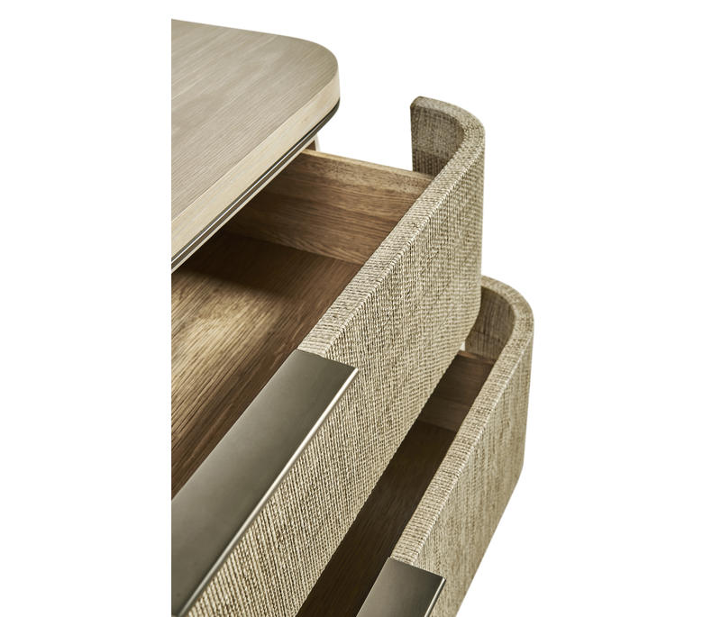 Born from passion with incredibly crafted aesthetic details, the Seiche woven wave night chest’s captivating lines and sublime curves promise a new level of interior expression. Grasscloth wrapped around three bleached oak drawers with custom cast hardware in an eclectic mix of materials that captures a dazzling sense of organic movement and form.