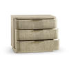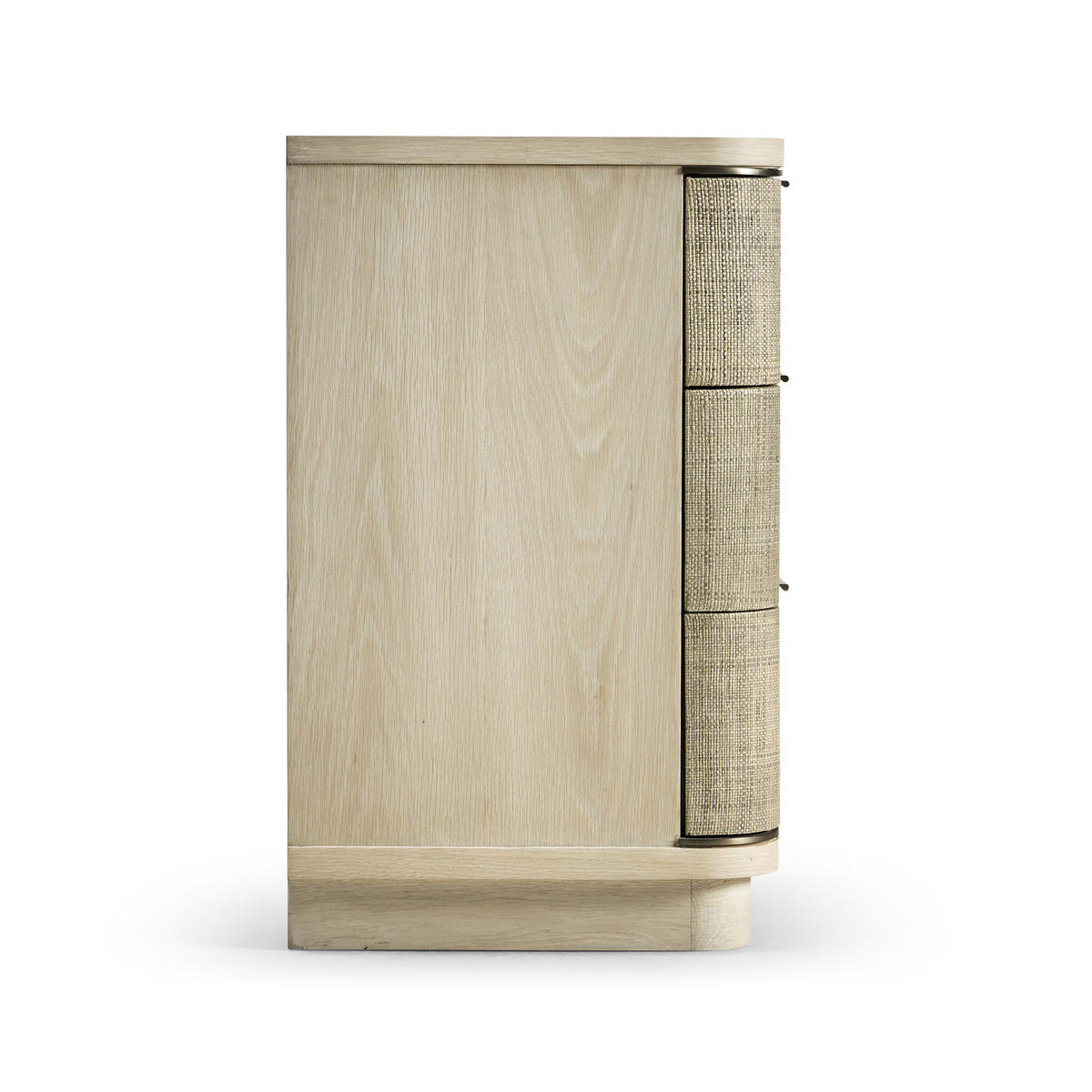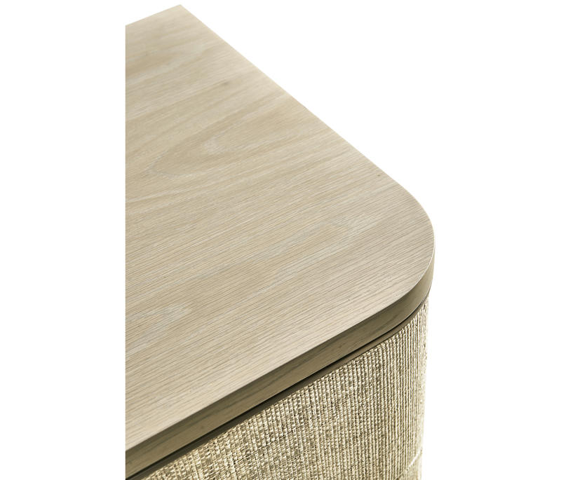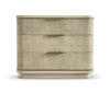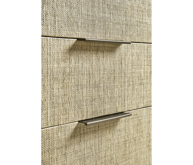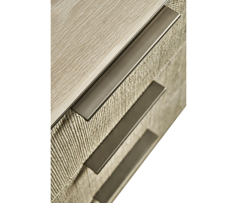 Born from passion with incredibly crafted aesthetic details, the Seiche woven wave night chest’s captivating lines and sublime curves promise a new level of interior expression. Grasscloth wrapped around three bleached oak drawers with custom cast hardware in an eclectic mix of materials that captures a dazzling sense of organic movement and form.