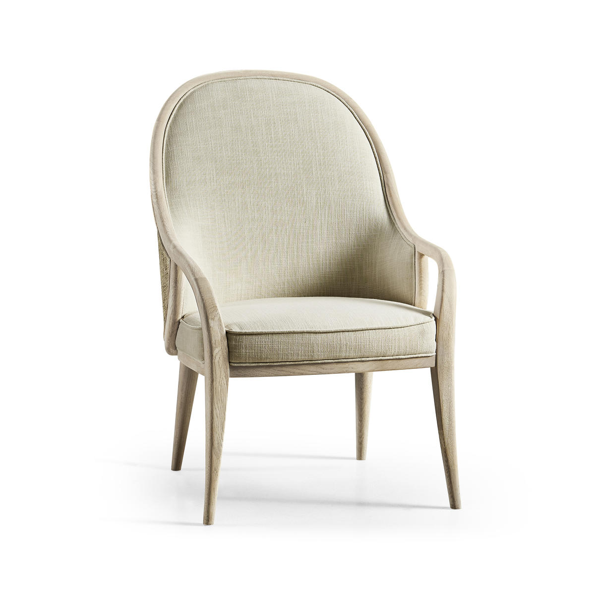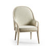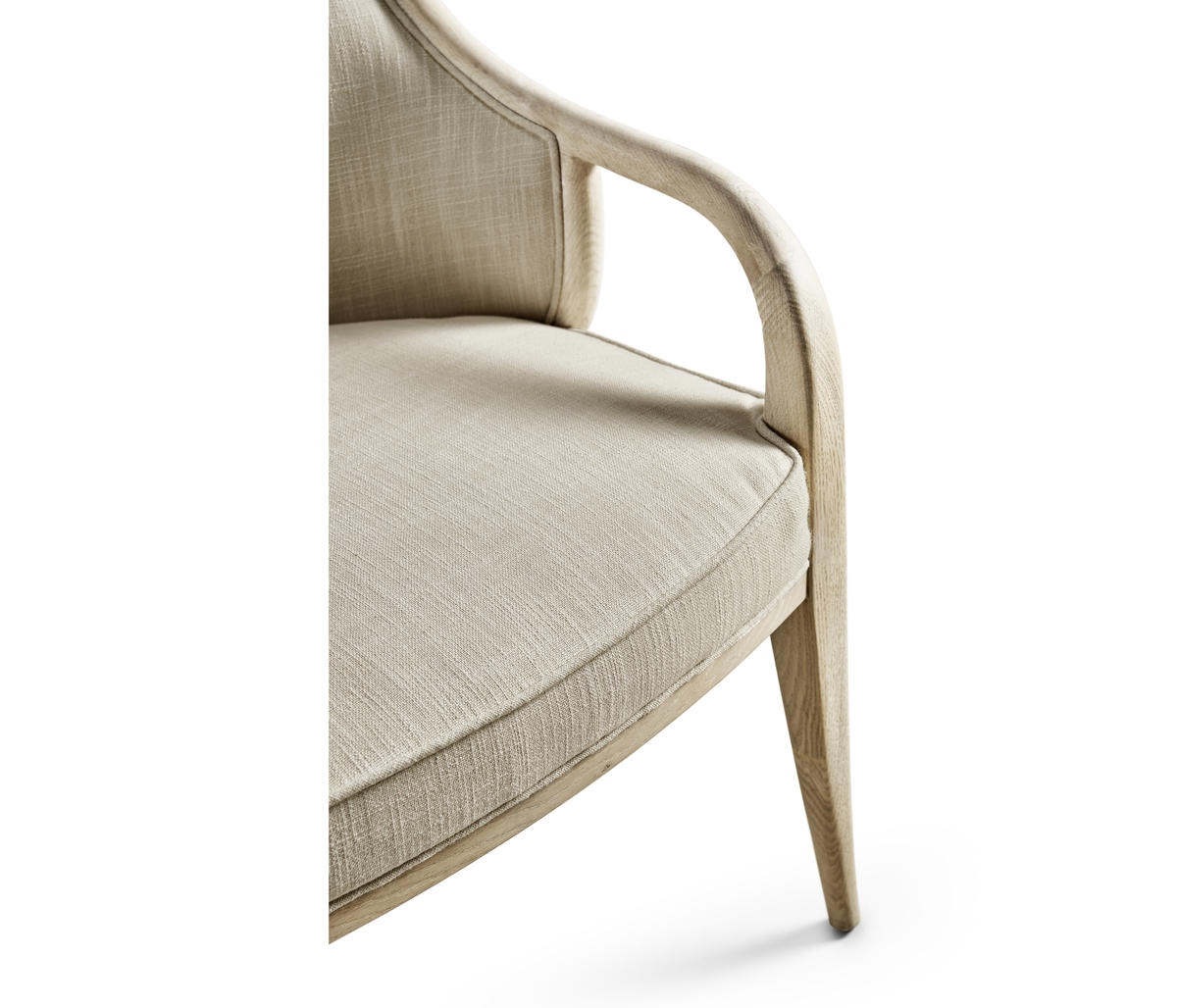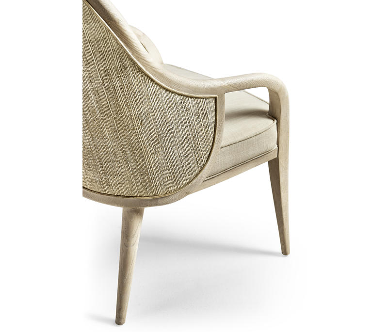Comfortable and elegant, this Jonathan Charles dining arm chair embodies the beauty of simplicity with organic forms and clean lines for a contemporary aesthetic. The creamy texture of the fabric instills wonder and a deep sense of connection to the natural world. Inspired by the deep wells where water rests and stills, this chair, solidified with an oak frame in white washed oak, provides the perfect luxuriating dining experience for modern coastal interiors.
