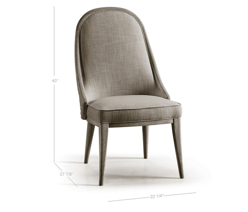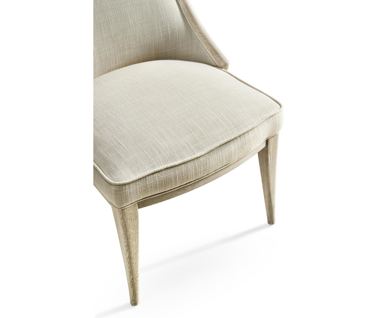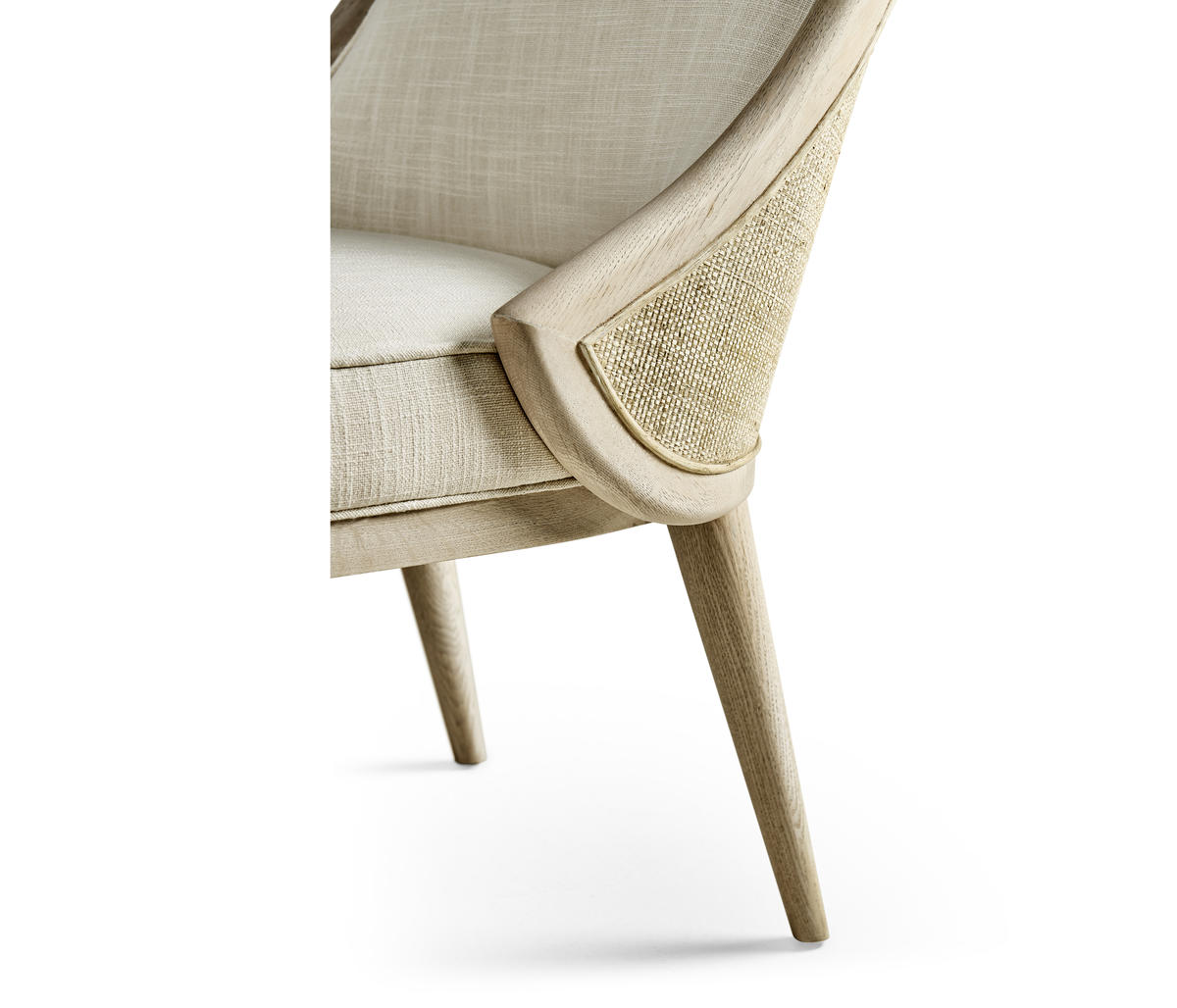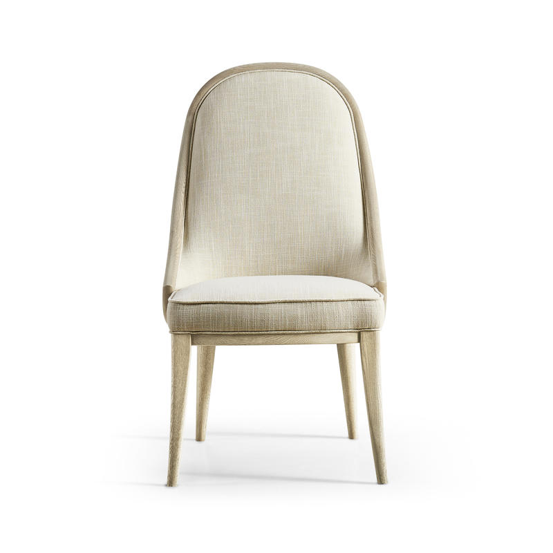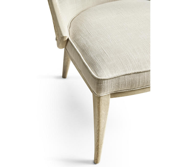 Comfortable and elegant, this Jonathan Charles dining arm chair embodies the beauty of simplicity with organic forms and clean lines for a contemporary aesthetic. The creamy texture of the fabric instills wonder and a deep sense of connection to the natural world. Inspired by the deep wells where water rests and stills, this chair, solidified with an oak frame in white washed oak, provides the perfect luxuriating dining experience for modern coastal interiors.