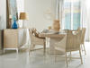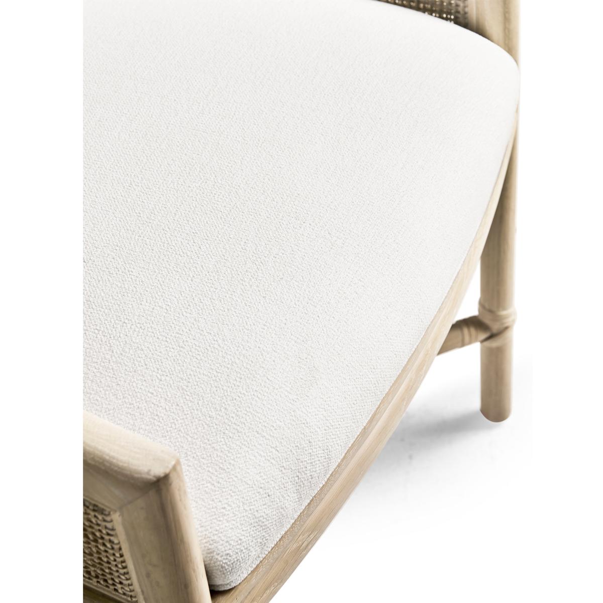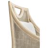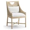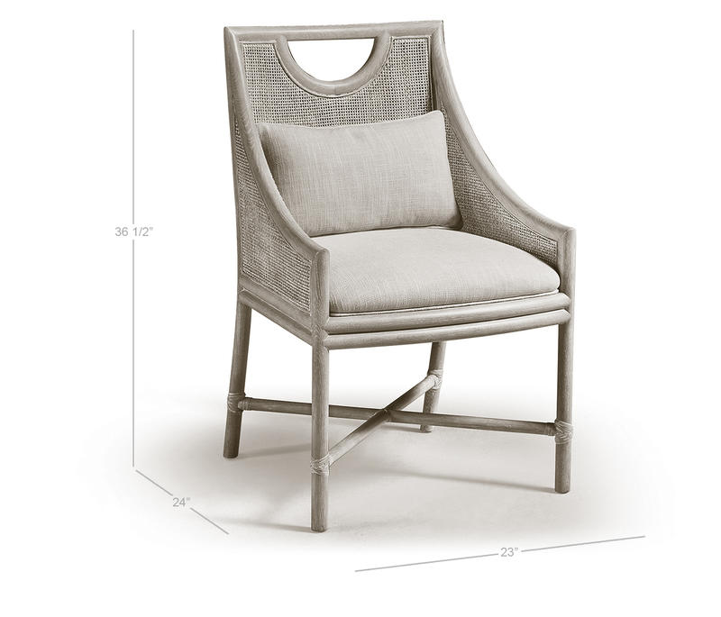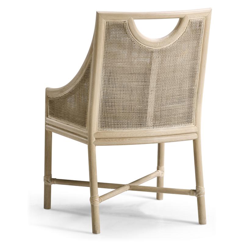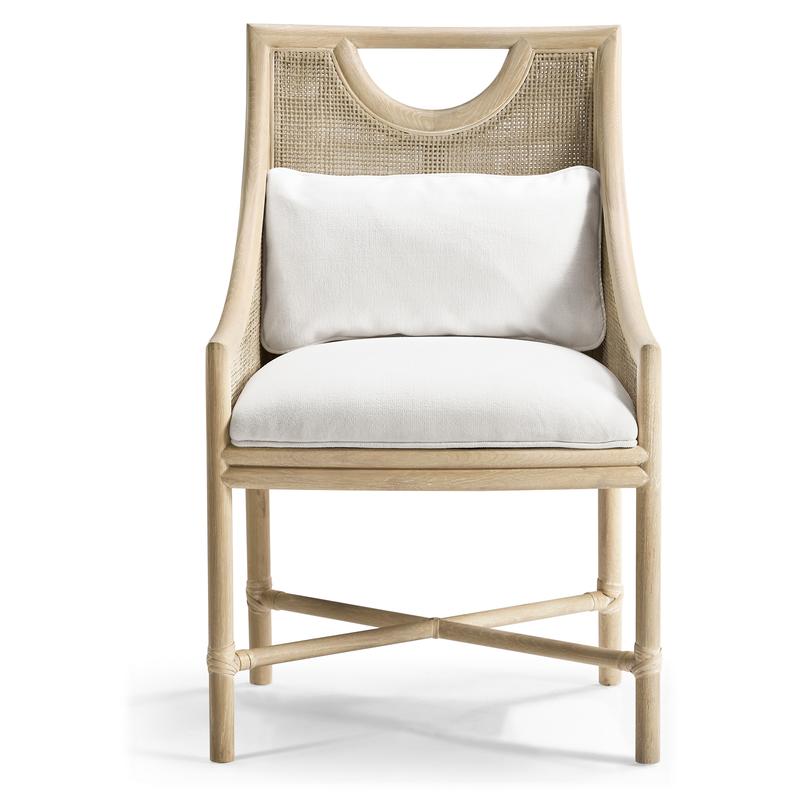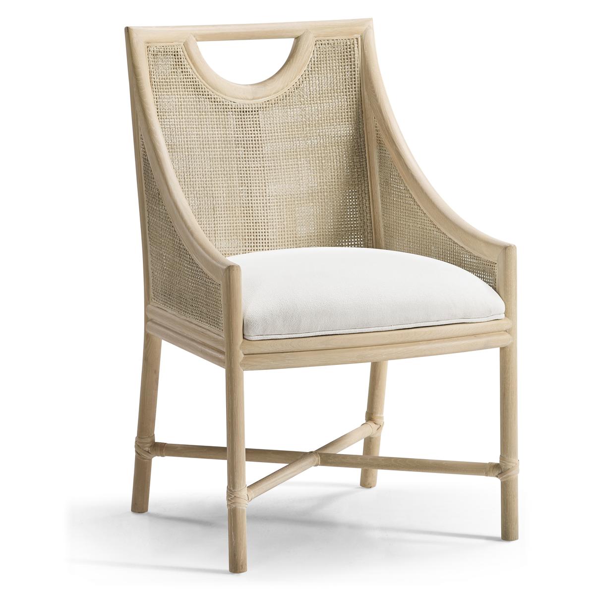 The Fjord Dining Chair effortlessly blends casual contemporary and coastal aesthetics with its light, airy design and artisan details. Crafted from oak solids in a white-washed cerused oak finish, its frame highlights the natural beauty of the wood while showcasing a cane panel back for a breezy, textural touch. Designed for both comfort and style, the chair features an upholstered seat and a removable kidney pillow, both covered in a neutral performance fabric for durability and easy maintenance. The X-stretchers are accented with rope ties, adding a subtle nod to coastal craftsmanship, while a scooped handle pull on the chair back ensures effortless movement. Whether in a relaxed dining space or a refined coastal retreat, the Fjord Dining Chair brings warmth, texture, and timeless charm to any setting.