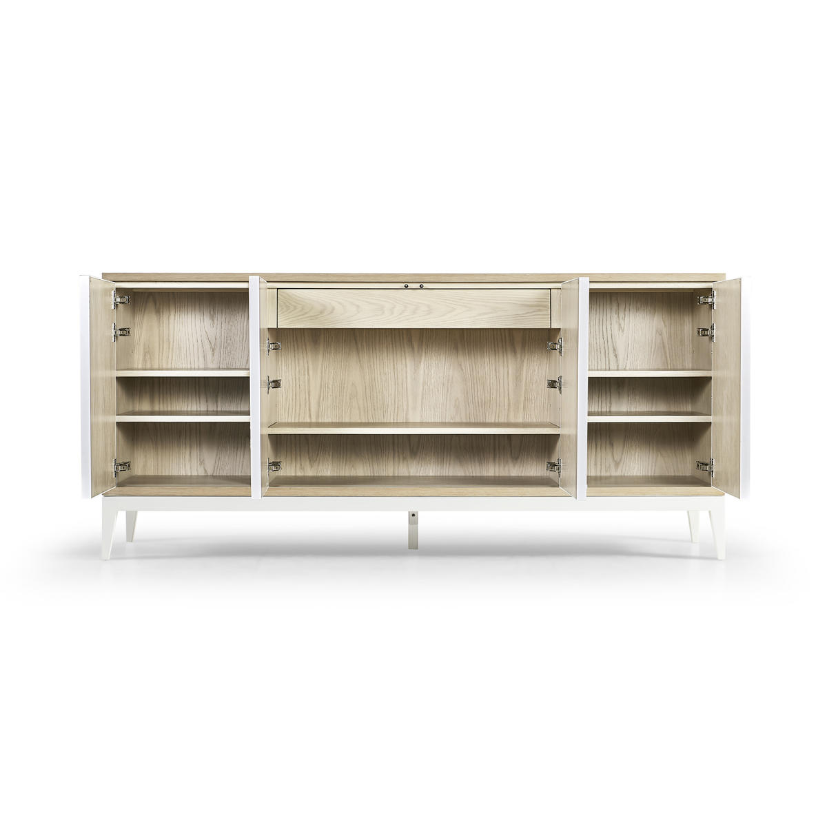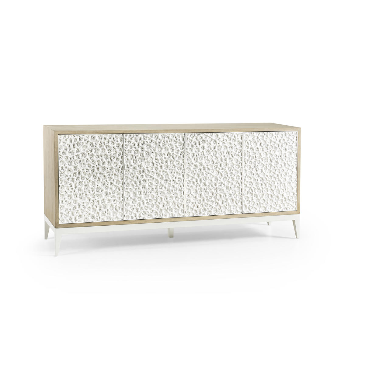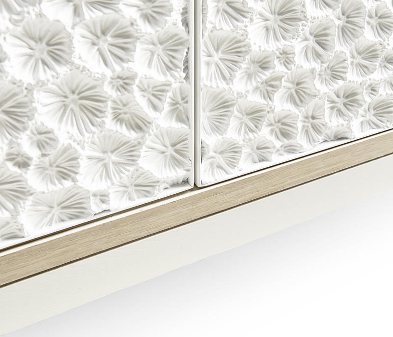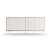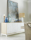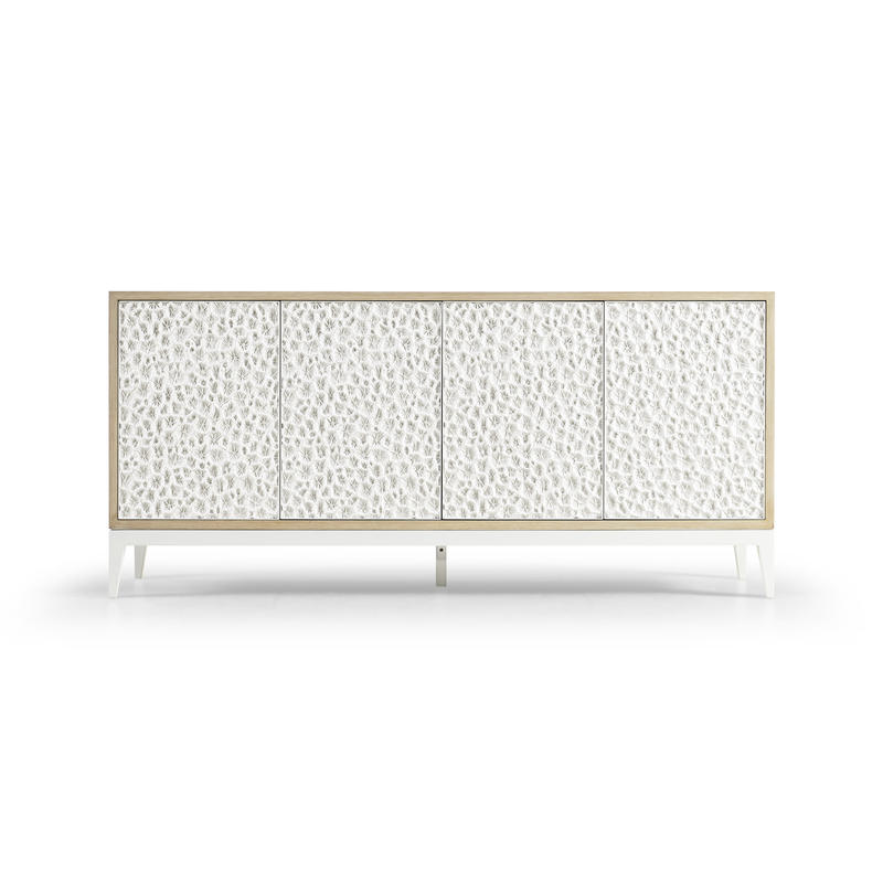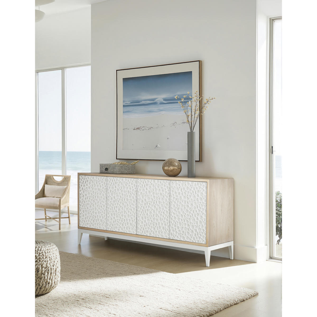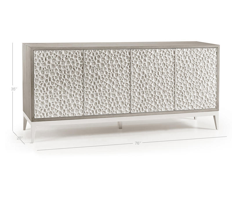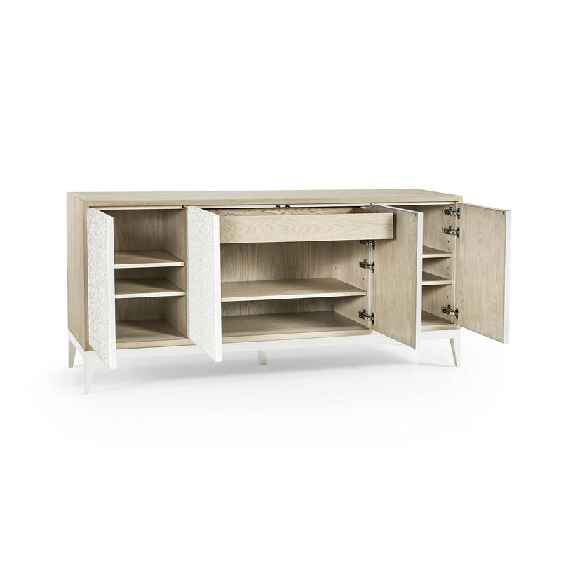 Embodying a meeting point of nature and design, the Jonathan Charles Pelagic credenza showcases a rich blend of refined artistic techniques and organic textures for a visually inspiring display of craftsmanship. A fossilized coral pattern, intricately sculpted on its doors and set against a bleached oak frame, redefines raw beauty with striking depth and texture. Four touch-latch doors, adjustable shelving, and a center pull-out drawer offer effortless functionality and storage. Perfect for tropical-inspired interiors, Pelagic is a statement-making addition to coastal living spaces and hallways.