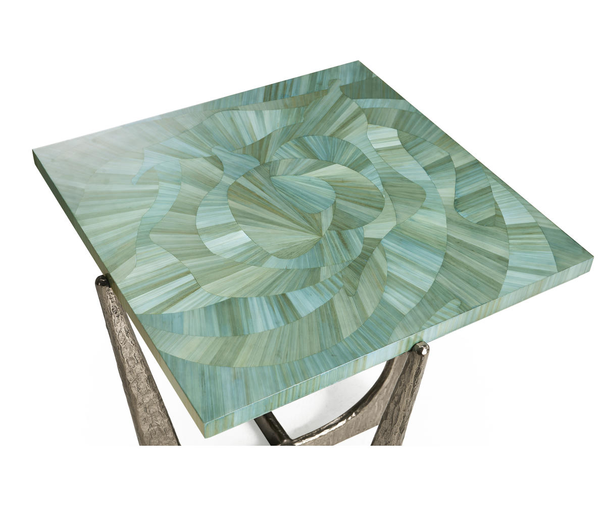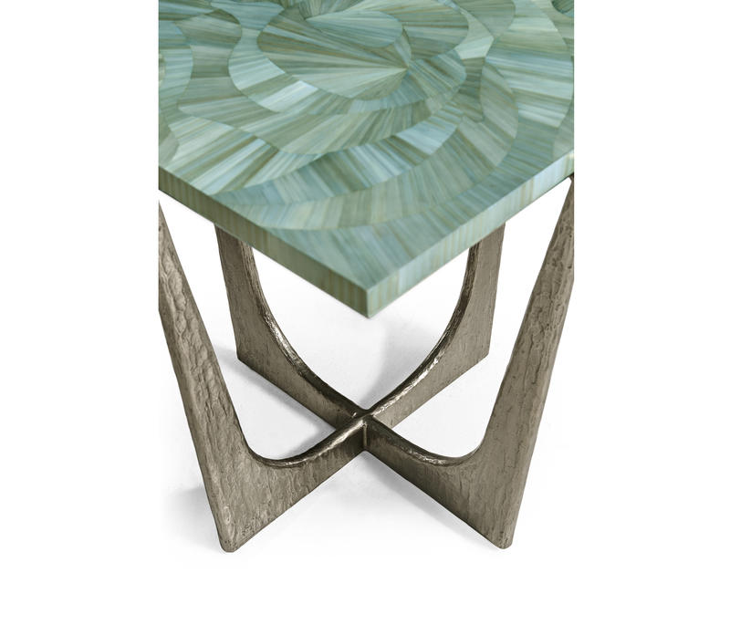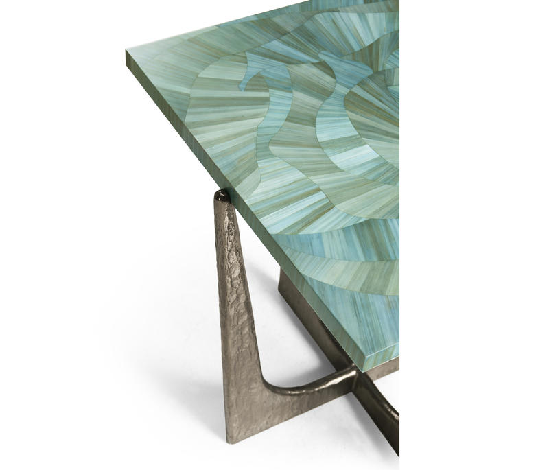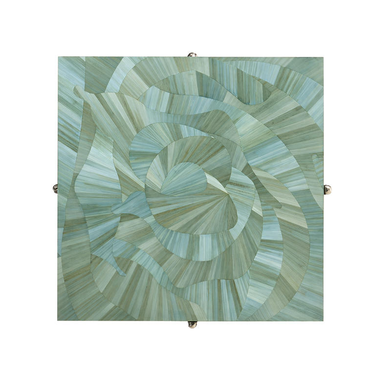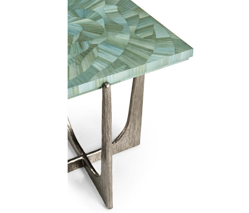 Introducing the Sea Glass End Table, a captivating accent piece that embodies coastal elegance and artisanal craftsmanship. With a square 14-inch top, this table is adorned with intricate hand applied straw marquetry, reminiscent of the gentle undulations of ocean waves. Dyed in tonal blue hues, the straw art is protected with a lacquered finish. The curved base is made from wax-cast stainless steel with added texture to compliment the impeccable artisan work on the table top.