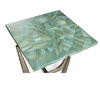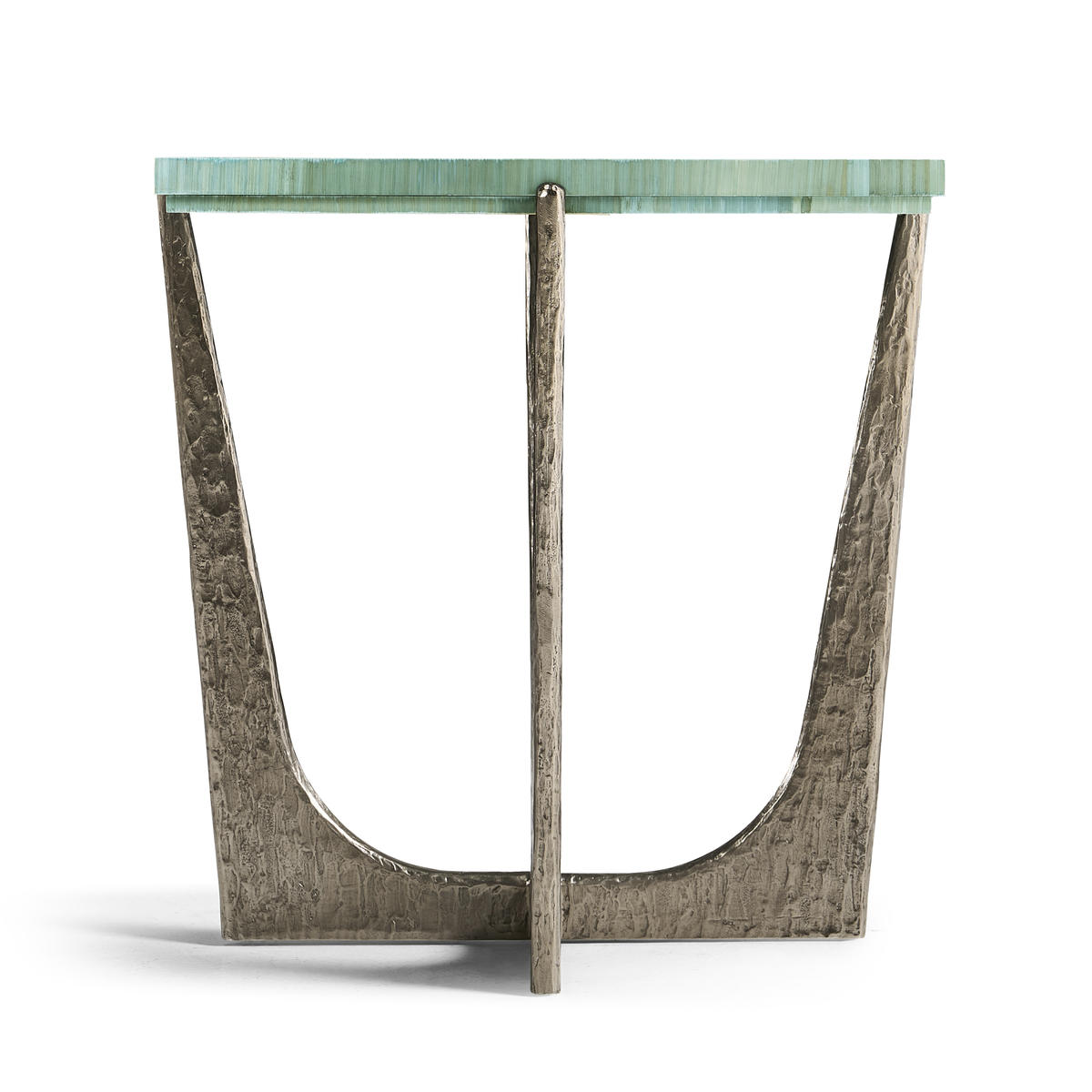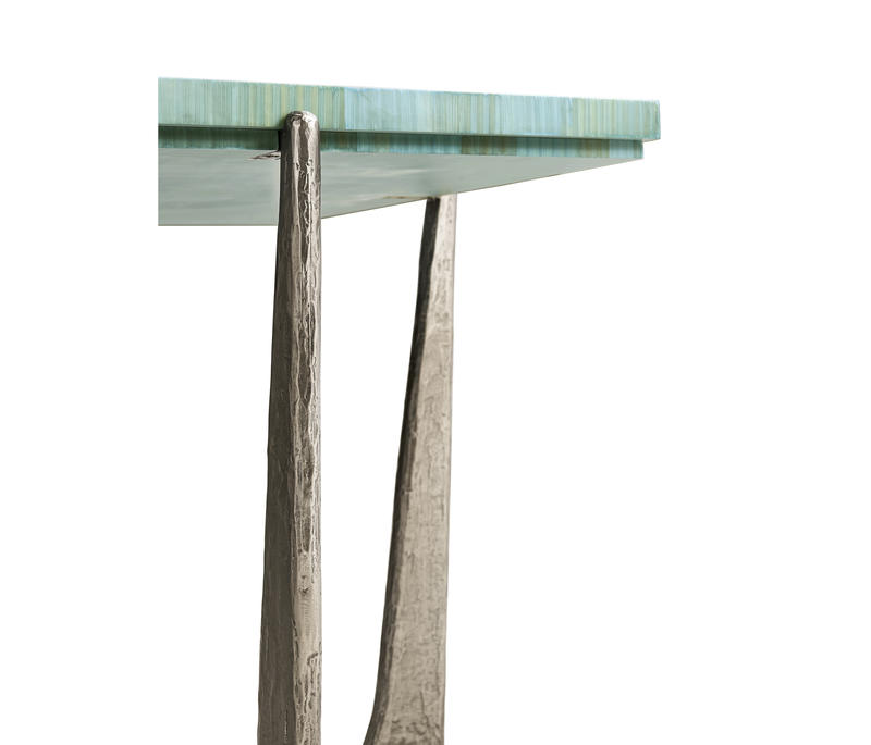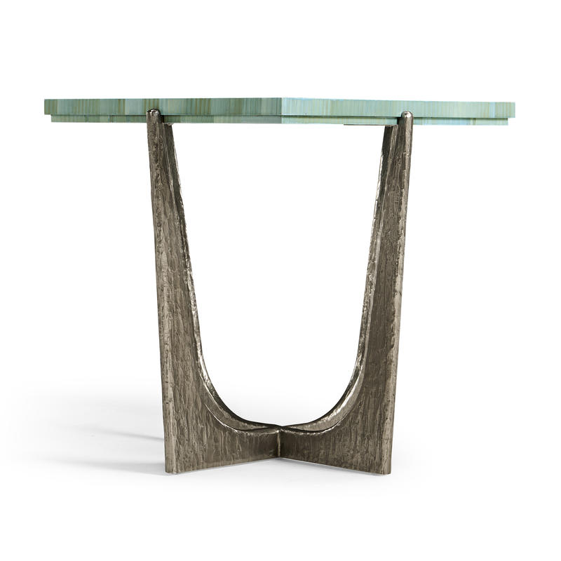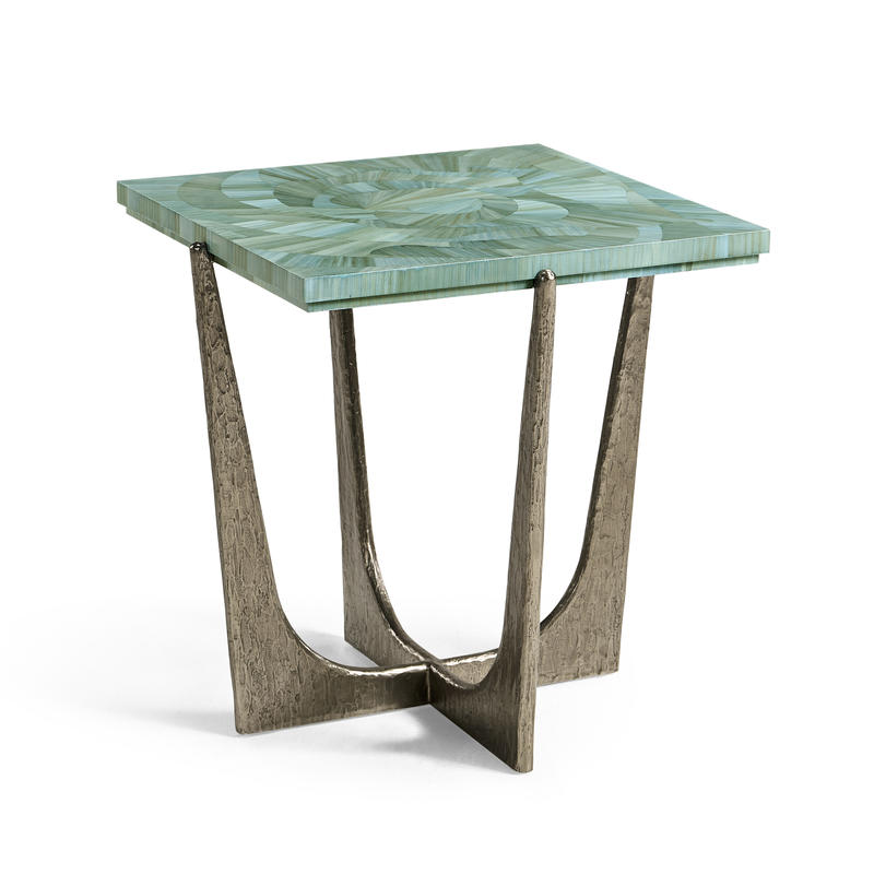 Introducing the Sea Glass End Table, a captivating accent piece that embodies coastal elegance and artisanal craftsmanship. With a square 14-inch top, this table is adorned with intricate hand applied straw marquetry, reminiscent of the gentle undulations of ocean waves. Dyed in tonal blue hues, the straw art is protected with a lacquered finish. The curved base is made from wax-cast stainless steel with added texture to compliment the impeccable artisan work on the table top.