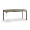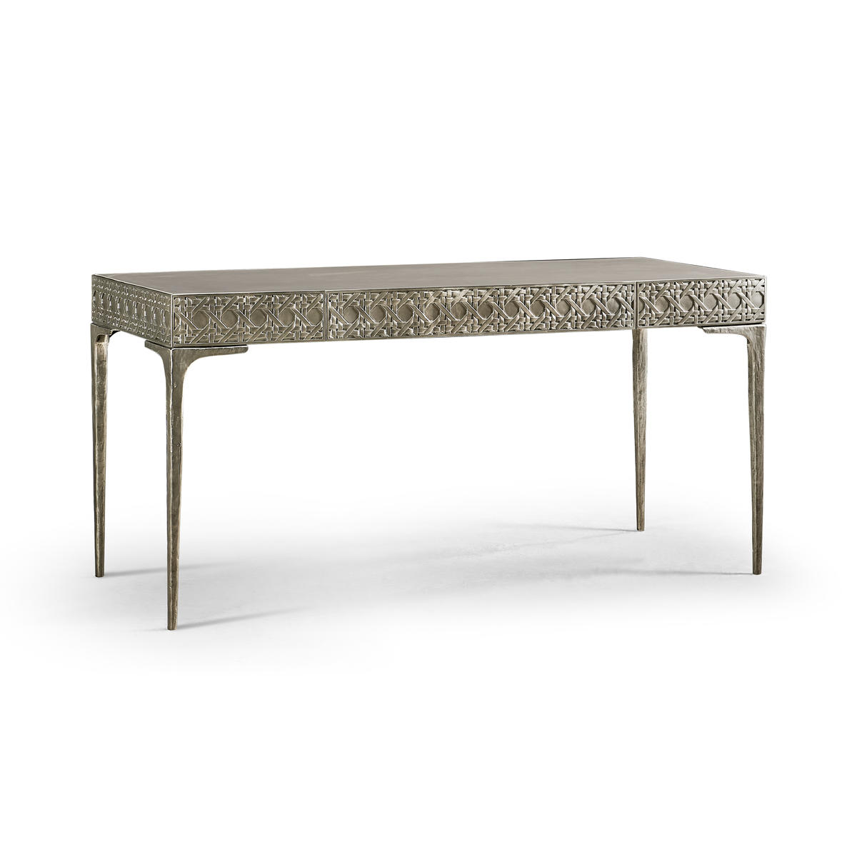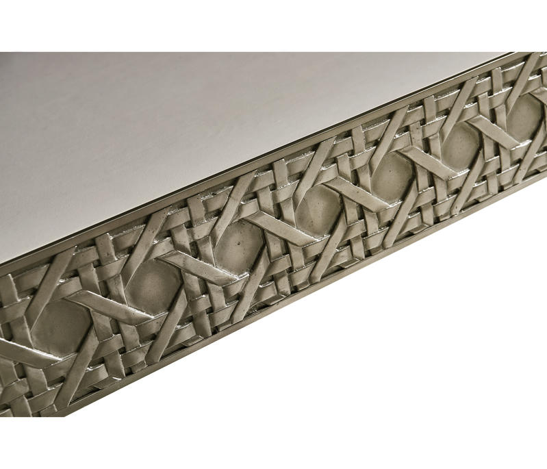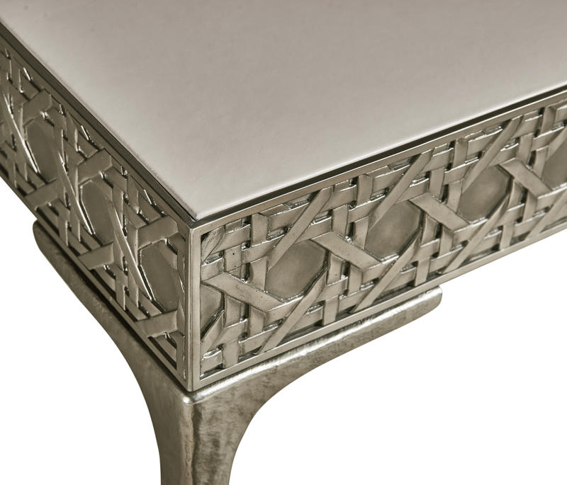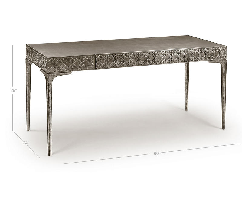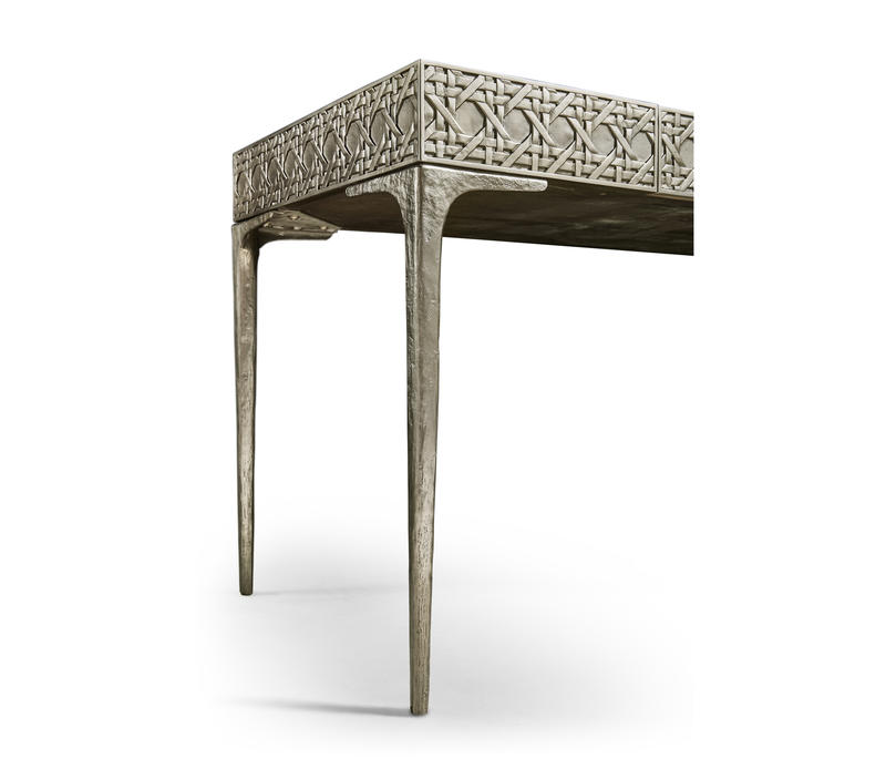 Featuring a digitally carved, traditional woven cane design, the Cnoidal carved metal desk boasts mesmerizing textural layers. The carved aluminum case is paired flawlessly with a drop-in Leather top and organically textured stainless steel legs, dramatically tapered and finished in satin white brass. With an interior drawer lined in luscious Moore & Giles Hudson white smoke leather, the Cnoidal desk is a sophisticated and functional piece with notes of contemporary design and tropical aesthetics.