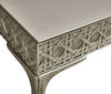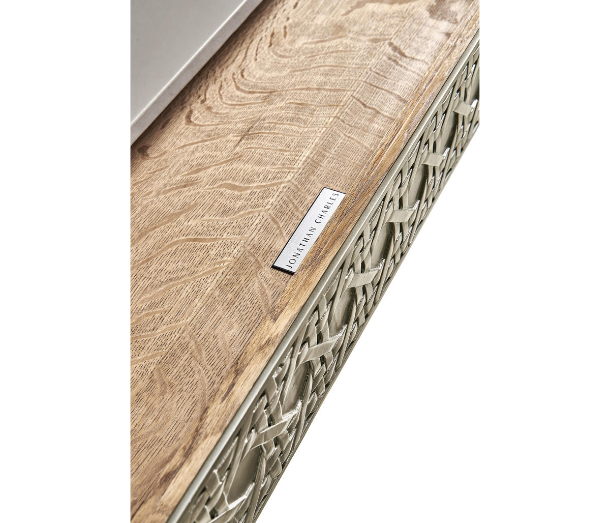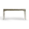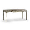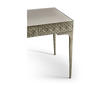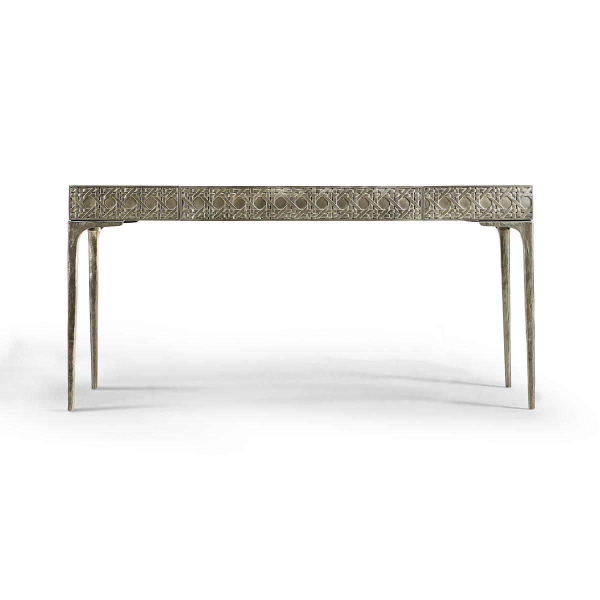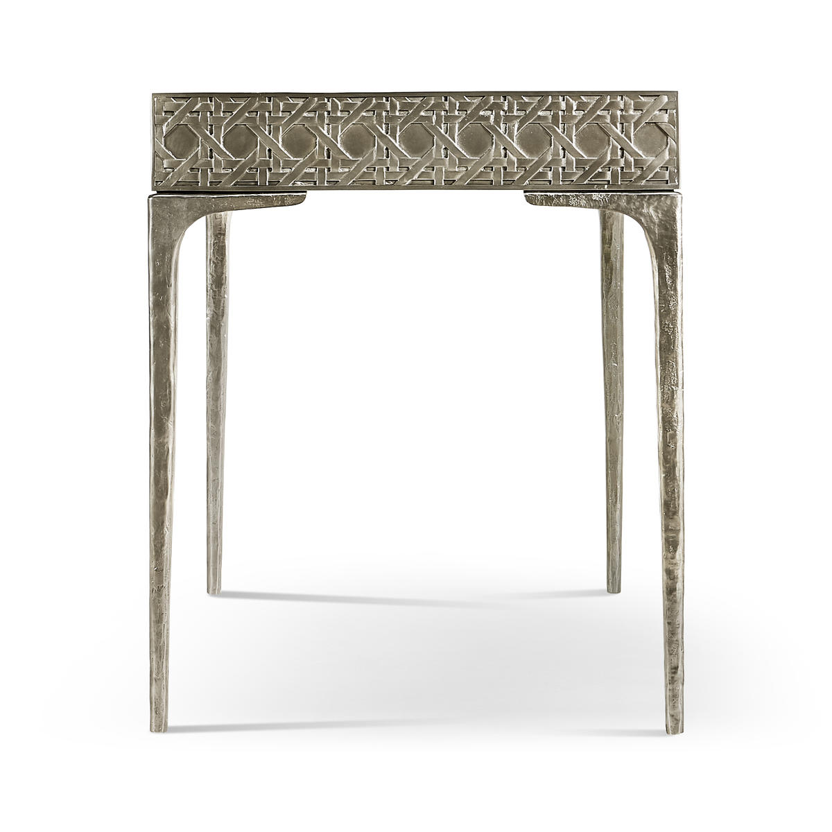 Featuring a digitally carved, traditional woven cane design, the Cnoidal carved metal desk boasts mesmerizing textural layers. The carved aluminum case is paired flawlessly with a drop-in Leather top and organically textured stainless steel legs, dramatically tapered and finished in satin white brass. With an interior drawer lined in luscious Moore & Giles Hudson white smoke leather, the Cnoidal desk is a sophisticated and functional piece with notes of contemporary design and tropical aesthetics.