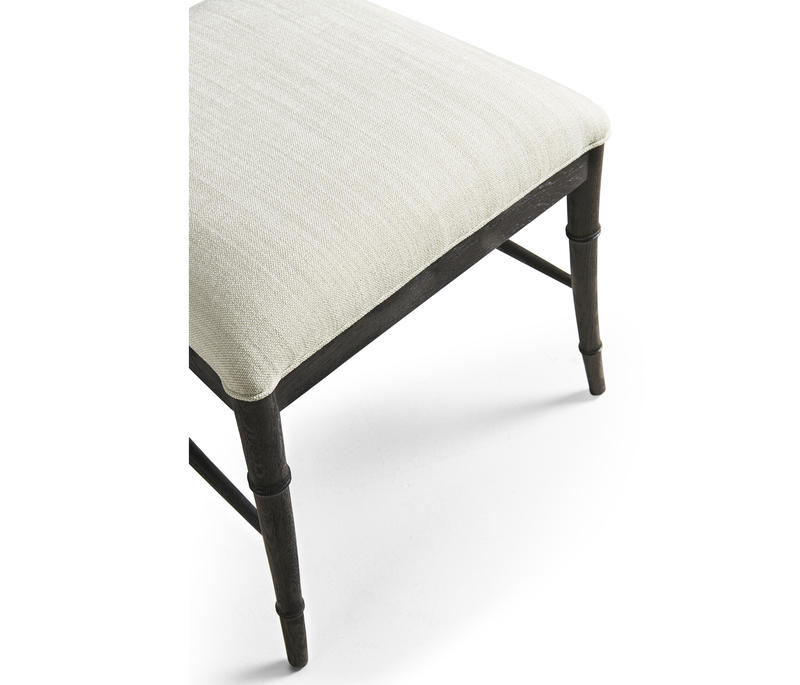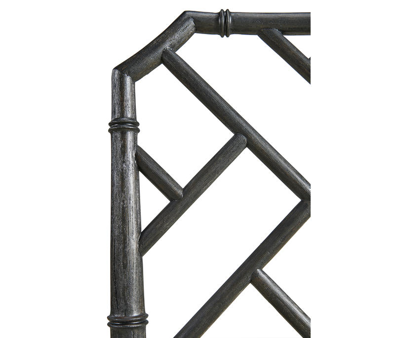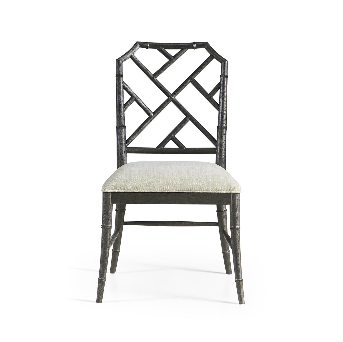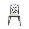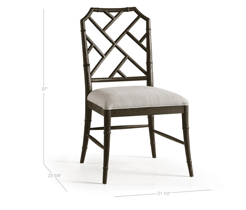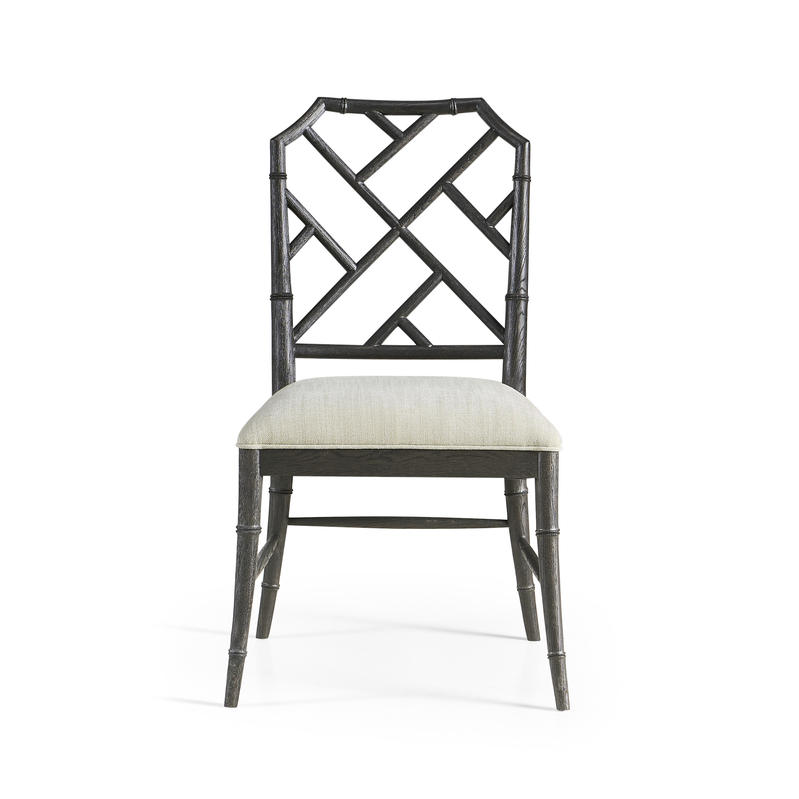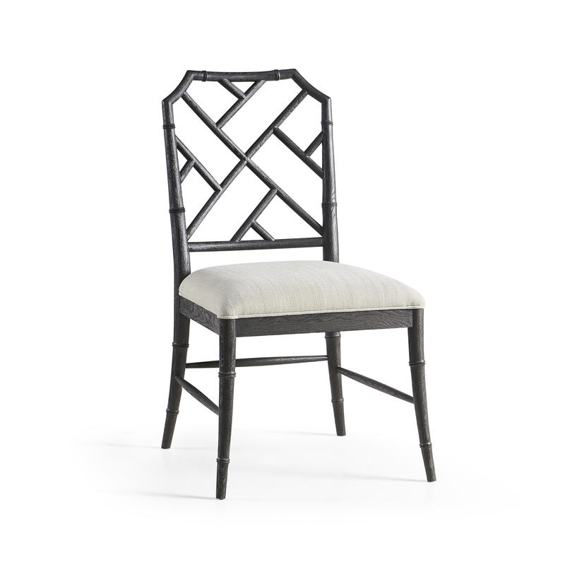 Created by the masterful Jonathan Charles craftsmen and women, the Saros Chippendale bamboo side chair is a fresh and zany take on timeless design. A geometric design lattice back formed out of bamboo is finished in deliciously dry ebonized black with light distressing to create a masterful showstopper. Upholstered in earthy oatmeal performance fabric, the Saros chair adds comfort and intrigue to refined dining spaces.