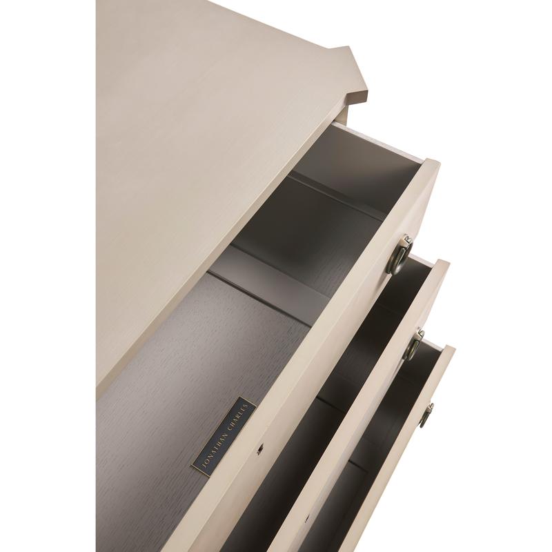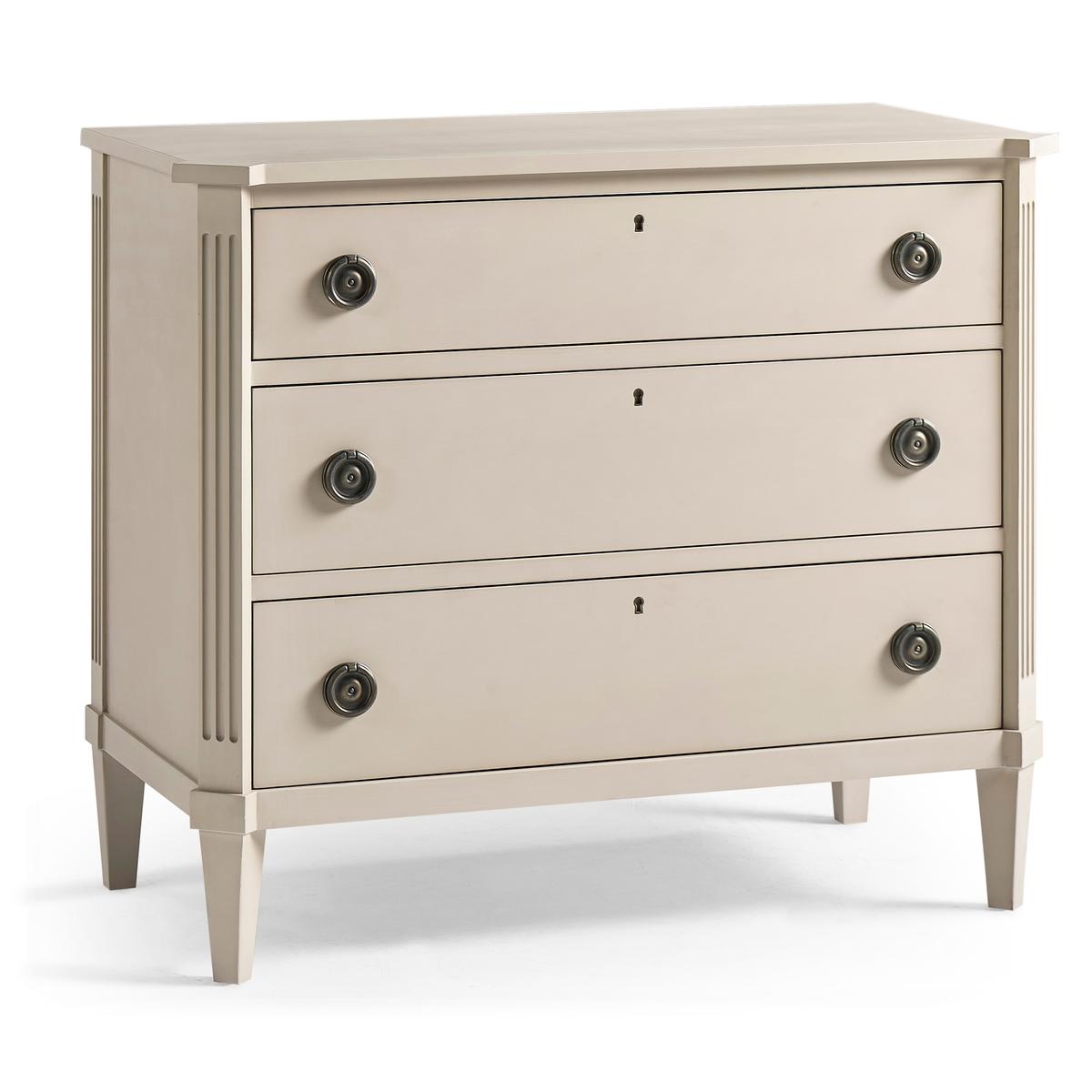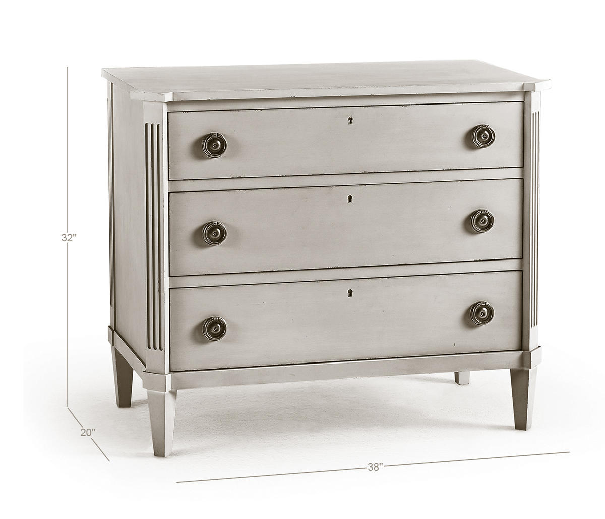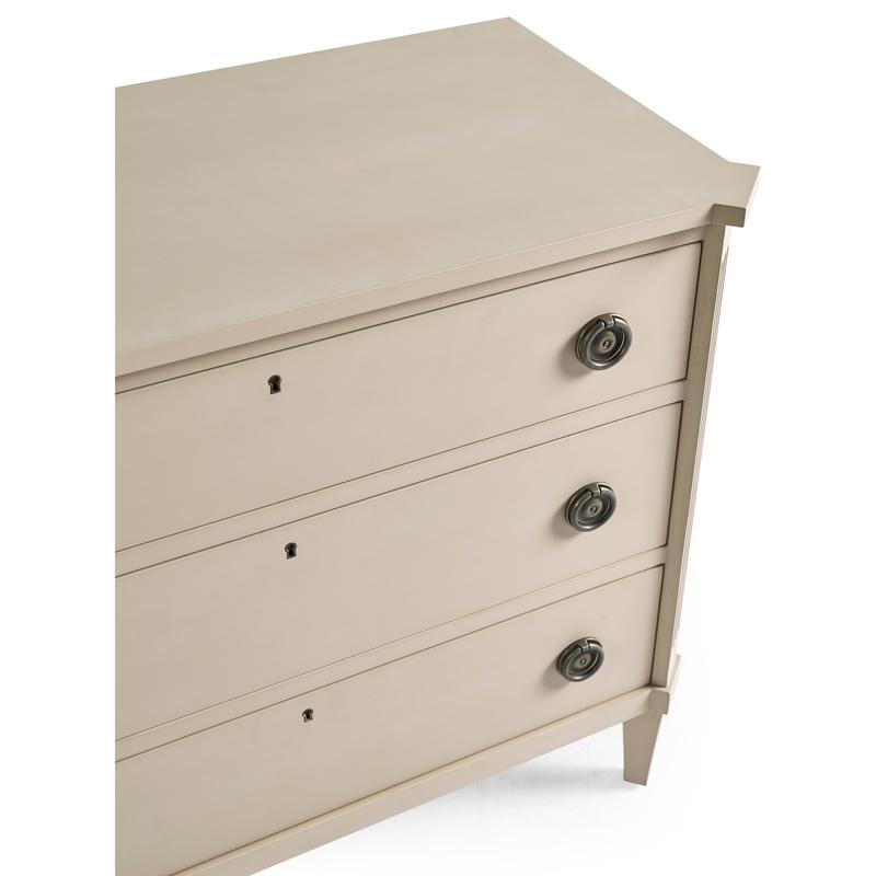 Designed to the highest degree of craftsmanship and attention to detail, Jonathan Charles’ Aeon drawer chest embodies Swedish country charm. Front columns featuring clean lines in a traditional style are offset at an angle between 3 lockable drawers for a hint of contemporary design. Custom cast hardware in aged bronze compliments a painted grey finish in London Mist for an elegant worn look.