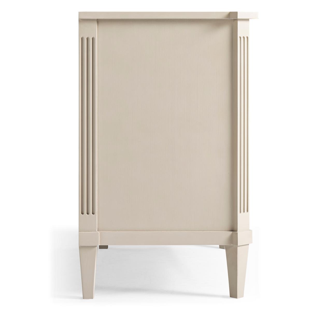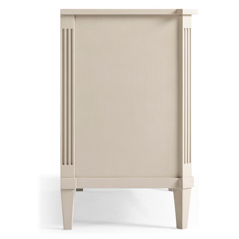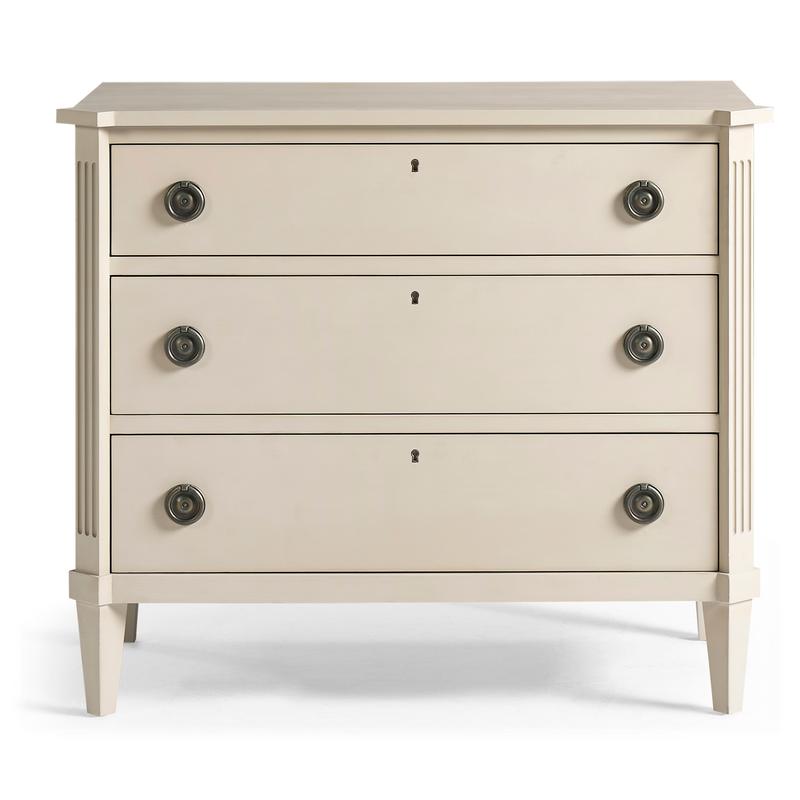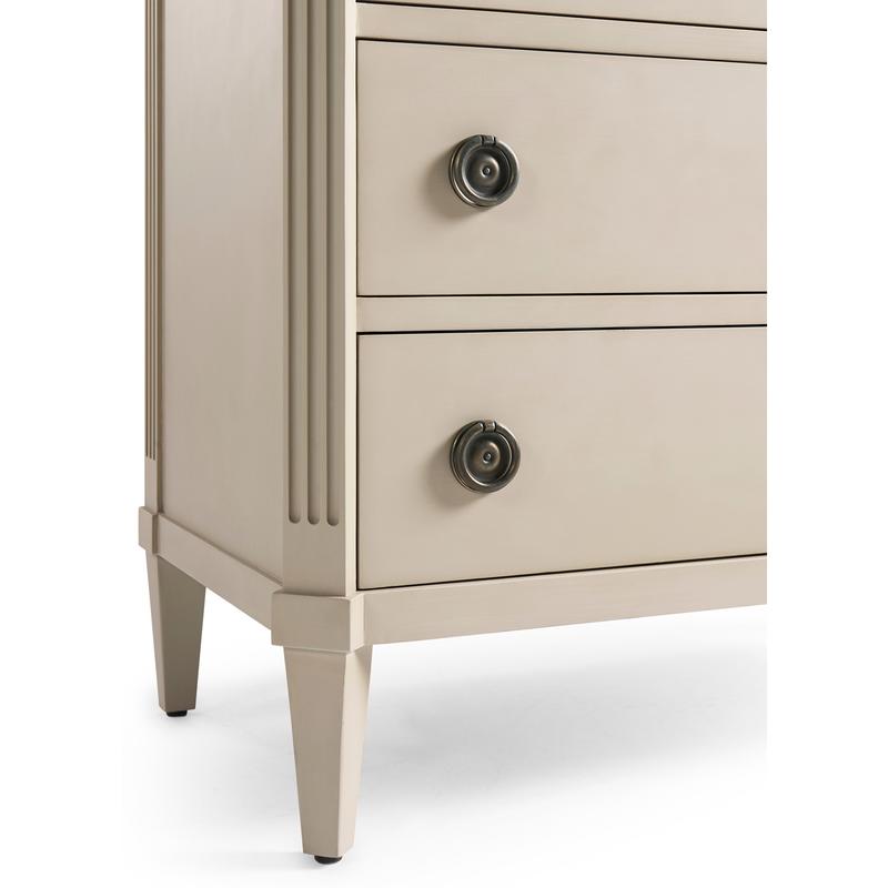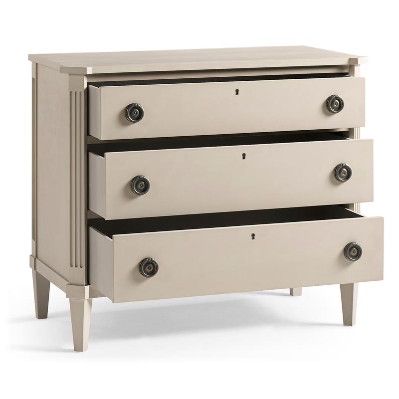 Designed to the highest degree of craftsmanship and attention to detail, Jonathan Charles’ Aeon drawer chest embodies Swedish country charm. Front columns featuring clean lines in a traditional style are offset at an angle between 3 lockable drawers for a hint of contemporary design. Custom cast hardware in aged bronze compliments a painted grey finish in London Mist for an elegant worn look.