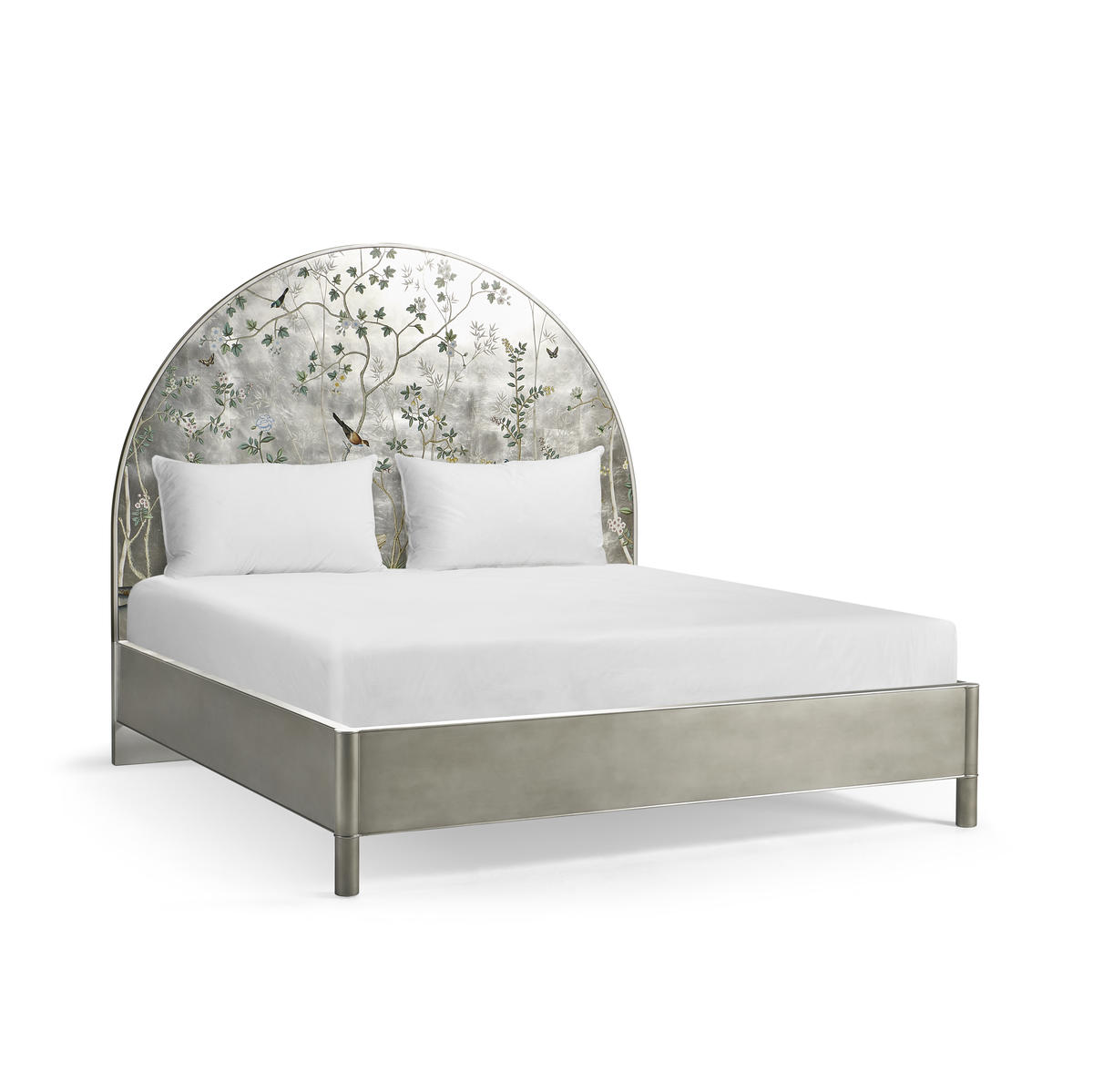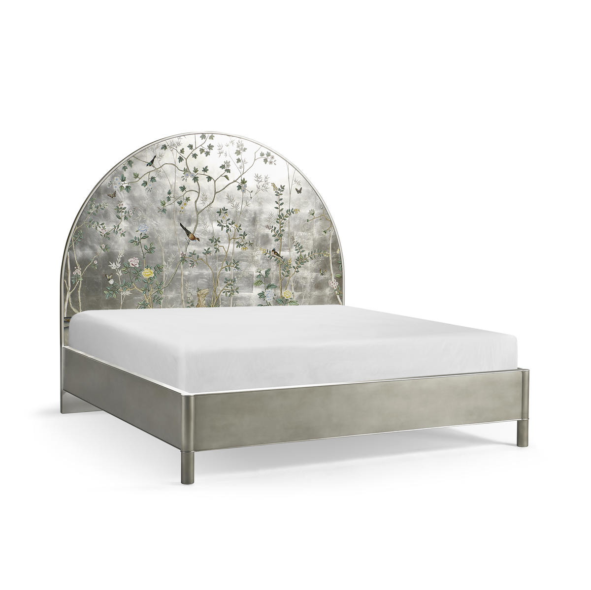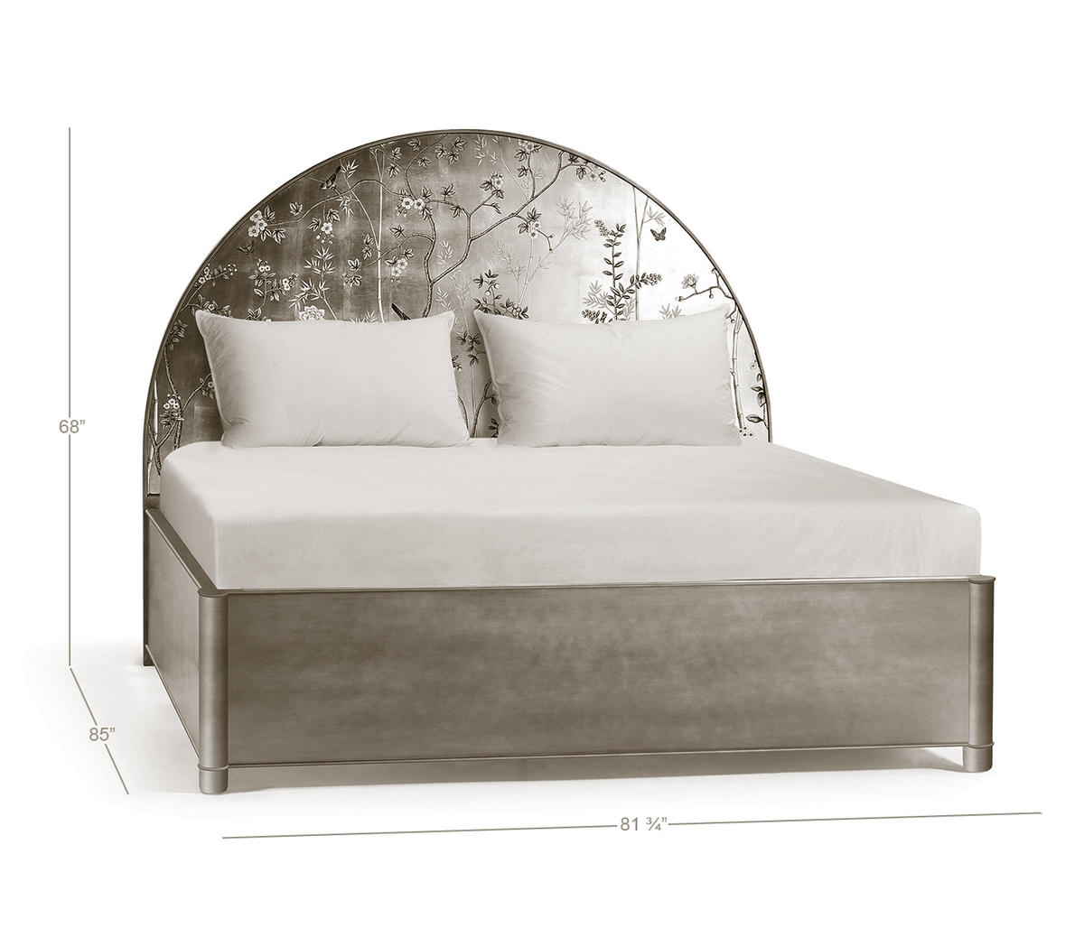 The Shimmering Moon half moon panel bed from Jonathan Charles’ esteemed Serene portfolio is the pinnacle of ornamental expression. Hand painted nature scenes dance across a blanket of glistening silver leaf in a masterful display of luminosity and depth that ignites fascination and draws the eye from across the room. Finished in lacquered white dove, the solid beech wood frame built by Jonathan Charles’ world-renowned craftsmen and women possesses the long lasting value and quality construction characteristic of heirloom antiques. A unique and cherished statement piece, Shimmering Moon will serve as an enchanting presence for generations.