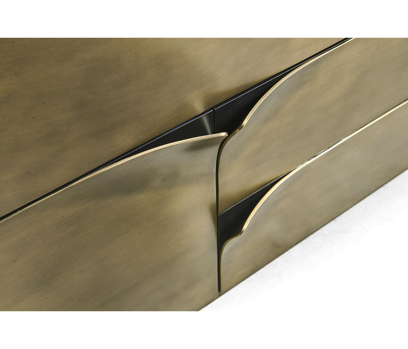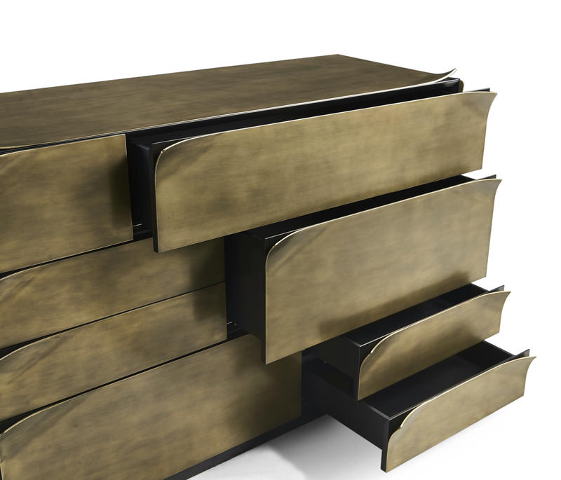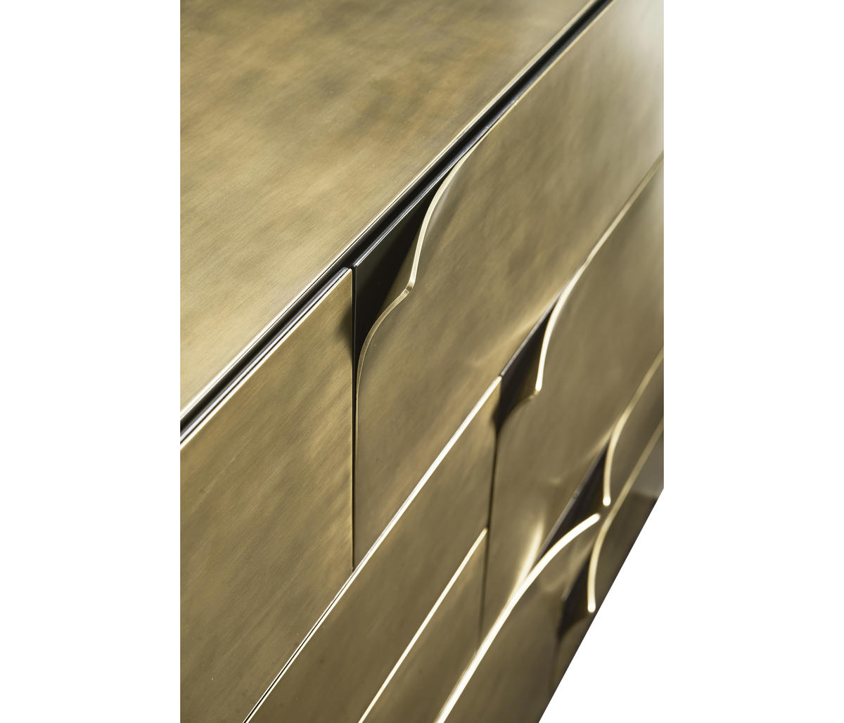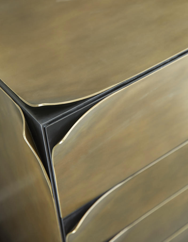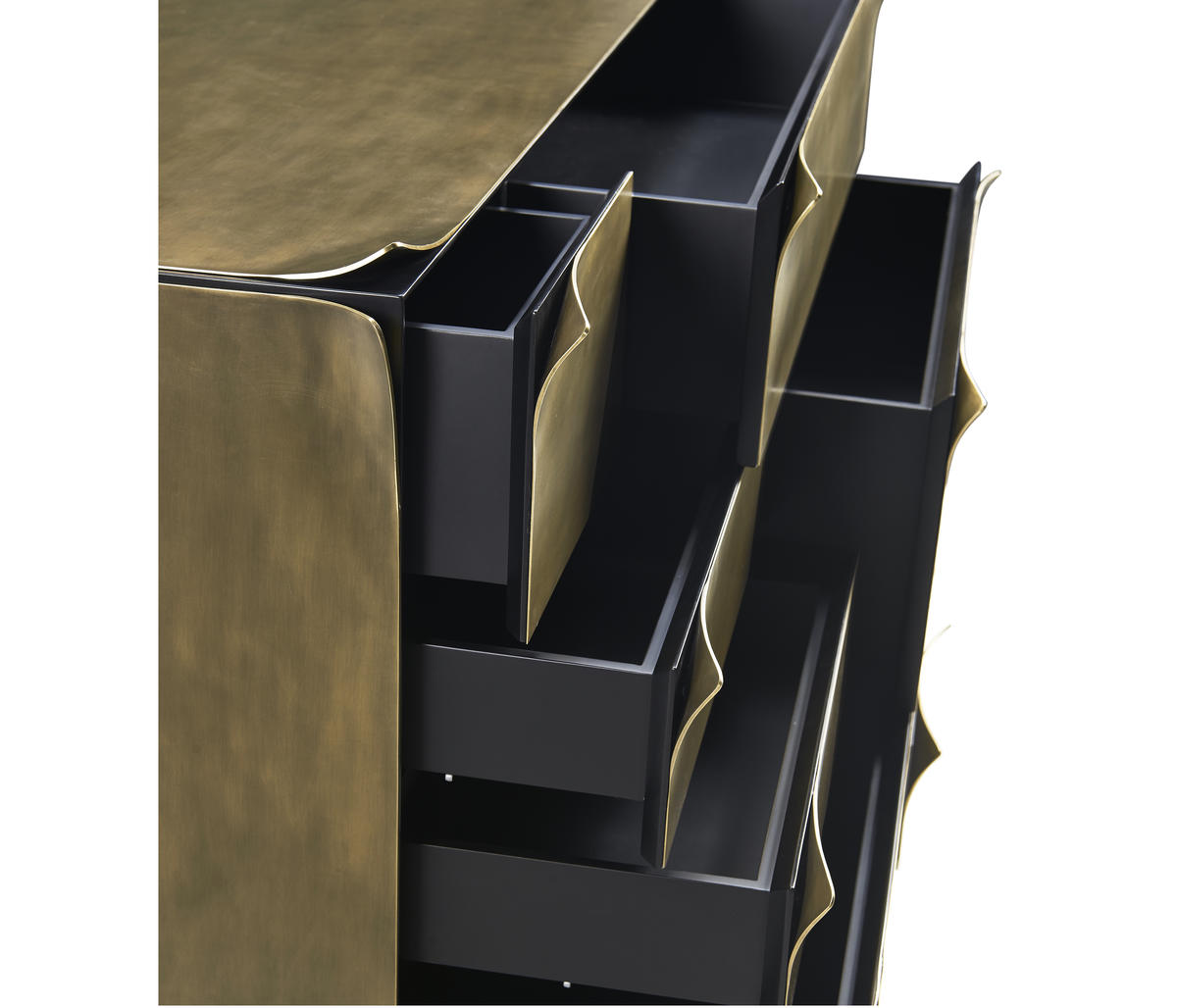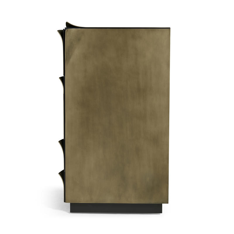 The Hammersmith Drawer Chest is a striking blend of bold design and sleek elegance. Its structure, encased in brass sheets bent at the edges, creates a unique sense of dimension and depth. This sophisticated detail enhances the chest’s modern appeal, making it a luxurious focal point in any space. Featuring soft-close drawers, the Hammersmith Drawer Chest exudes refined style and architectural presence while offering both beauty and functionality. Whether placed in a bedroom or living area, it elevates your space with effortless sophistication.