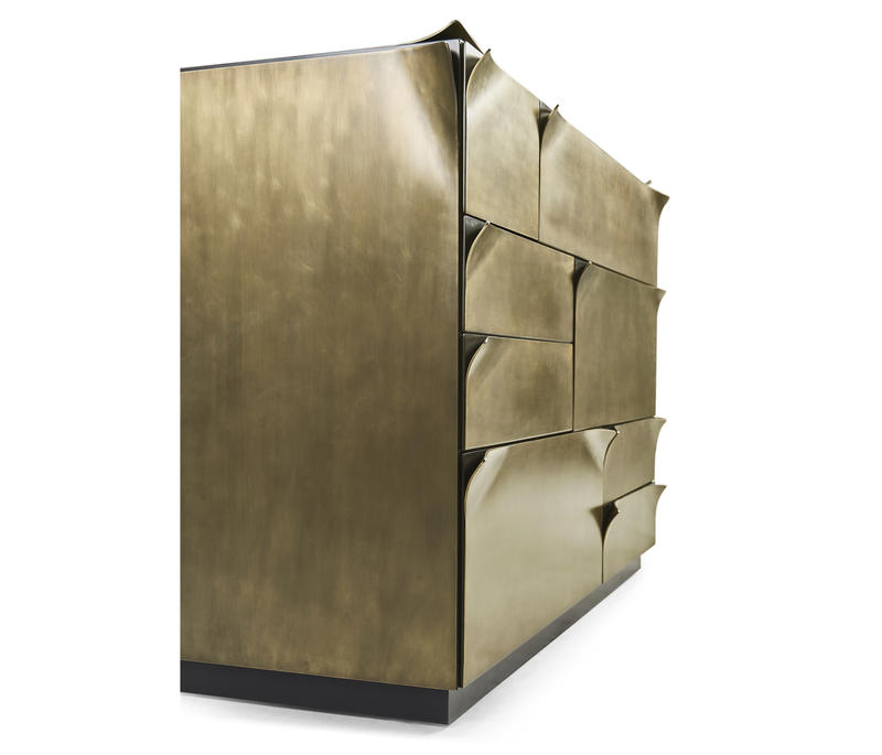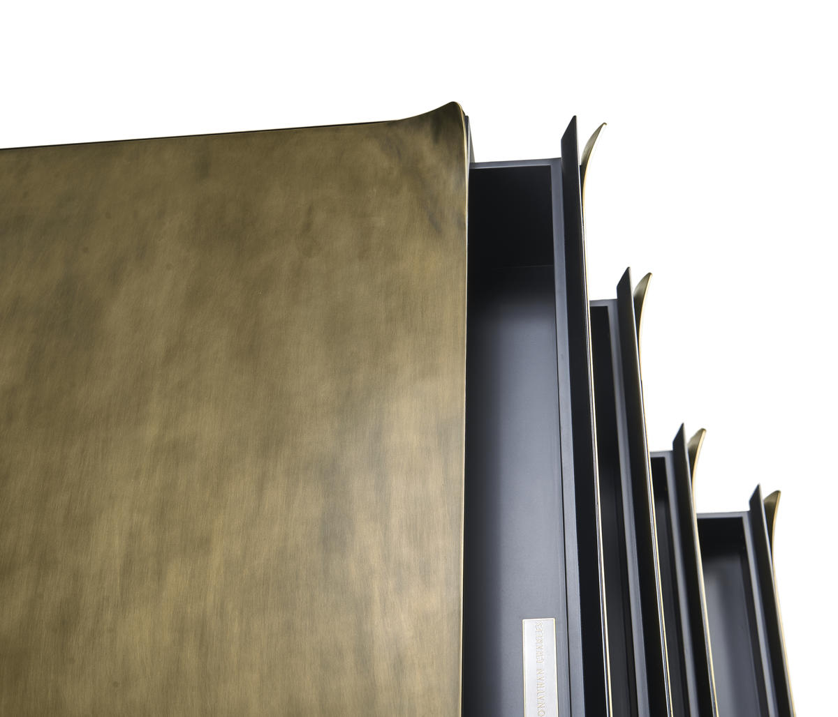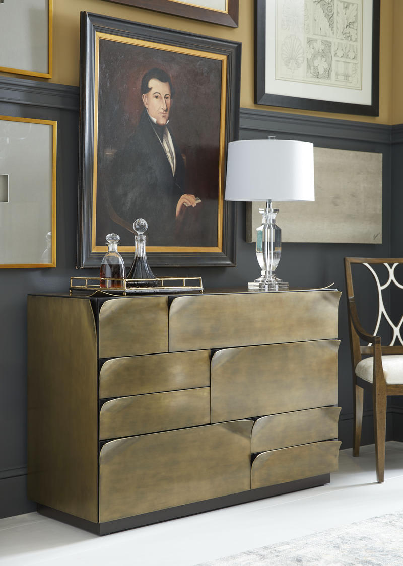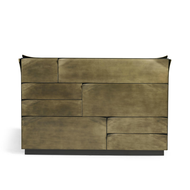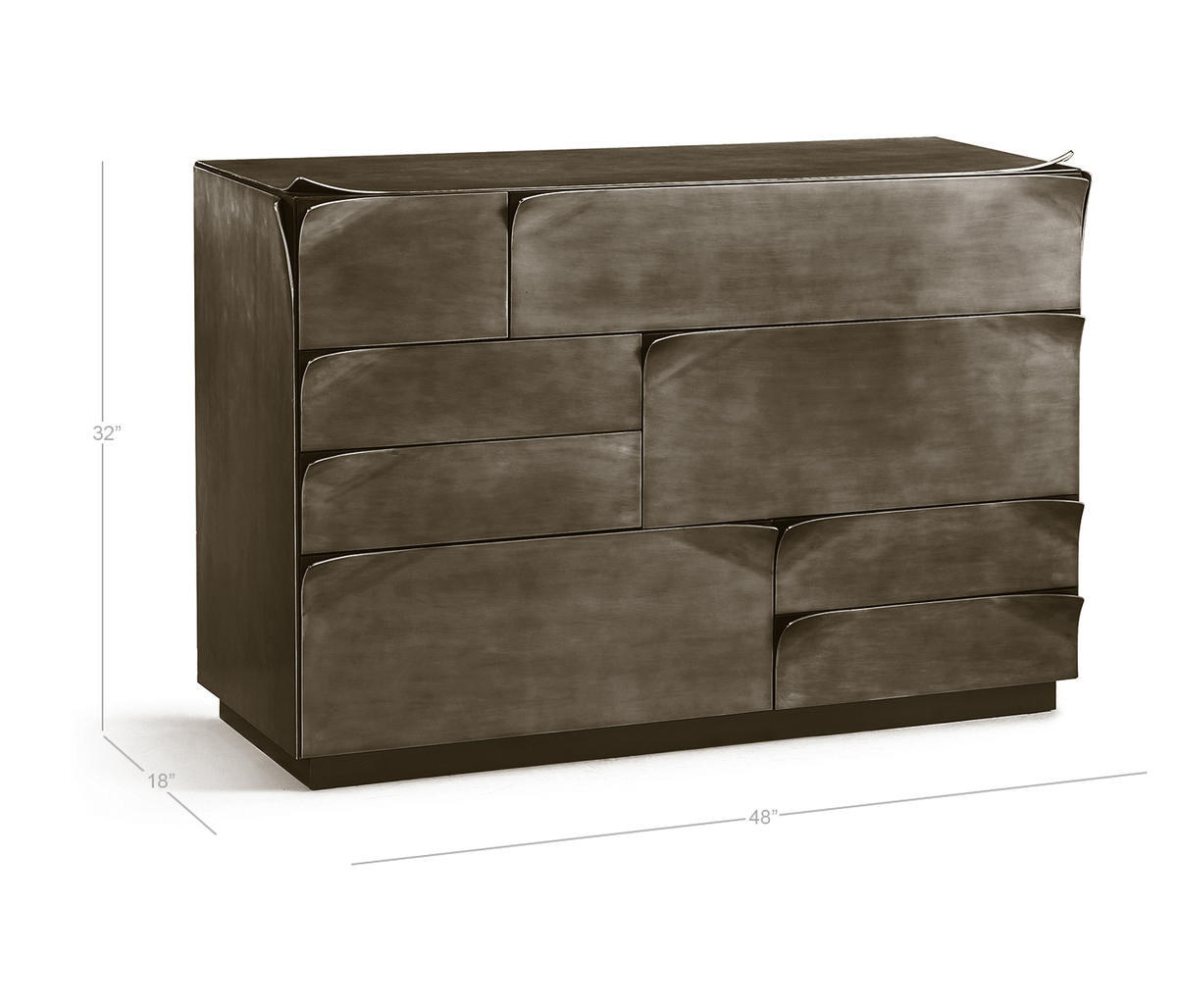 The Hammersmith Drawer Chest is a striking blend of bold design and sleek elegance. Its structure, encased in brass sheets bent at the edges, creates a unique sense of dimension and depth. This sophisticated detail enhances the chest’s modern appeal, making it a luxurious focal point in any space. Featuring soft-close drawers, the Hammersmith Drawer Chest exudes refined style and architectural presence while offering both beauty and functionality. Whether placed in a bedroom or living area, it elevates your space with effortless sophistication.