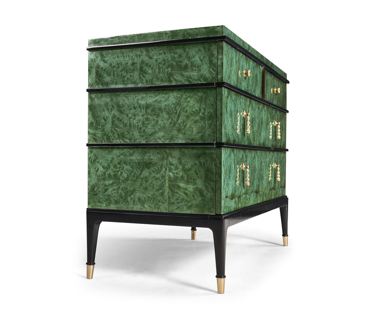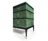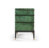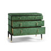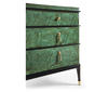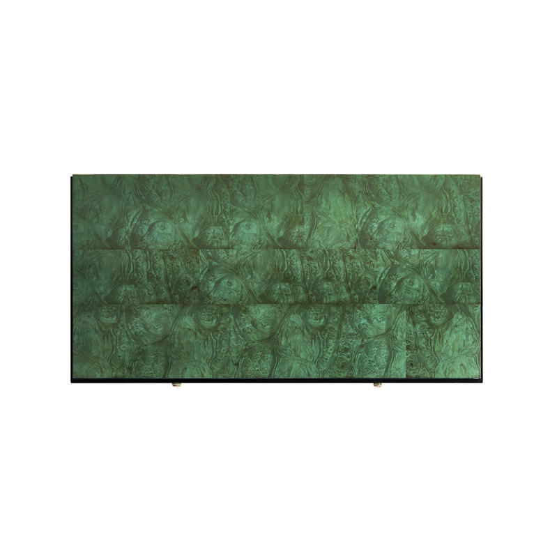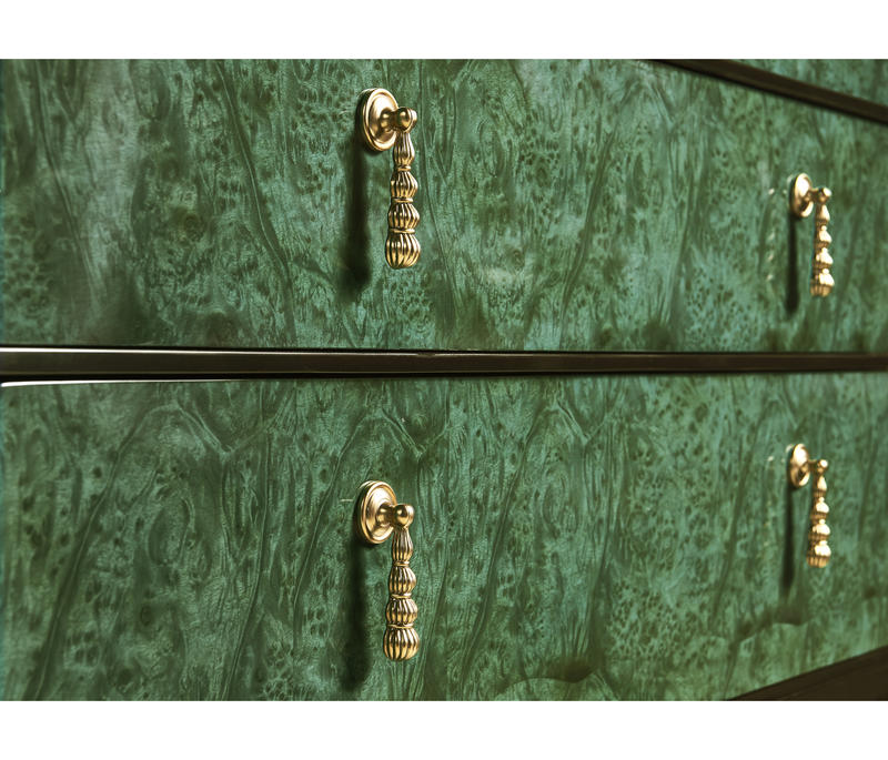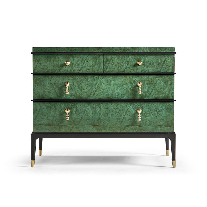Step into the world of modern design with the Jacques chest. Its clean lines, bold contrasts, and minimalist elements define its contemporary charm, making it a statement piece that seamlessly blends with contemporary interiors. Experience the allure of dyed burl veneer in a mesmerizing emerald finish. The hand-rubbed veneer adds a touch of opulence while highlighting the natural beauty of the wood's texture. This rich and vibrant hue draws attention and sets the tone for an environment of luxury. Brass accents not only enhance the aesthetics but also elevate the chest, giving it an air of elegance that complements its contemporary design.