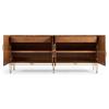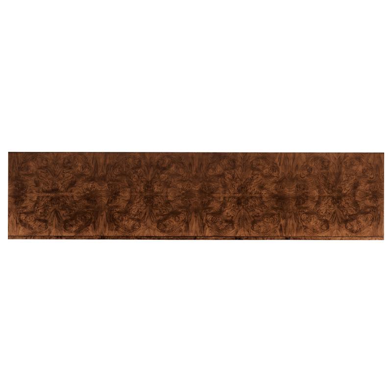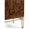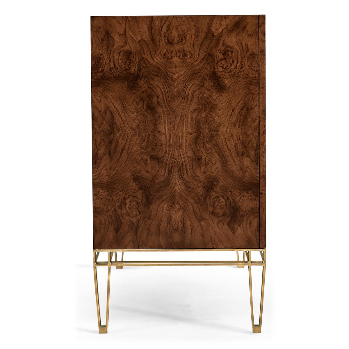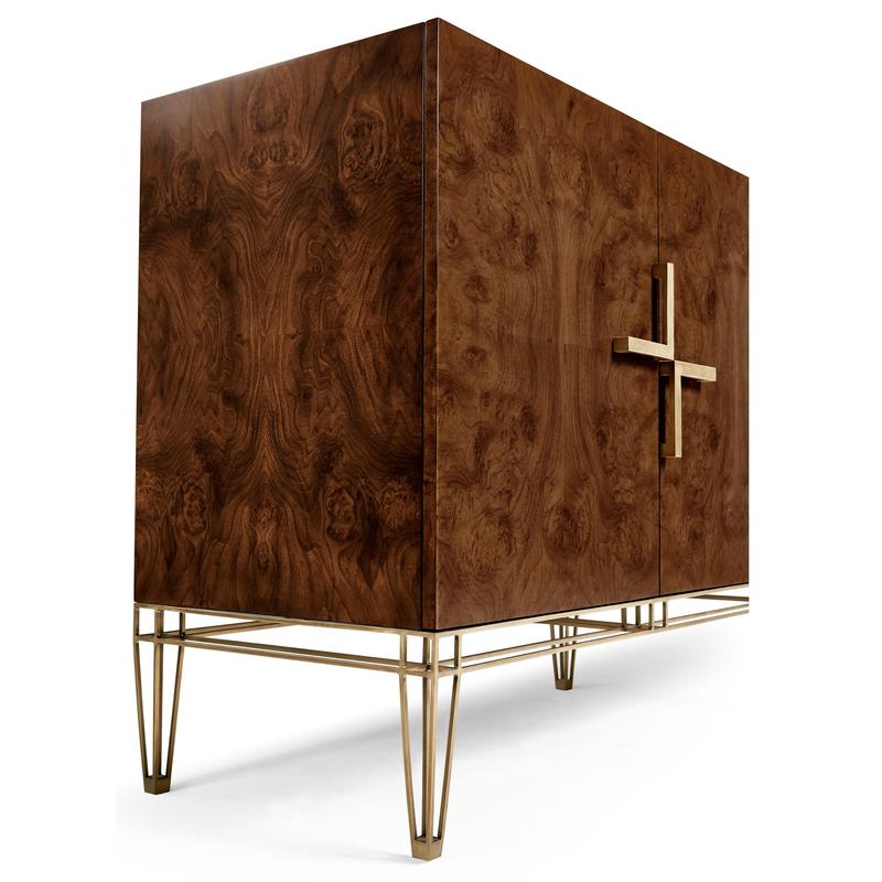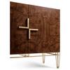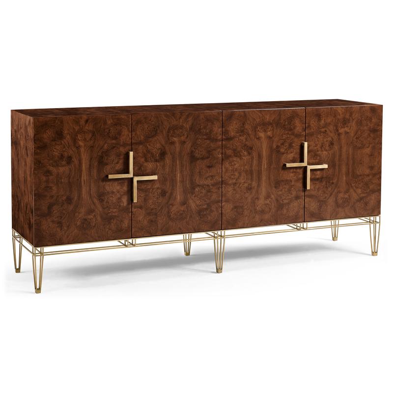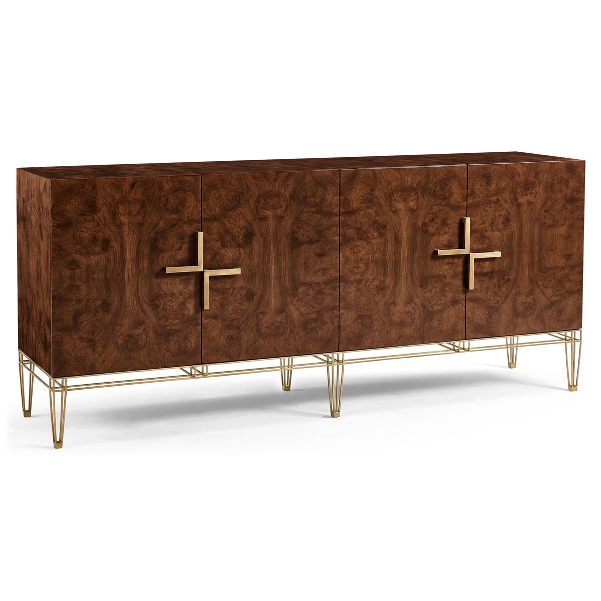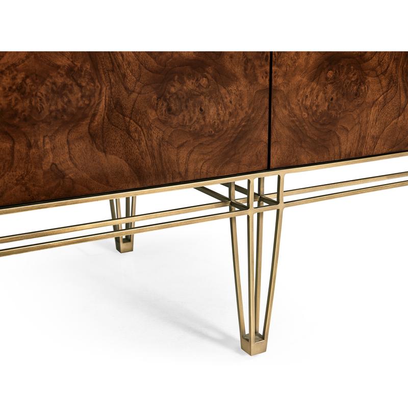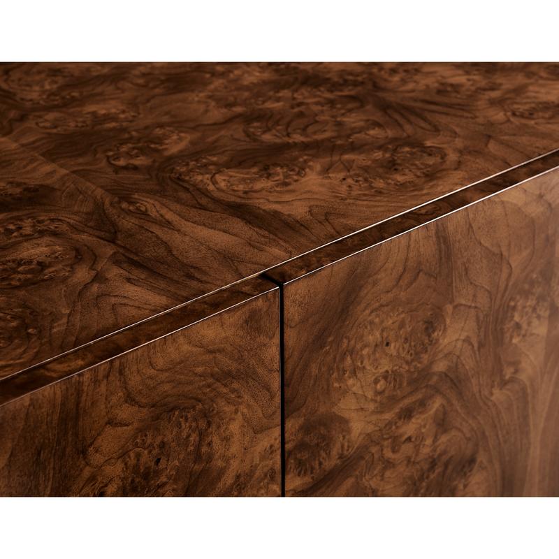 Experience the best of both worlds with the XO sideboard. Its ability to harmonize transitional charm and contemporary flair makes it an ideal addition to any room, offering a unique blend of elegance and modernity. Crafted from rich walnut burl veneers, this sideboard showcases the beauty of natural wood patterns. The stainless-steel exoskeleton base exudes modern sophistication, offering a sturdy foundation that complements the wood's warmth. The interior of this piece is designed for functionality and storage. Two drawers provide a designated spot for smaller items, while two adjustable shelves offer ample space for larger essentials.