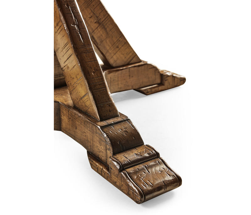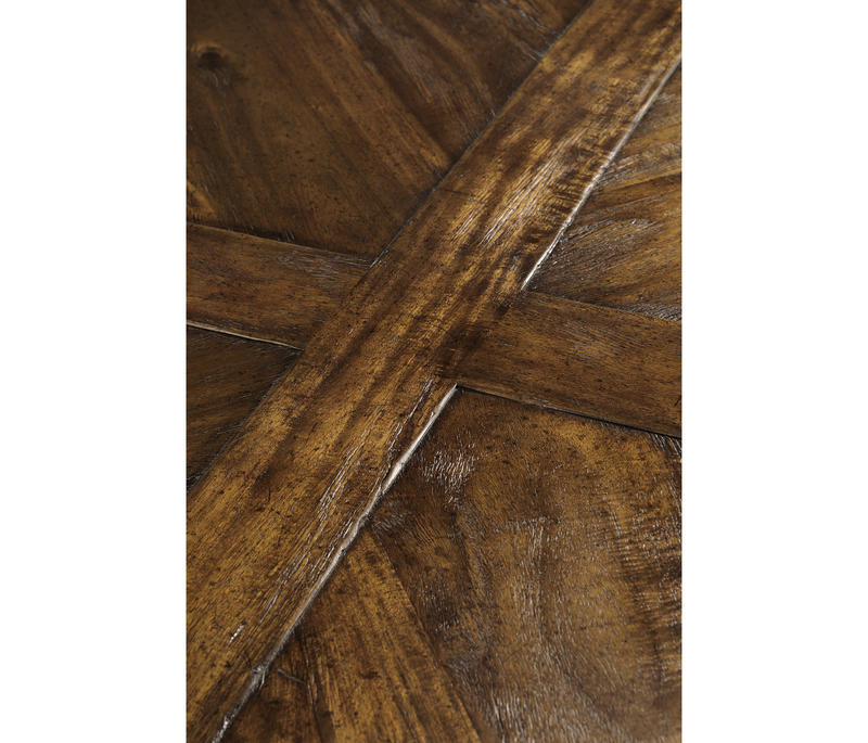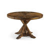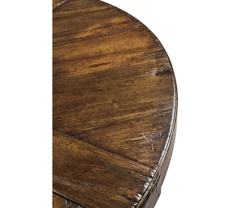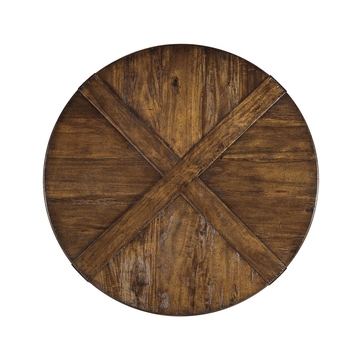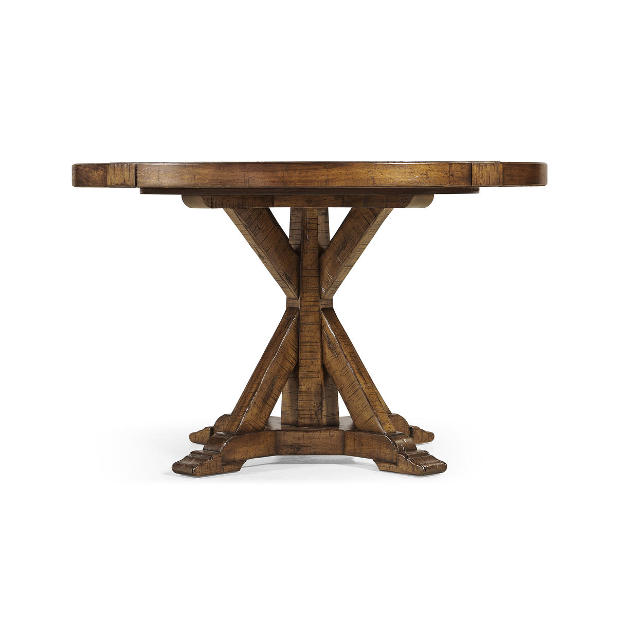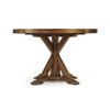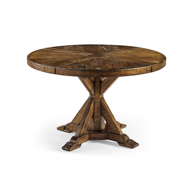 48" Solid country walnut topped circular dining table with a rustic finish showing exposed saw marks and set on a bracketed country living base. (Old salescode: 494621 & 491086-CFW)