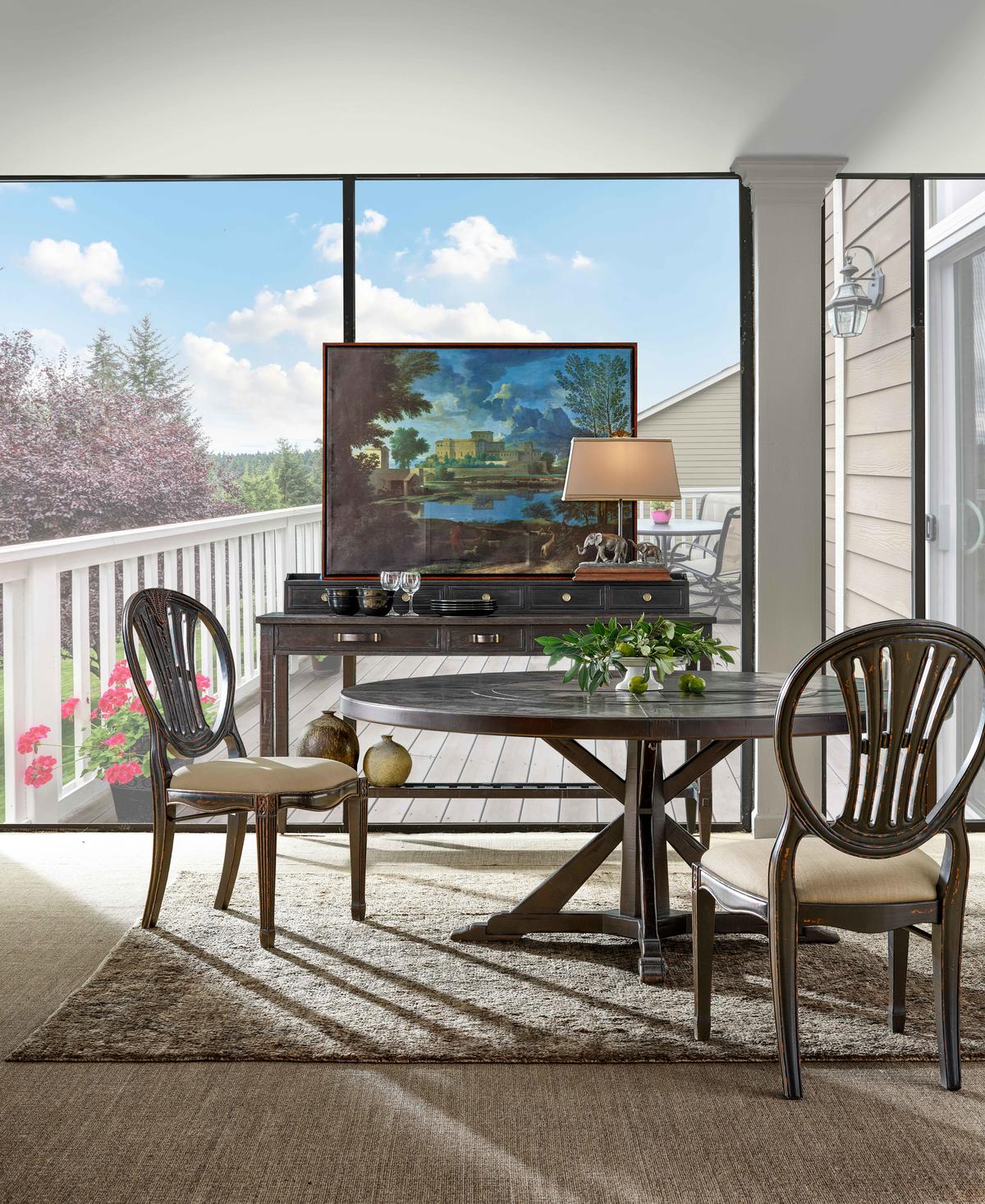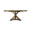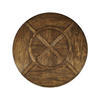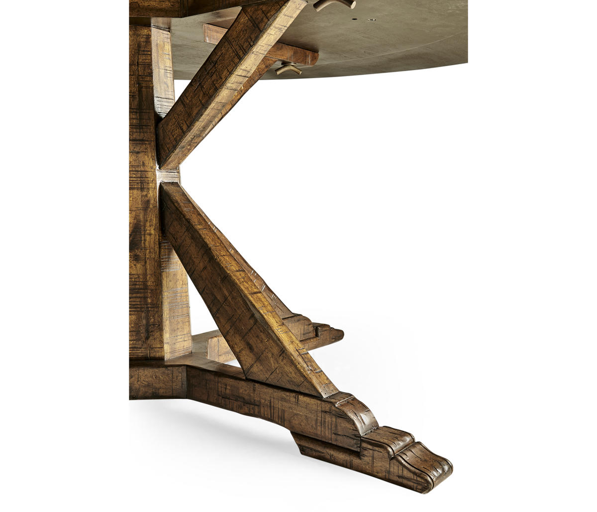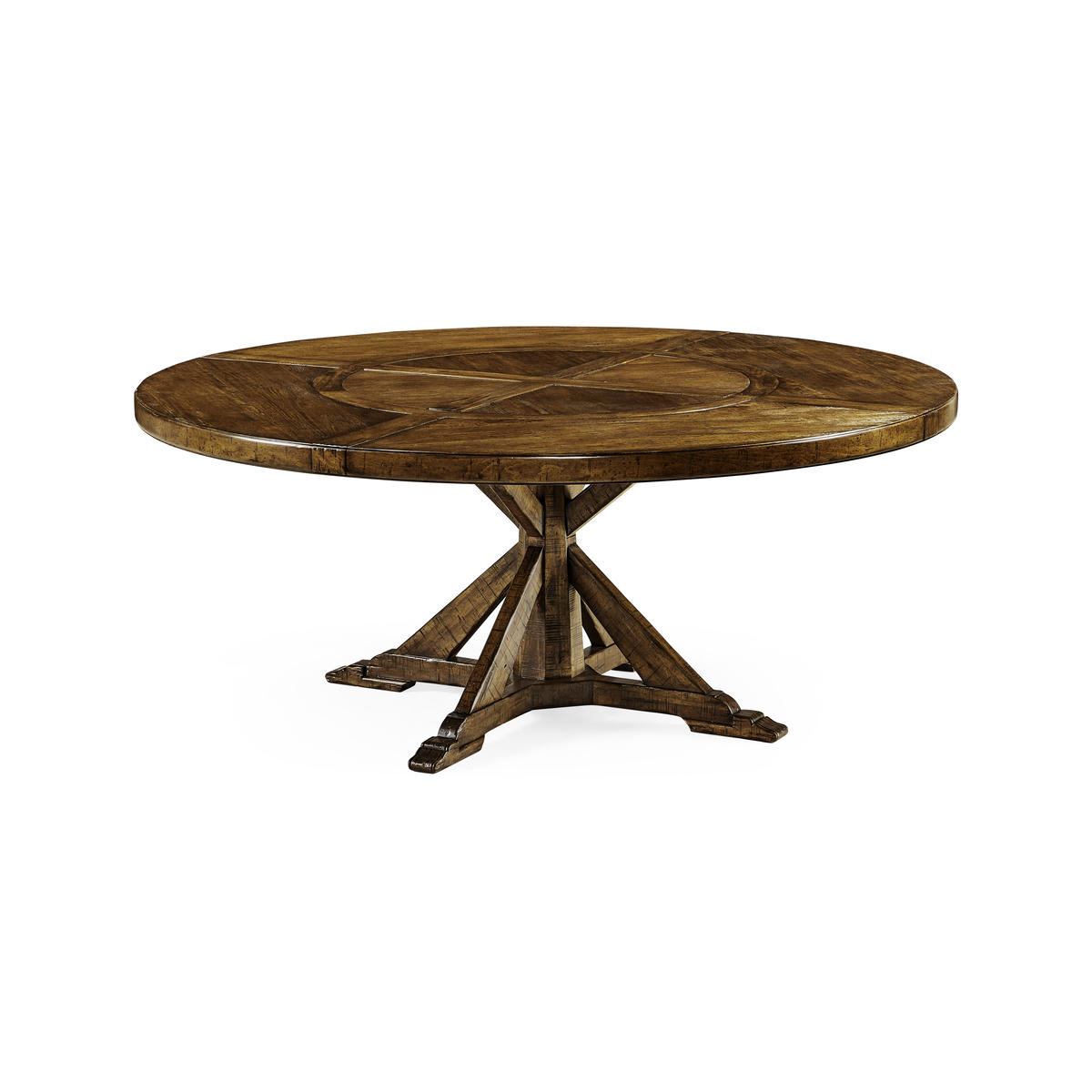 72" Solid walnut topped circular dining table with a rustic finish showing exposed saw marks and set on a bracketed country kitchen base, the table containing an ingenious mechanism of a self-storing lazy susan within. (Old salescode: 491089-CFW)