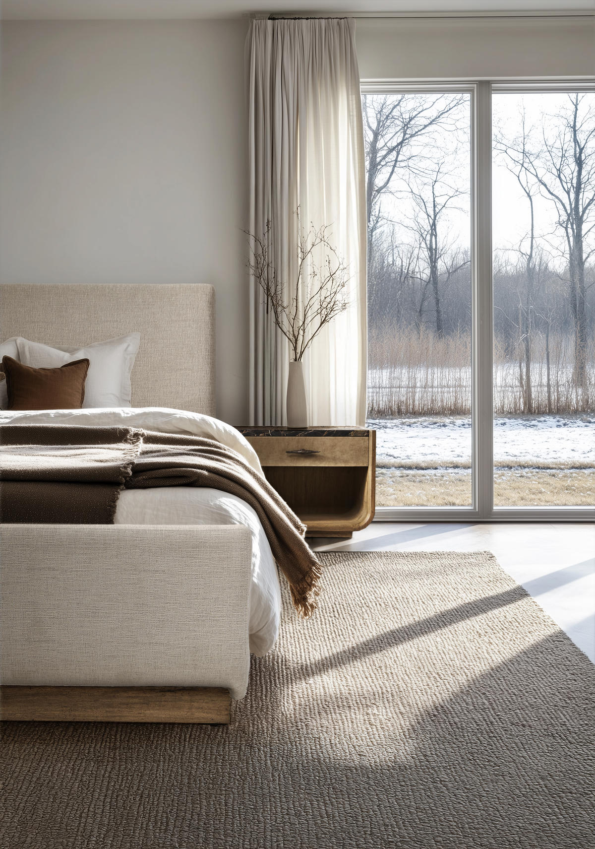 The Stone Ridge Upholstered Bed is where modern form meets rustic elegance. Its sleek, contemporary silhouette is beautifully complemented by rustic wood accents along the rails and footboard, finished in the warm tones of Tully Light Acacia. The upholstered headboard provides a luxurious contrast, blending comfort with a refined aesthetic. This bed is perfect for adding a touch of nature-inspired warmth to a modern bedroom or enhancing a rustic space with its clean, sophisticated lines.