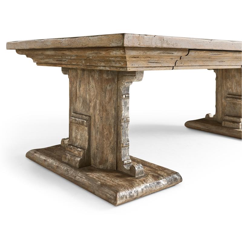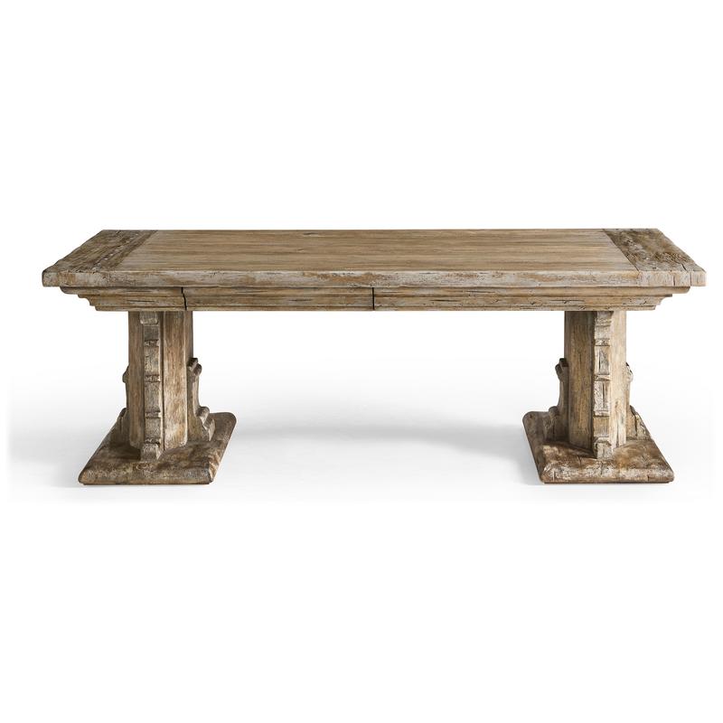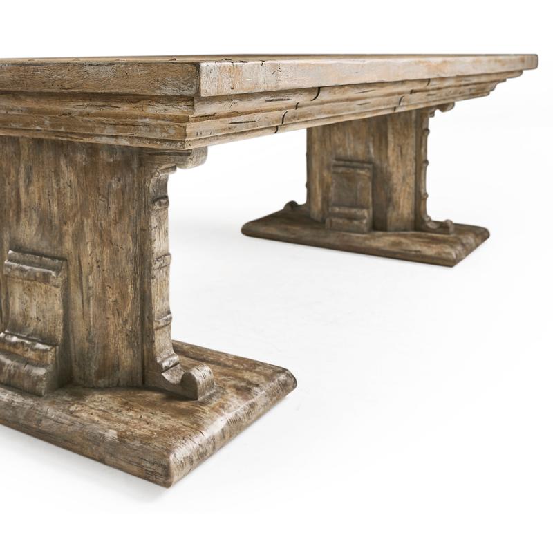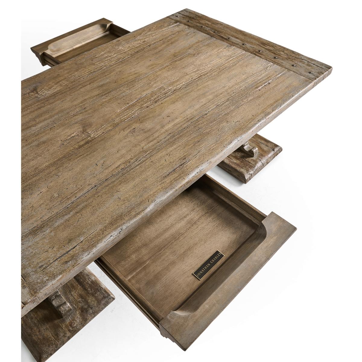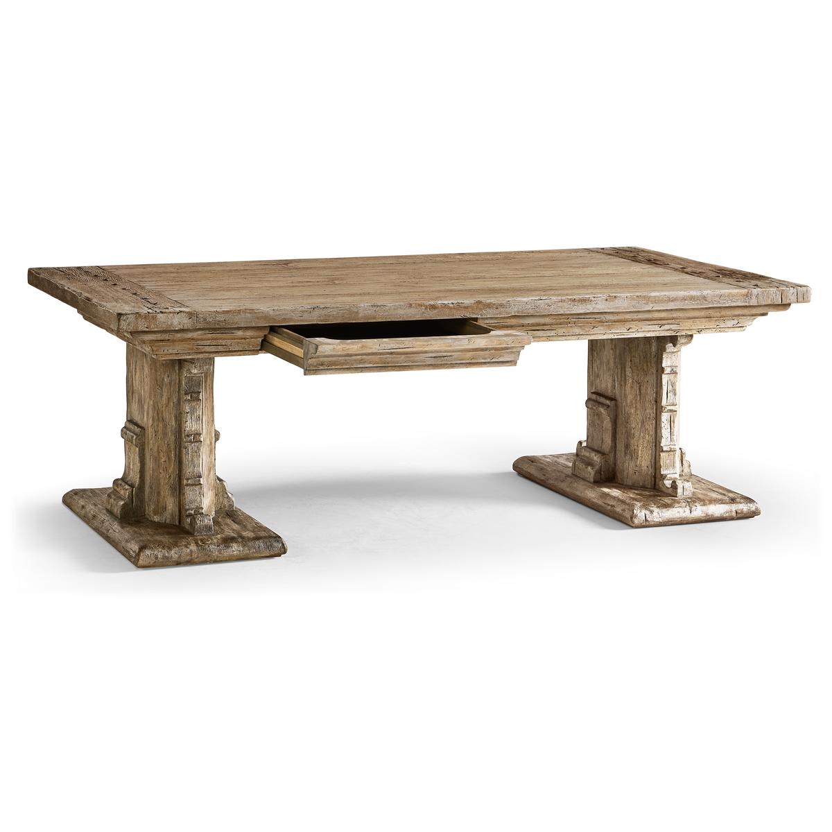 The Caldera Cocktail Table embodies timeless sophistication with its Spanish-style silhouette and expert craftsmanship. Crafted from greyed oak wood, it exudes a subtle, rustic charm accentuated by artful painted accents, adding an antique-inspired flair. The table's substantial pedestal legs and beautifully detailed edges showcase its refined elegance, while the rich textures of the oak create an inviting visual appeal. Two hidden center drawers with soft-close mechanisms offer discreet storage, enhancing the table's functionality without compromising its seamless design. Perfectly suited for both refined entertaining and everyday use, the Caldera Cocktail Table harmoniously blends heritage style with modern convenience, making it a captivating centerpiece in any living space.