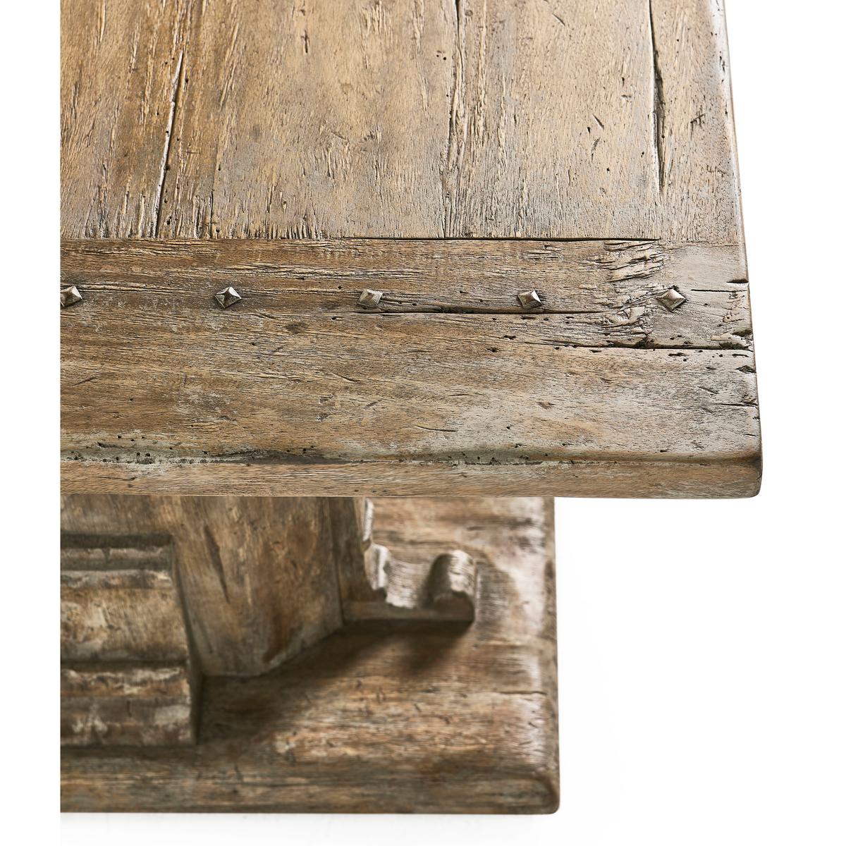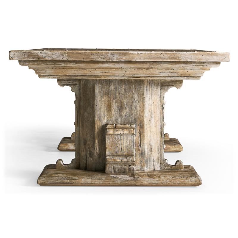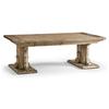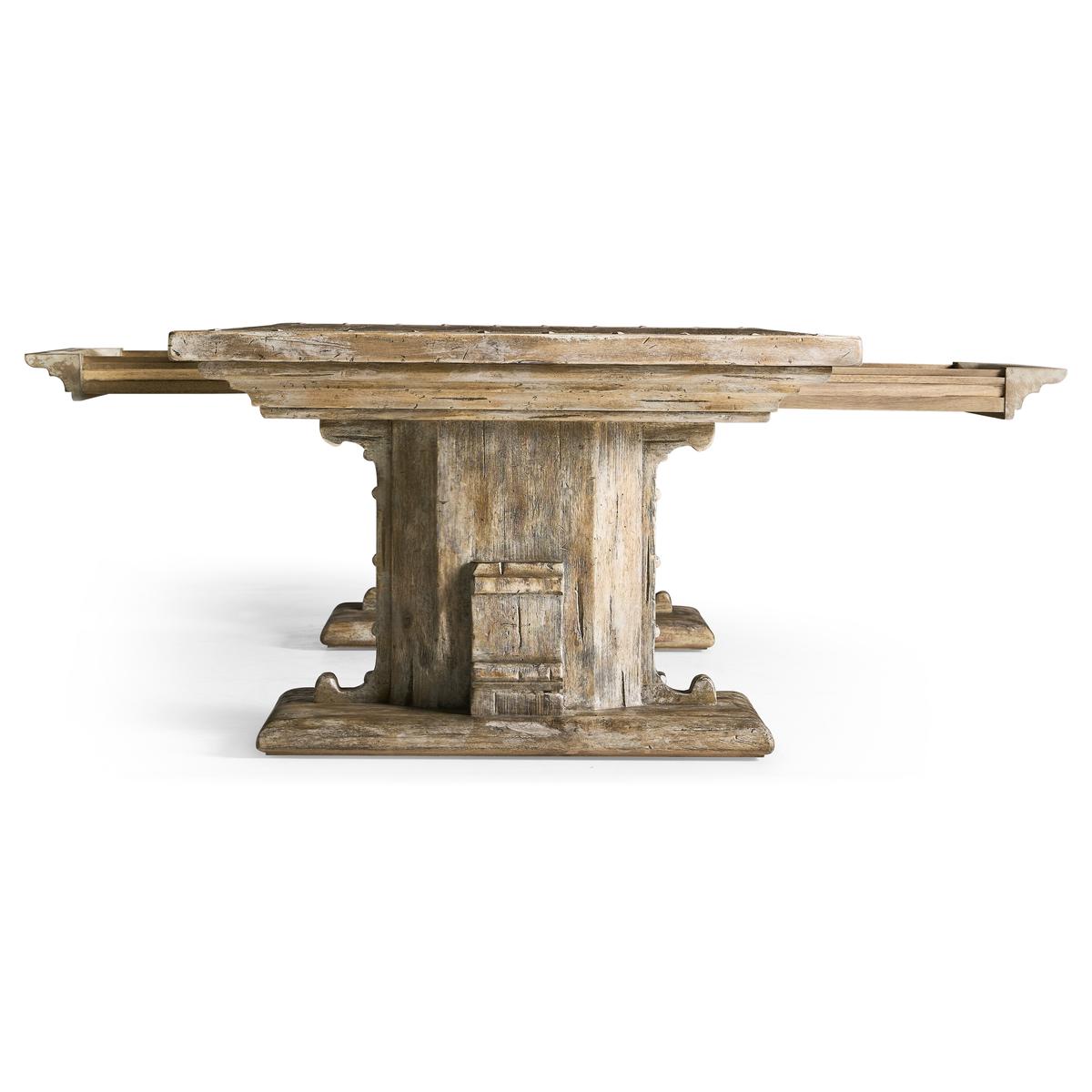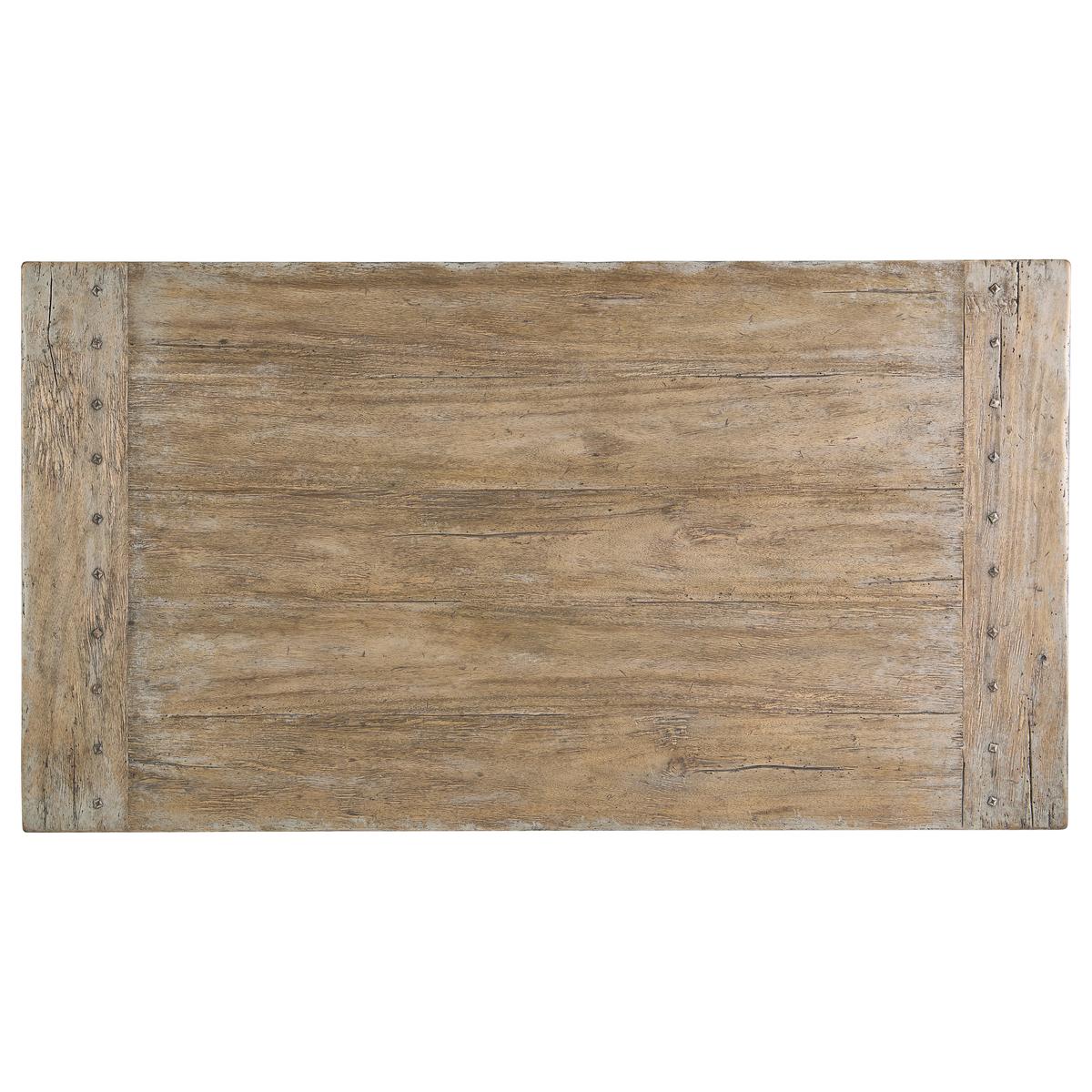 The Caldera Cocktail Table embodies timeless sophistication with its Spanish-style silhouette and expert craftsmanship. Crafted from greyed oak wood, it exudes a subtle, rustic charm accentuated by artful painted accents, adding an antique-inspired flair. The table's substantial pedestal legs and beautifully detailed edges showcase its refined elegance, while the rich textures of the oak create an inviting visual appeal. Two hidden center drawers with soft-close mechanisms offer discreet storage, enhancing the table's functionality without compromising its seamless design. Perfectly suited for both refined entertaining and everyday use, the Caldera Cocktail Table harmoniously blends heritage style with modern convenience, making it a captivating centerpiece in any living space.