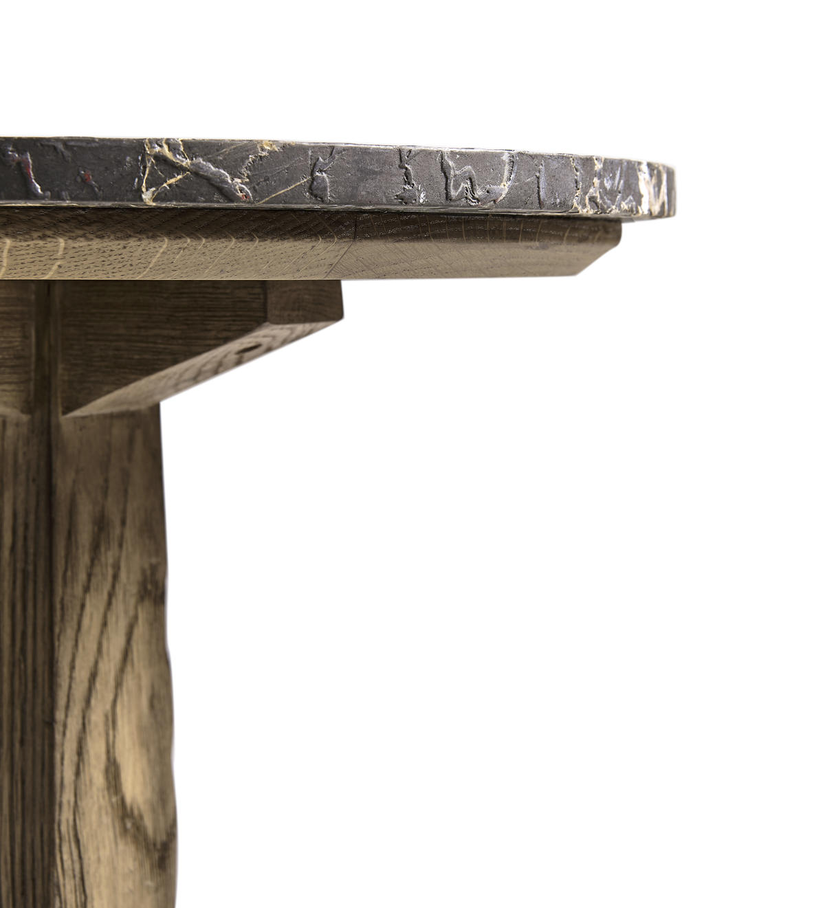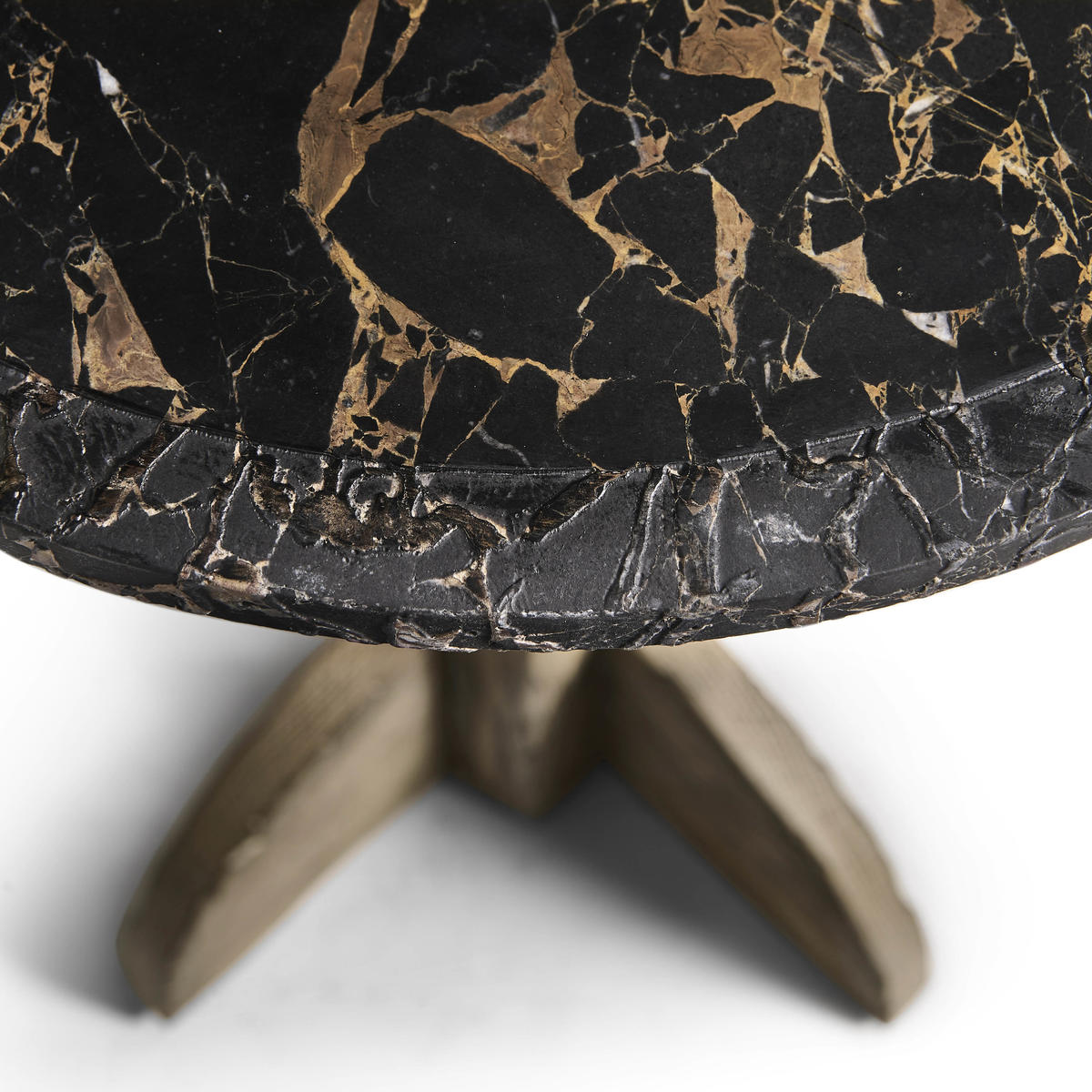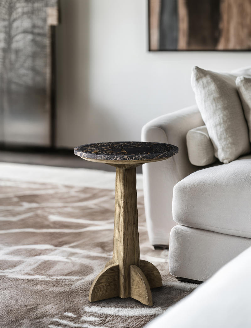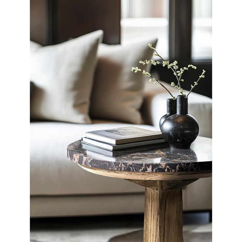 The Echo Canyon Round Side Table combines timeless sophistication with artistic flair. A dramatic black marble top rests on a sculptural wood base, giving this piece an air of refined luxury. The gently weathered Faded Oak finish on the wood accentuates its natural grain, creating a captivating contrast against the sleek marble surface. Whether used to showcase decorative objects or to keep essentials within reach, this side table instantly elevates any space with its exquisite balance of style and function.