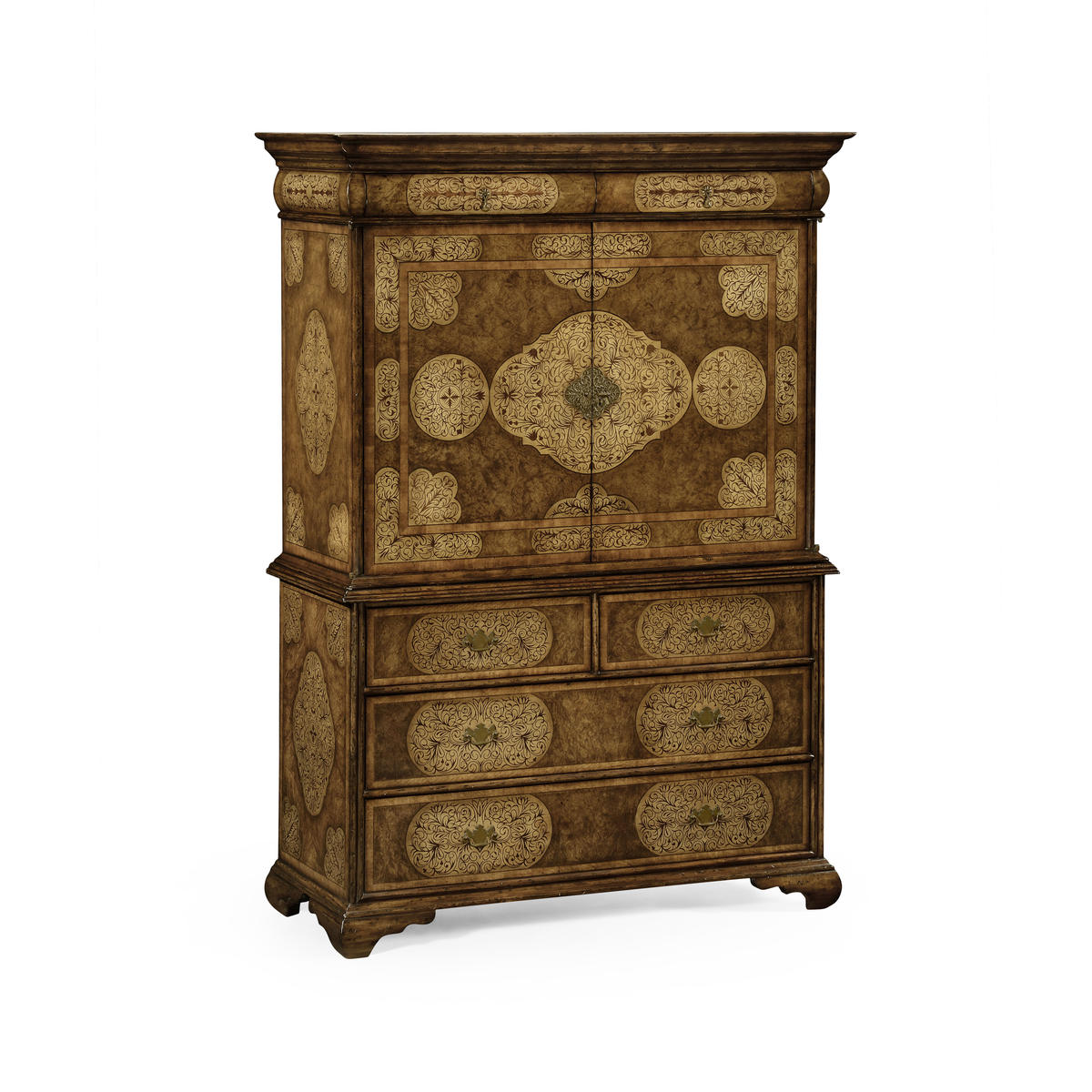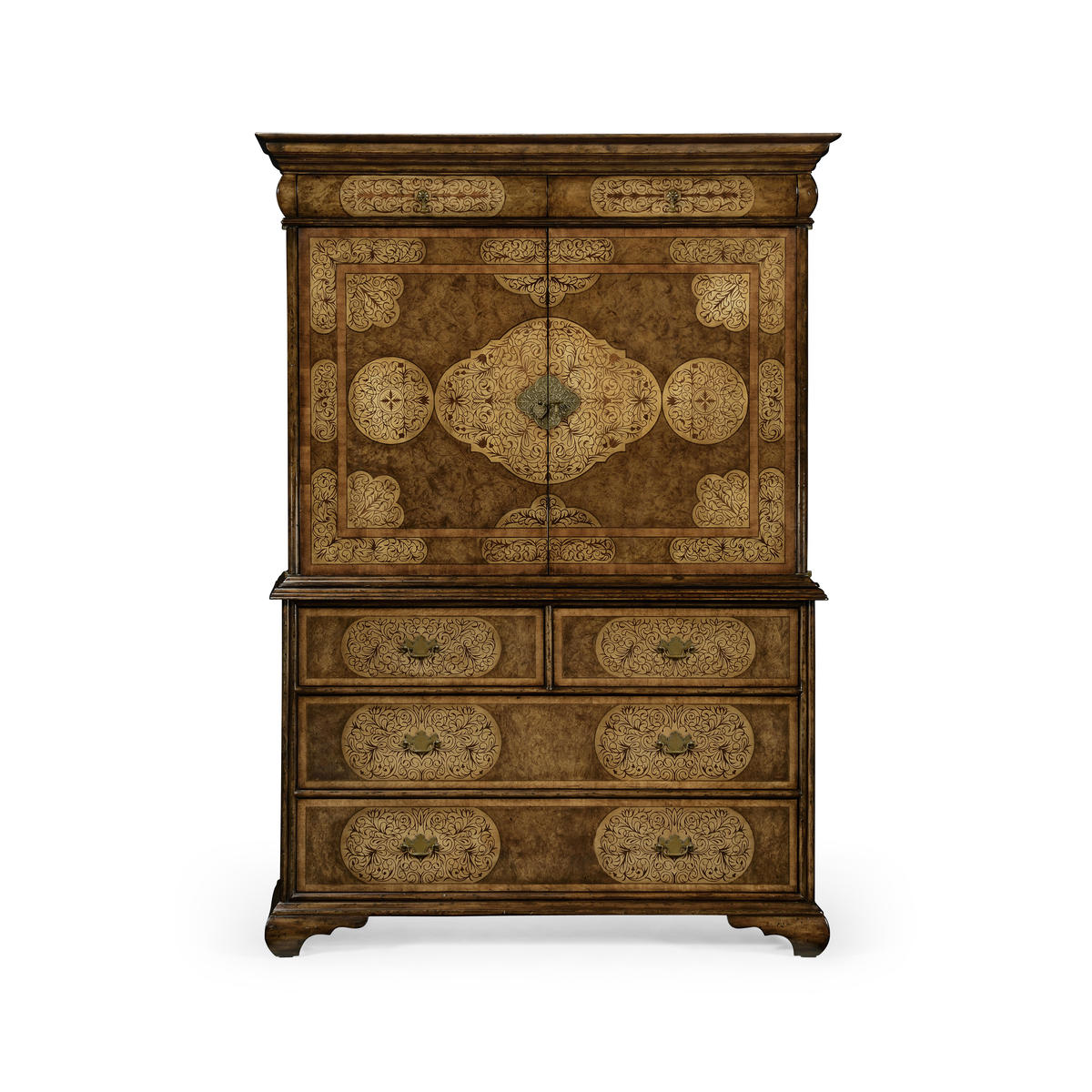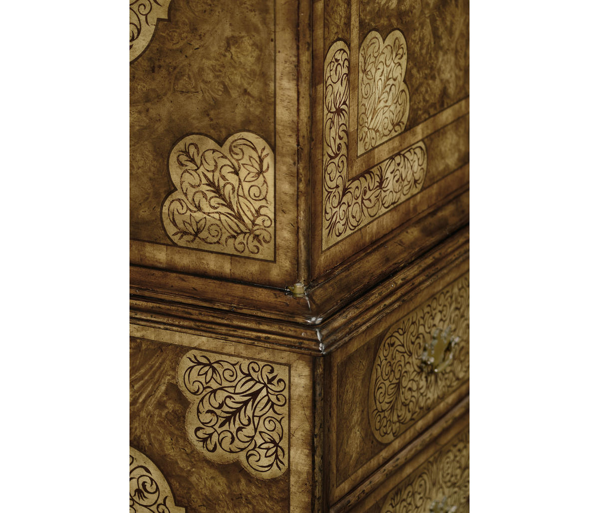 Walnut and burl walnut cabinet on chest, twin doors and two drawers to the top section with finely inlaid contrasting panels of swirling arabesque 'seaweed marquetry', fully lined interior with inlaid drawers and a small cupboard as well as a slide, above two short and two long drawers with further inlay. Brass hardware to the doors and drawers cast using the "lost wax" technique. (Old salescode: 492252)