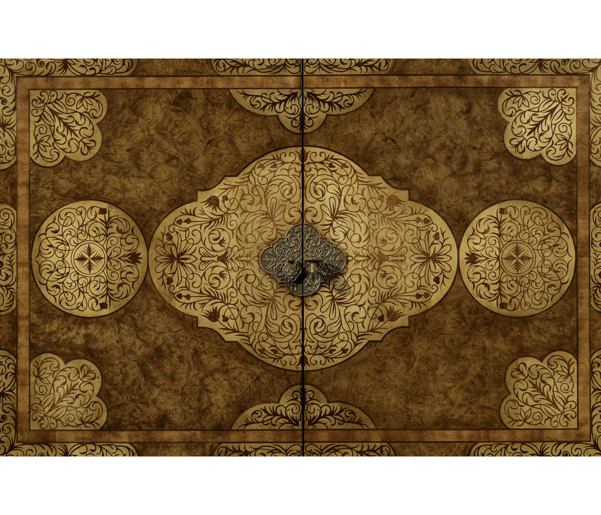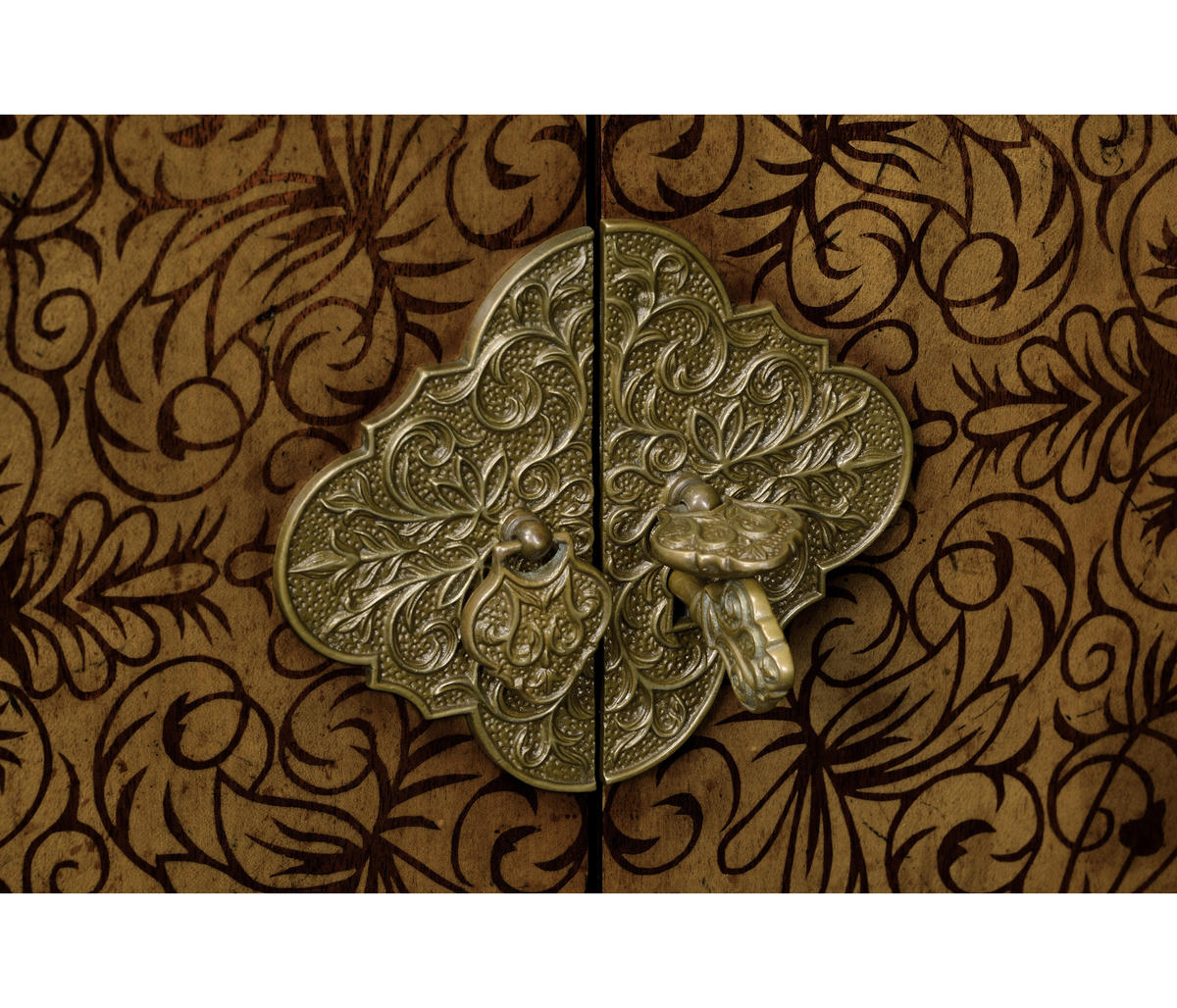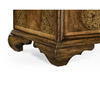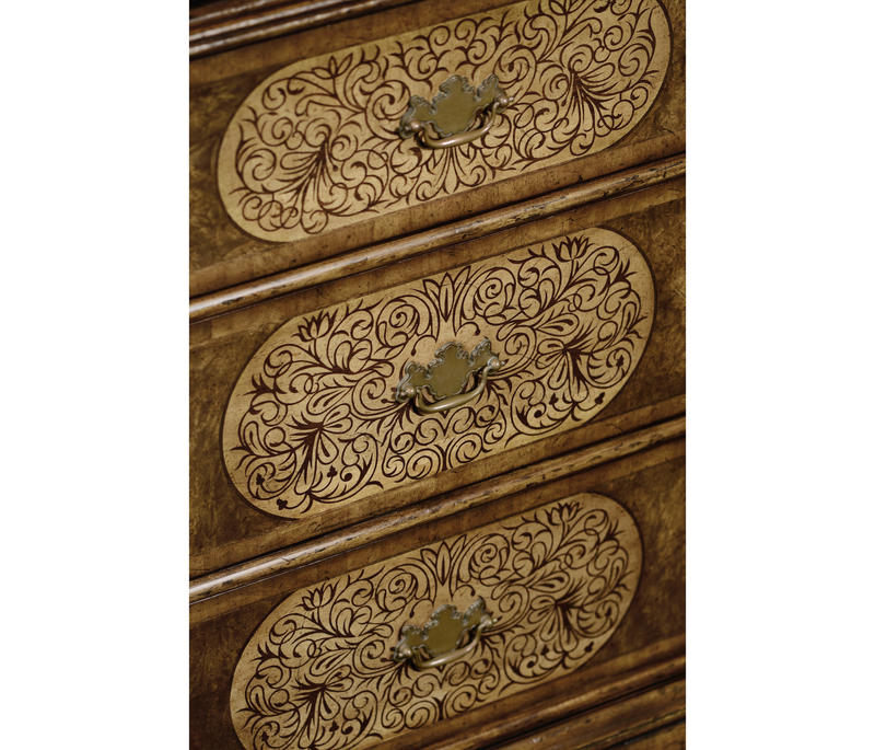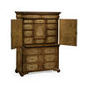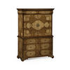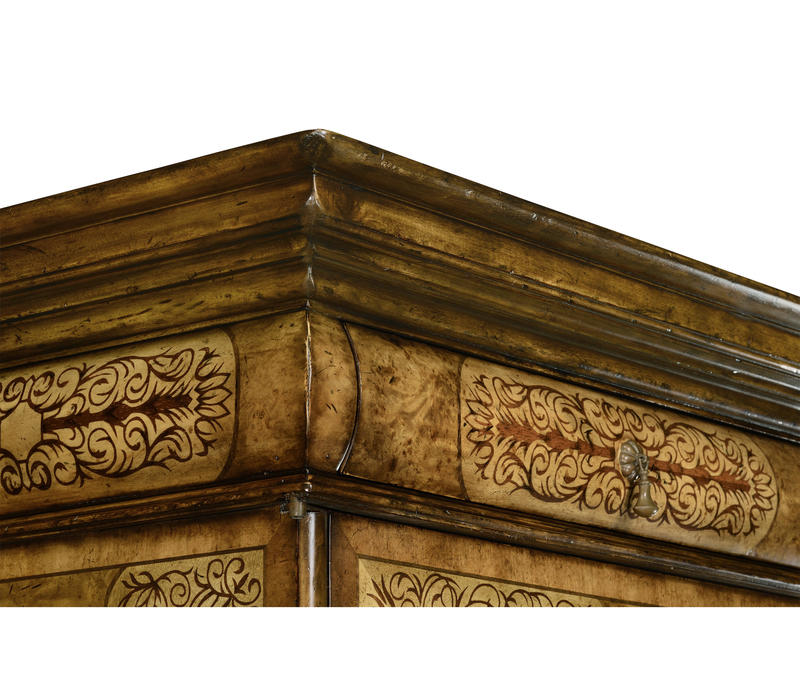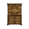 Walnut and burl walnut cabinet on chest, twin doors and two drawers to the top section with finely inlaid contrasting panels of swirling arabesque 'seaweed marquetry', fully lined interior with inlaid drawers and a small cupboard as well as a slide, above two short and two long drawers with further inlay. Brass hardware to the doors and drawers cast using the "lost wax" technique. (Old salescode: 492252)