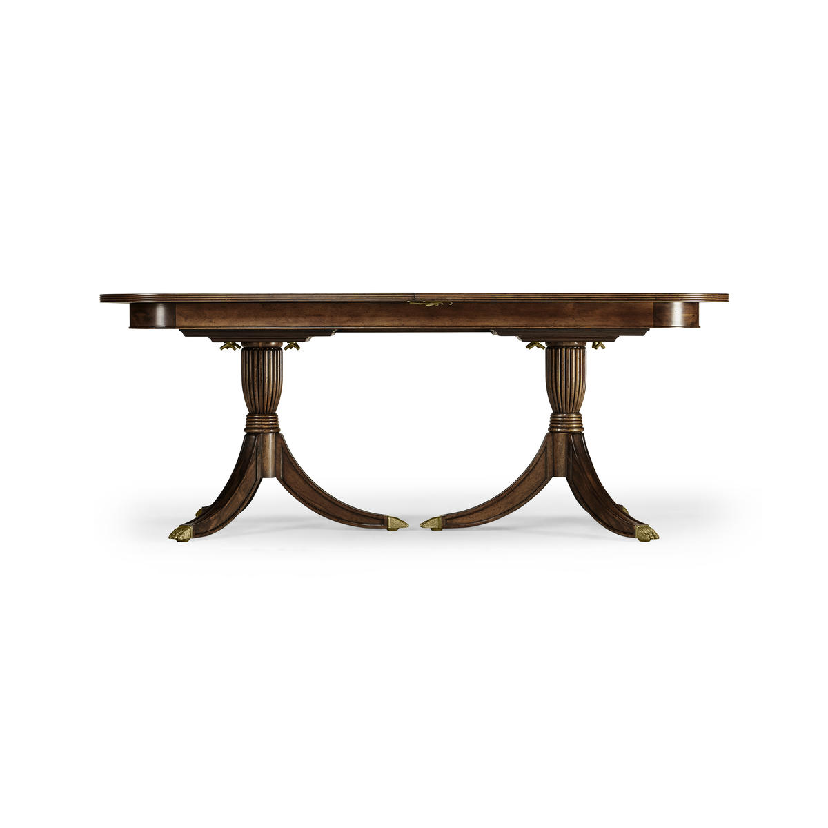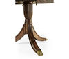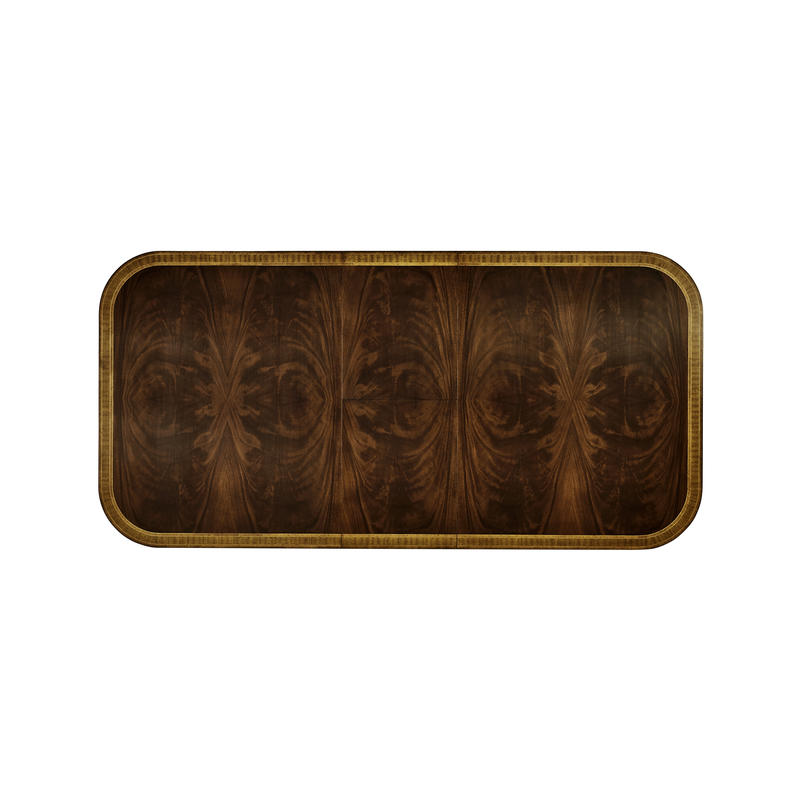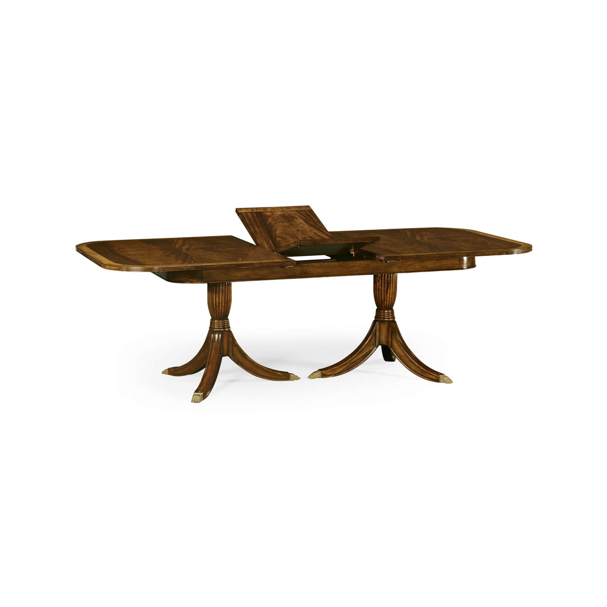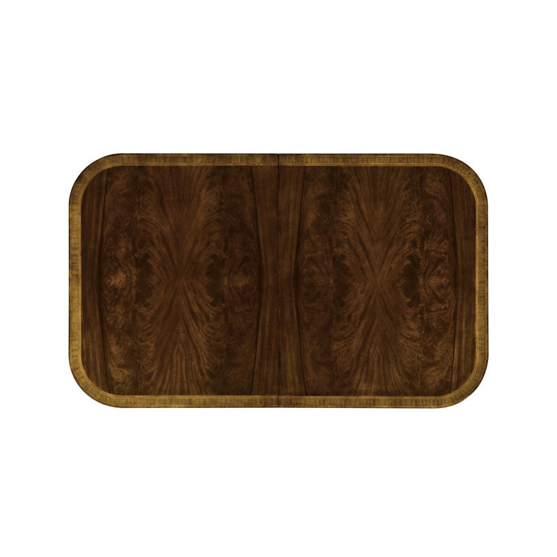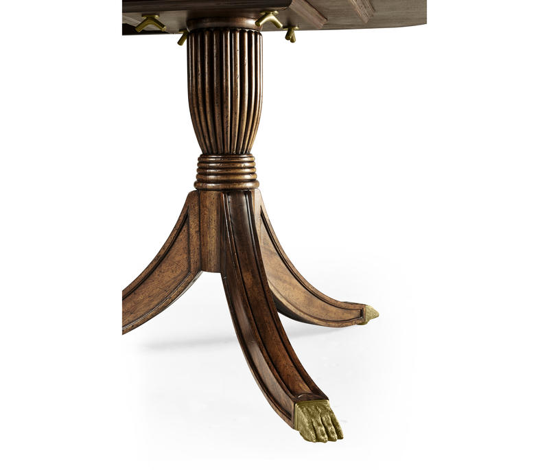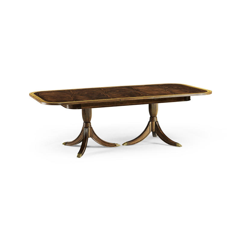 Classic regency style single self-storing leaf extending dining table with fine crotch mahogany veneers to the top. Set on twin pedestal baluster bases. After a design of c.1820. Seats: 8 + 2.