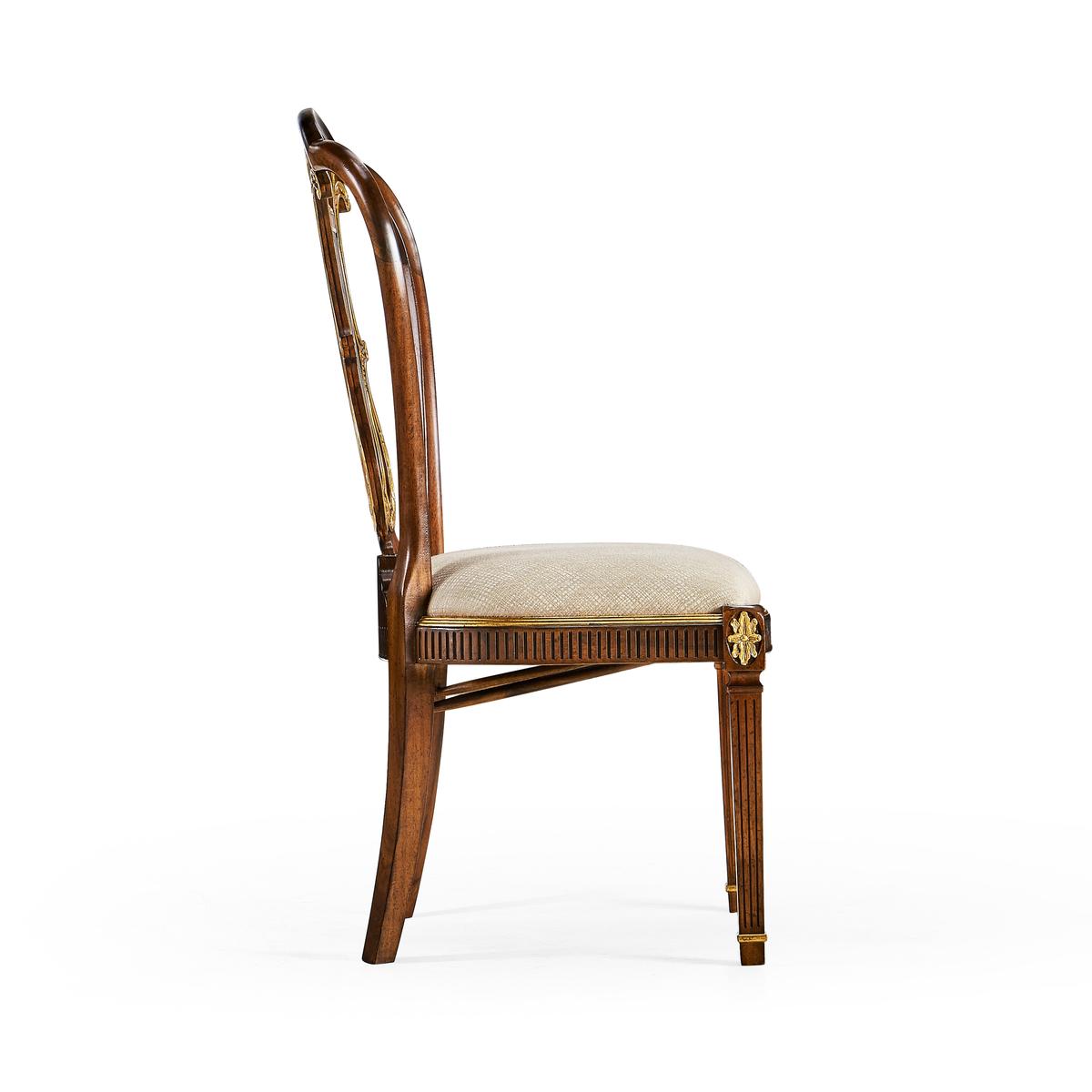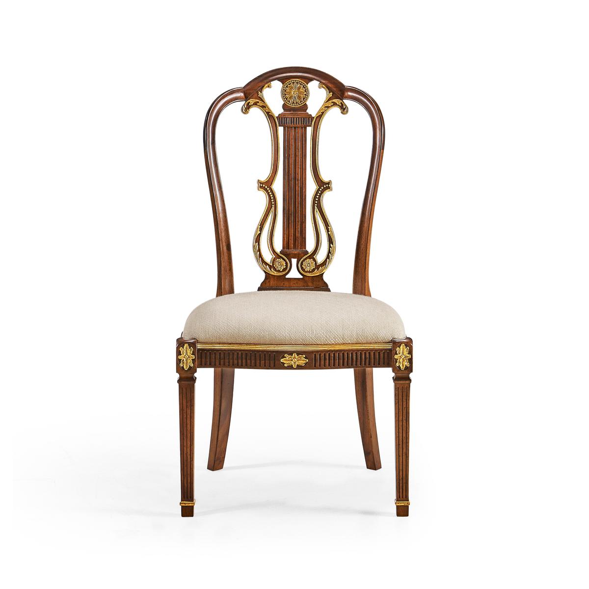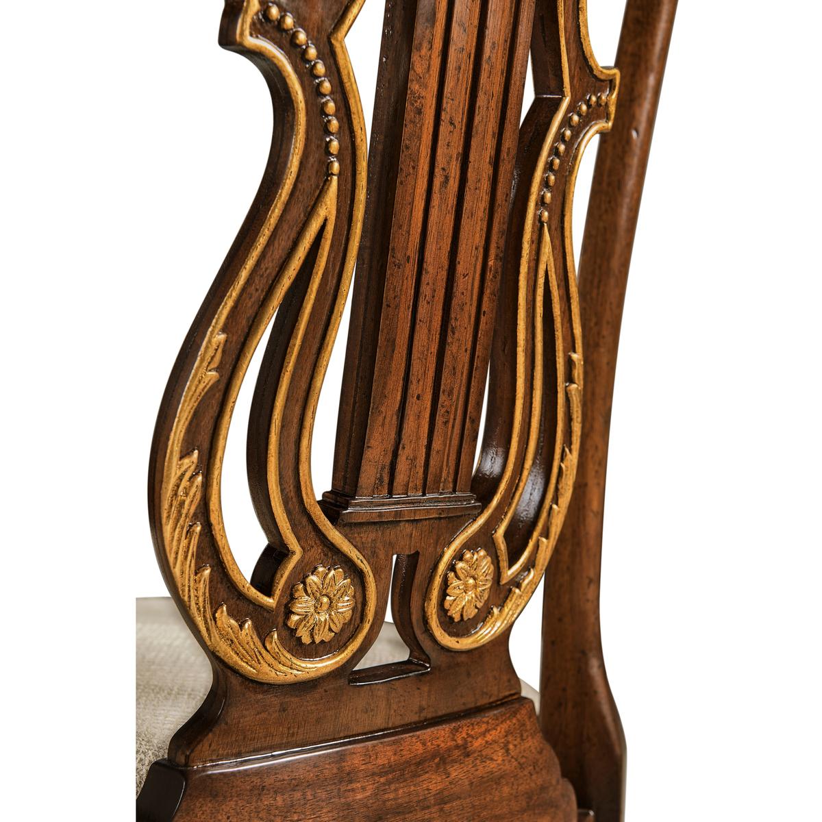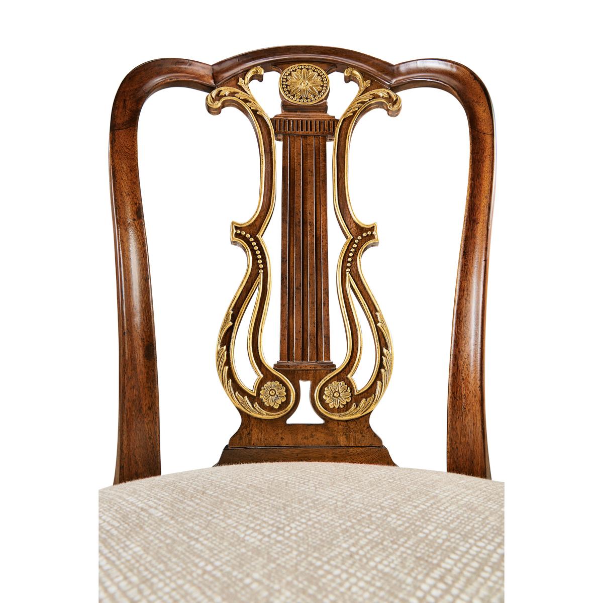 Neo-classical Adam style mahogany side chair with profuse carving to the curved lyre splat back highlighted with gilded details. Serpentine front rail with gilded paterae and tapering square cross section front legs. Upholstered seat in Skipper. After an original of c.1770.