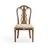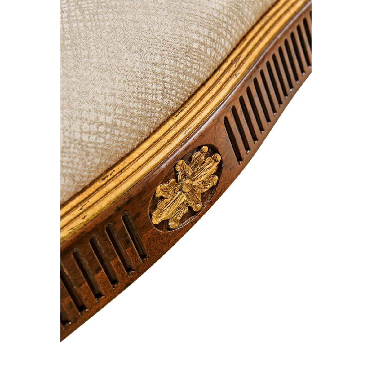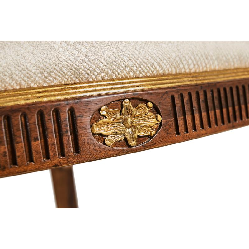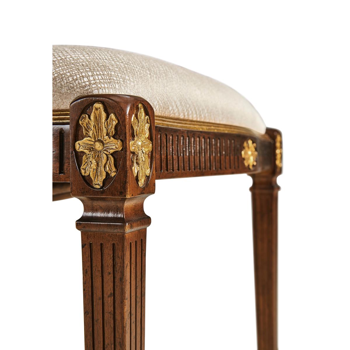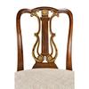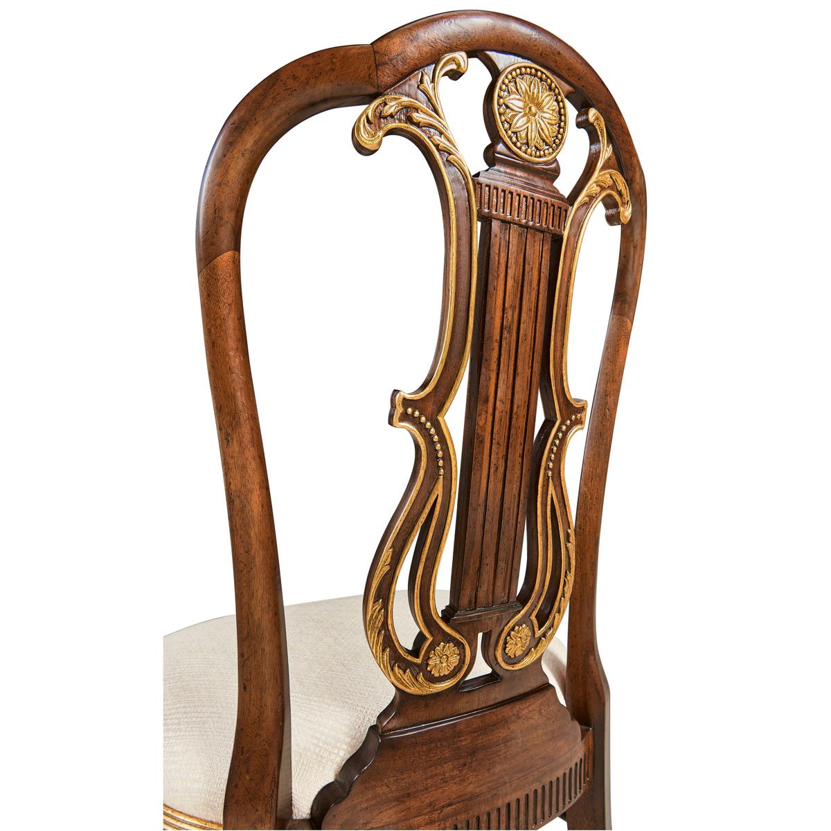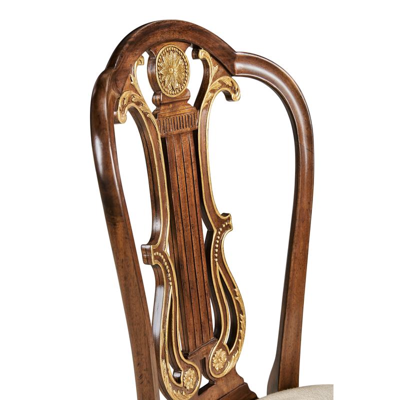 Neo-classical Adam style mahogany side chair with profuse carving to the curved lyre splat back highlighted with gilded details. Serpentine front rail with gilded paterae and tapering square cross section front legs. Upholstered seat in Skipper. After an original of c.1770.