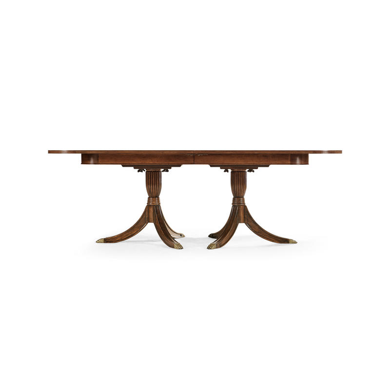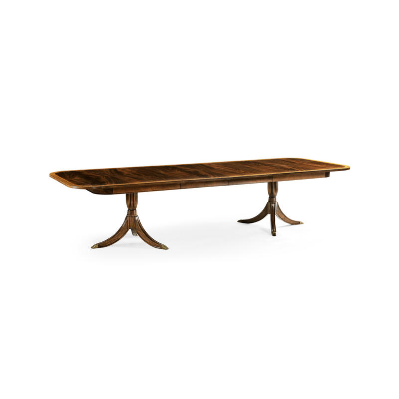 Classic Regency style extending dining table with fine crotch mahogany veneers to the top. Set on twin pedestal baluster bases. Can be extended with the addition of two 22"/56cm drop-in leaves. After a design of c.1820. Seats: 8 + 2 + 2.