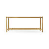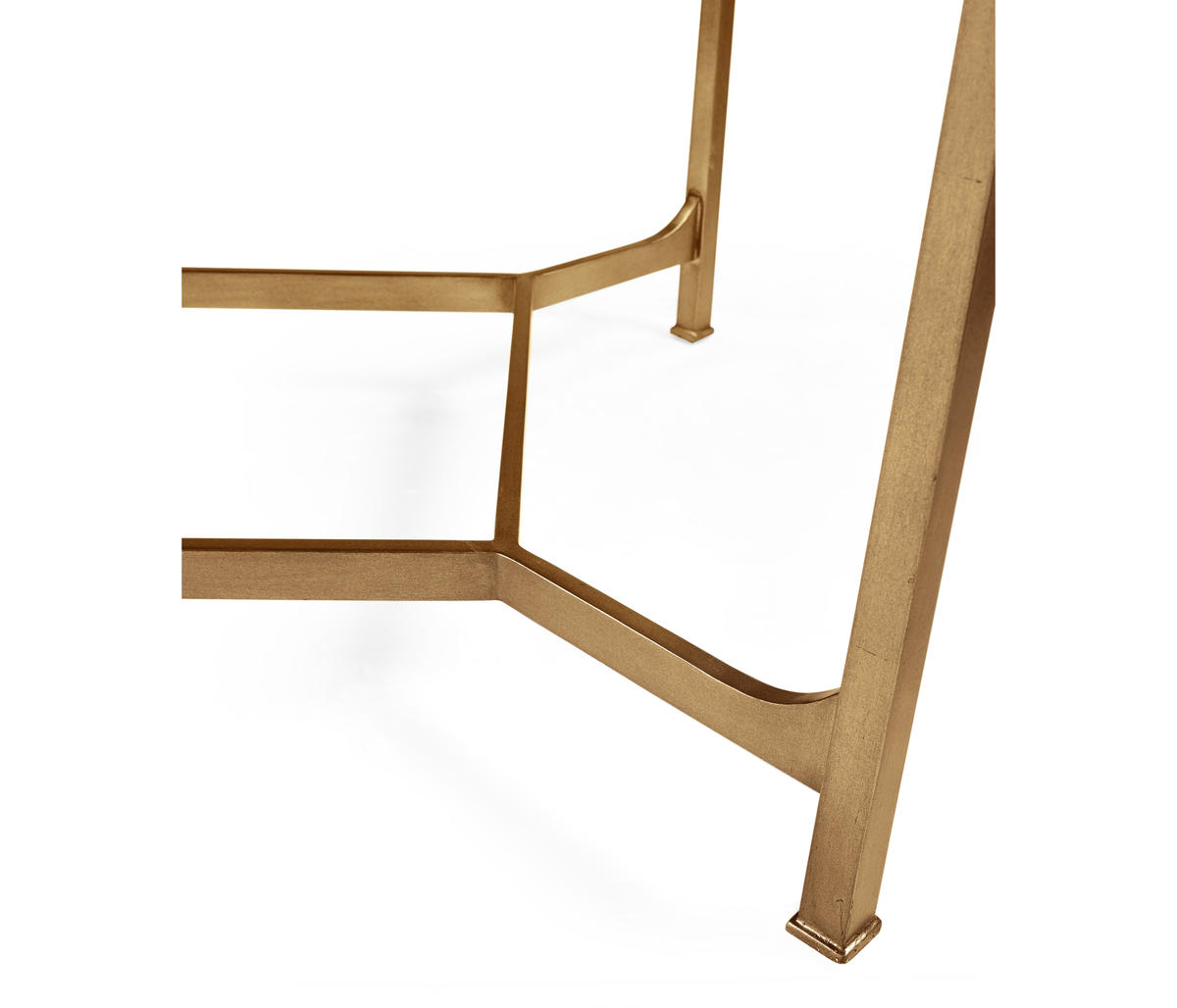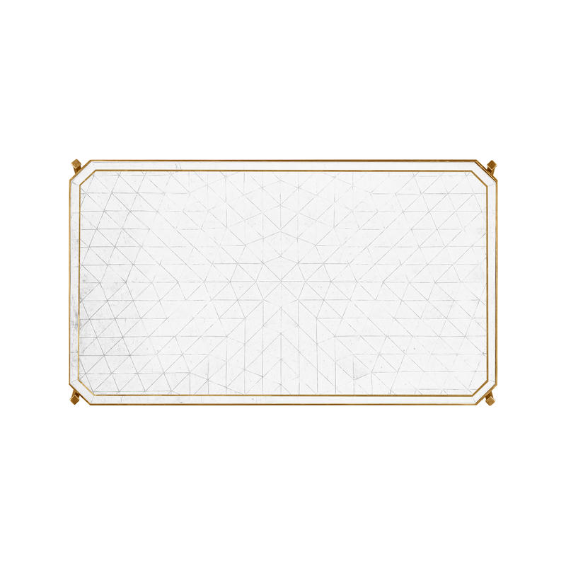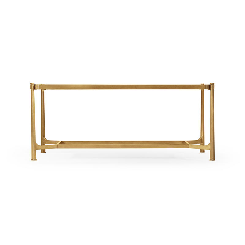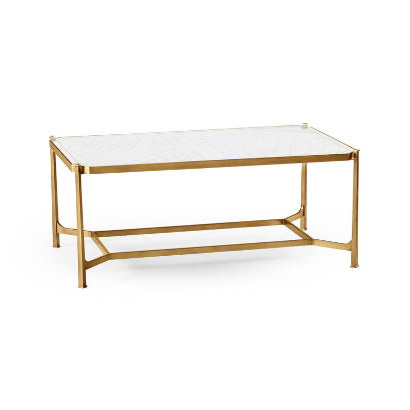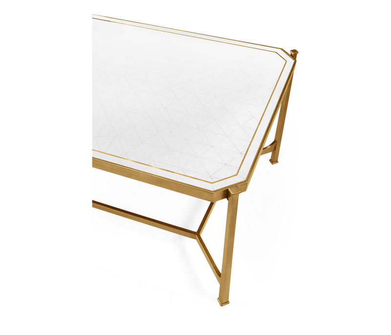 Contemporary wrought iron coffee table with an antique gilded finish and églomisé rectangular top set on an openwork base. (Old salescode: 494144-G)