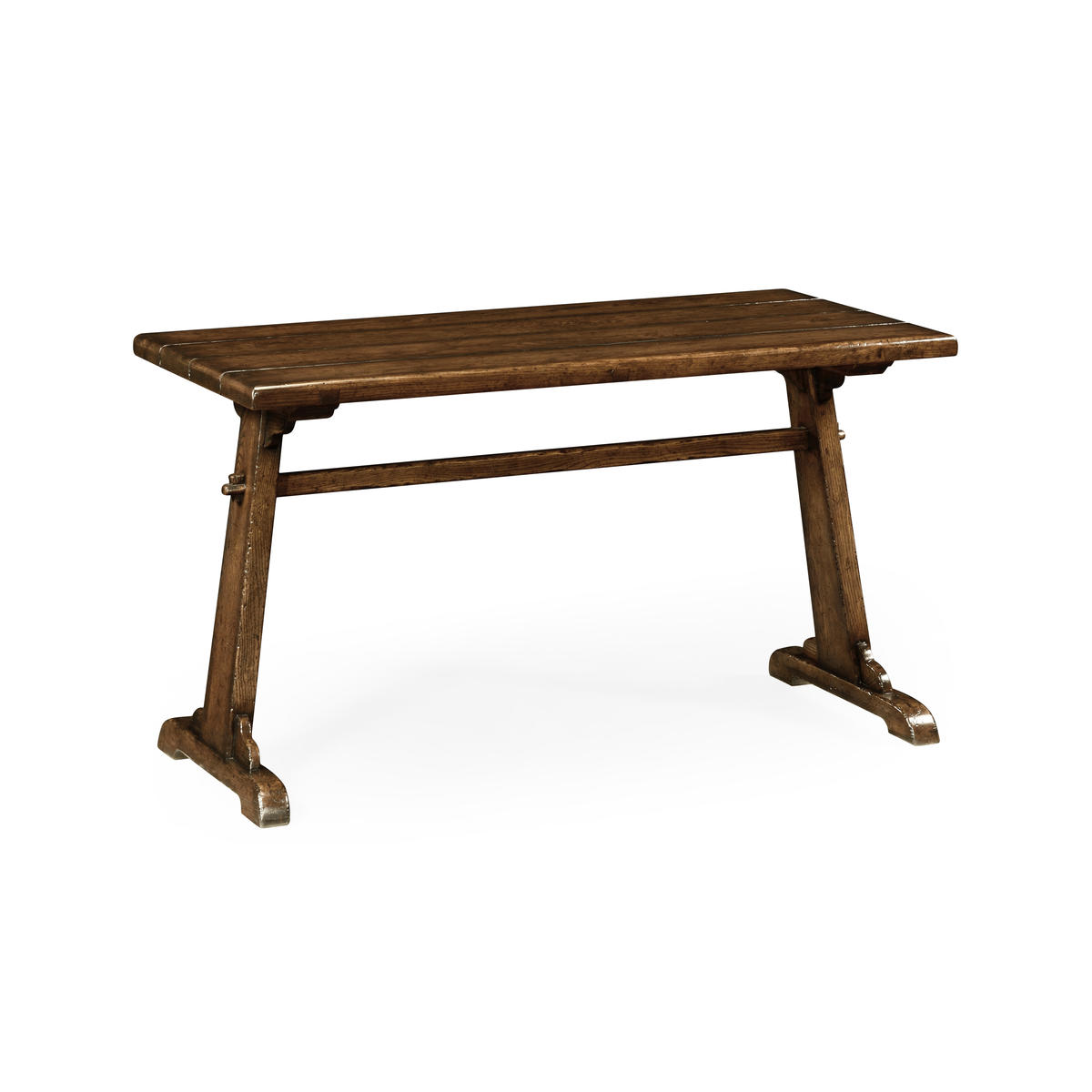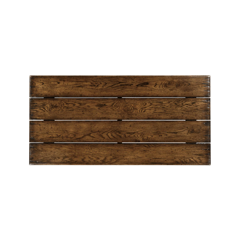 Distressed country style dark oak dining table the planked top set over sled type feet. Perfectly matches the 494441 bench. (Old salescode: 494440)