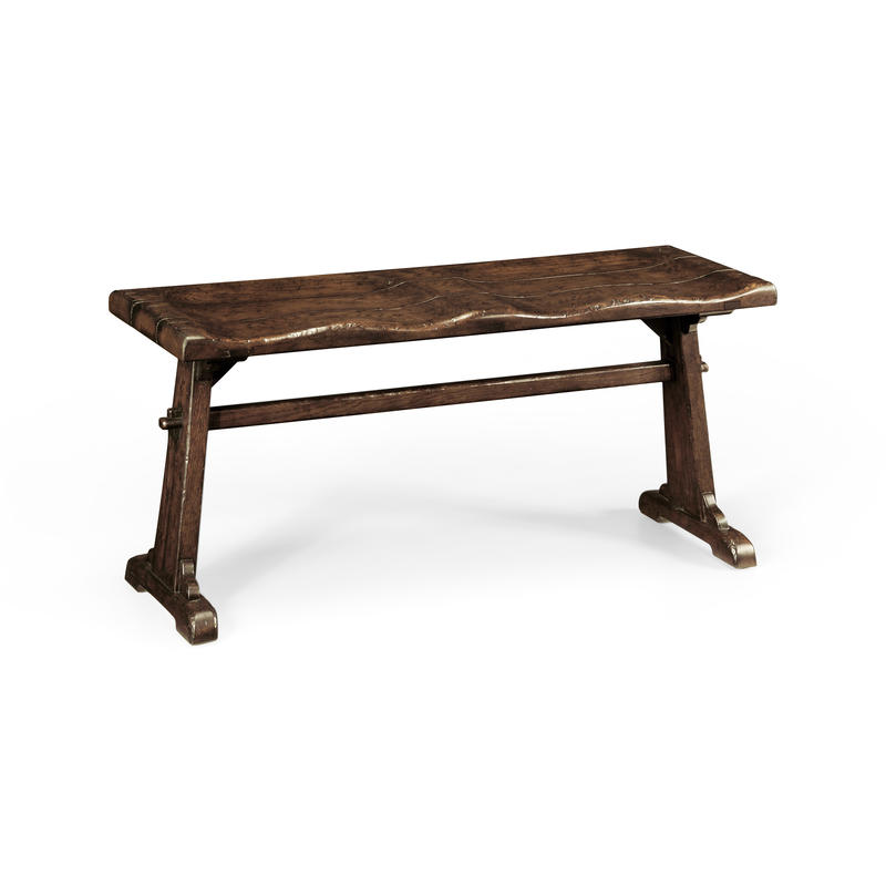 Distressed country style dark oak bench with H-stretcher and shaped saddle seat. Perfectly matches the 494440 dining table. (Old salescode: 494441)