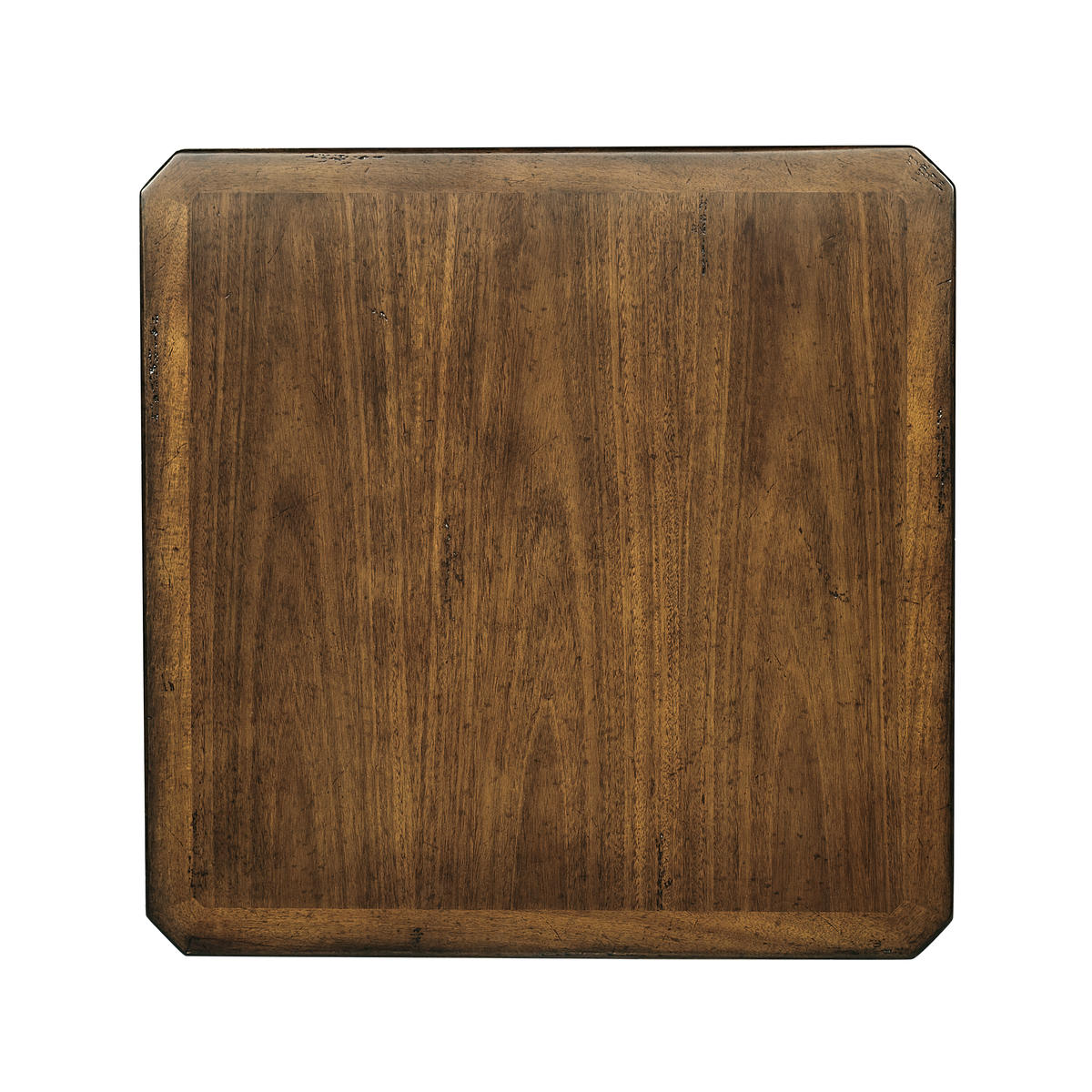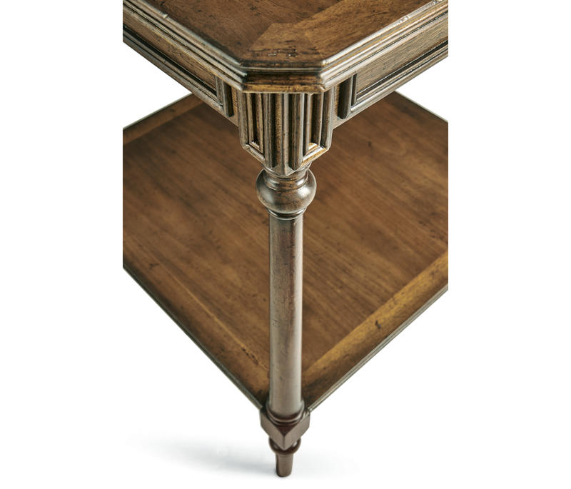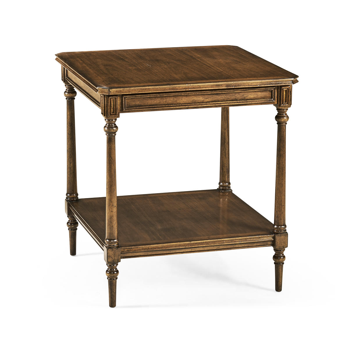 Square walnut side table, the top with canted corners set above a panelled frieze and turned baluster legs around an undertier. (Old salescode: 494636)