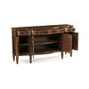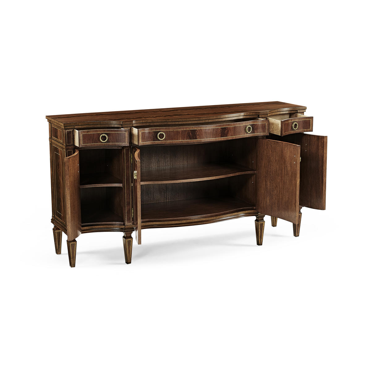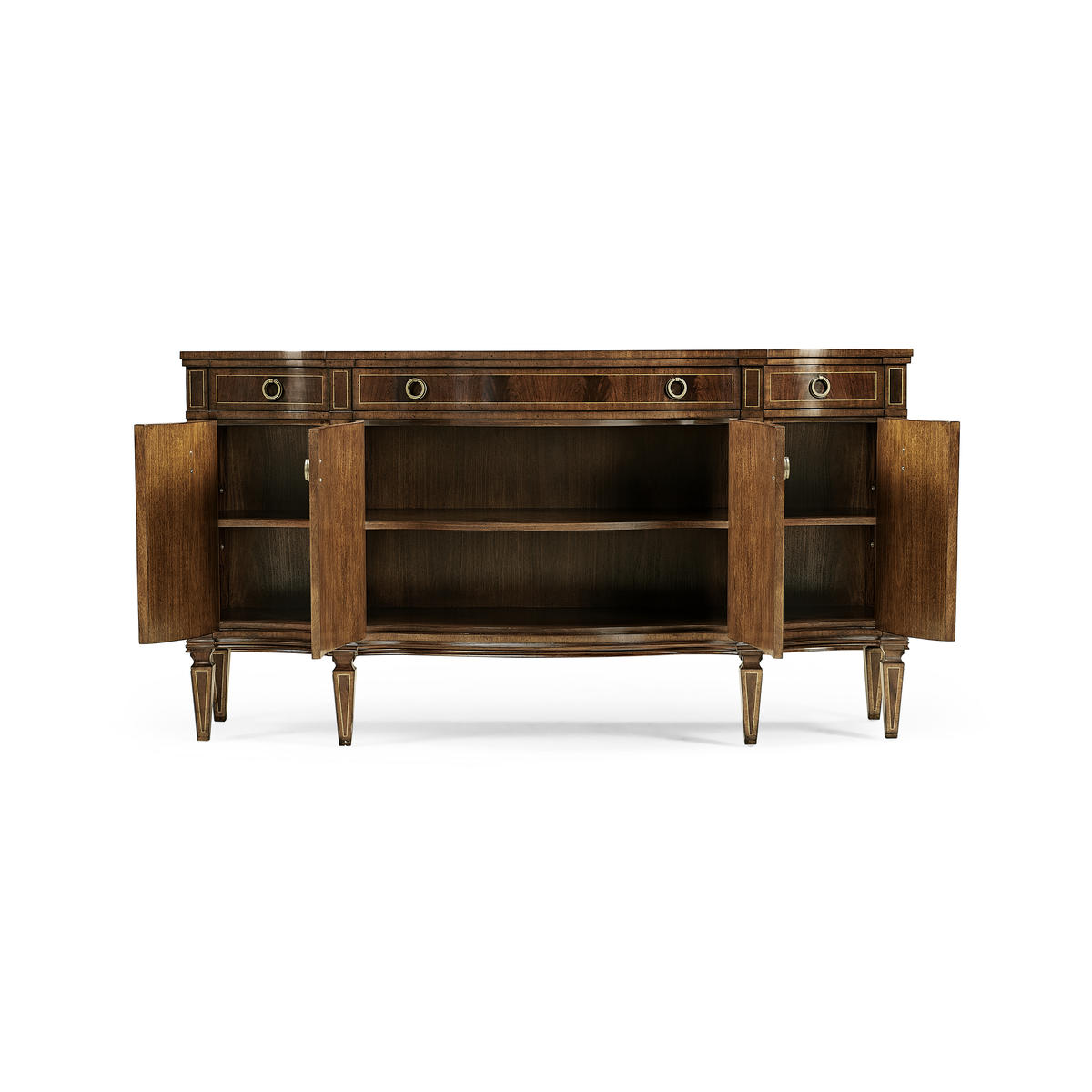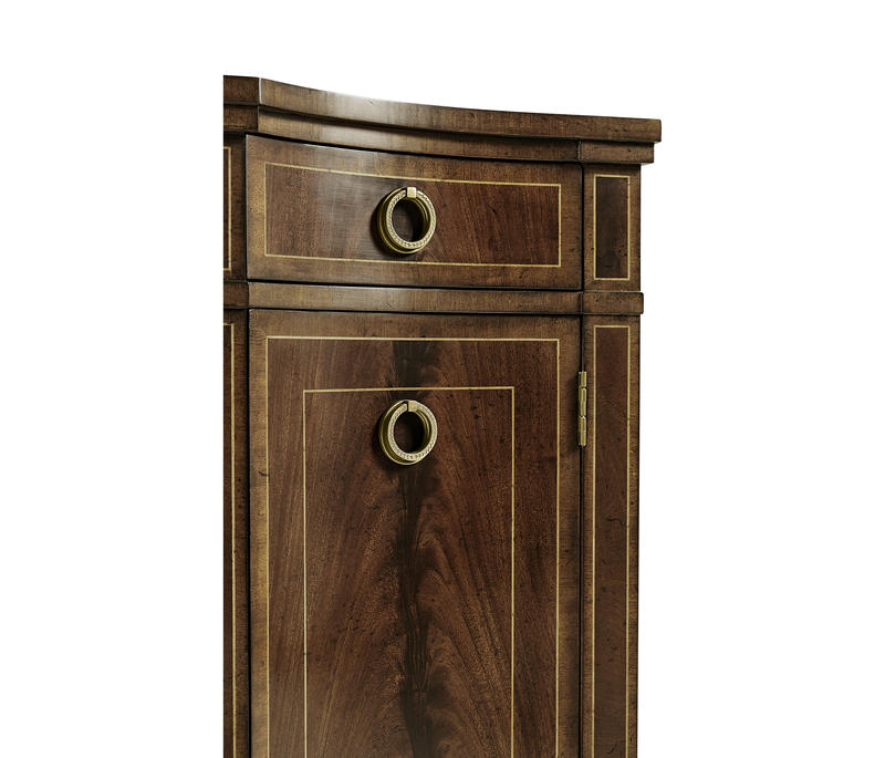 Substantial Regency bow fronted serpentine sideboard with four doors, flame mahogany veneers, and three drawers to the upper register. Contrasting stringing throughout and raised on square cross-section feet.
