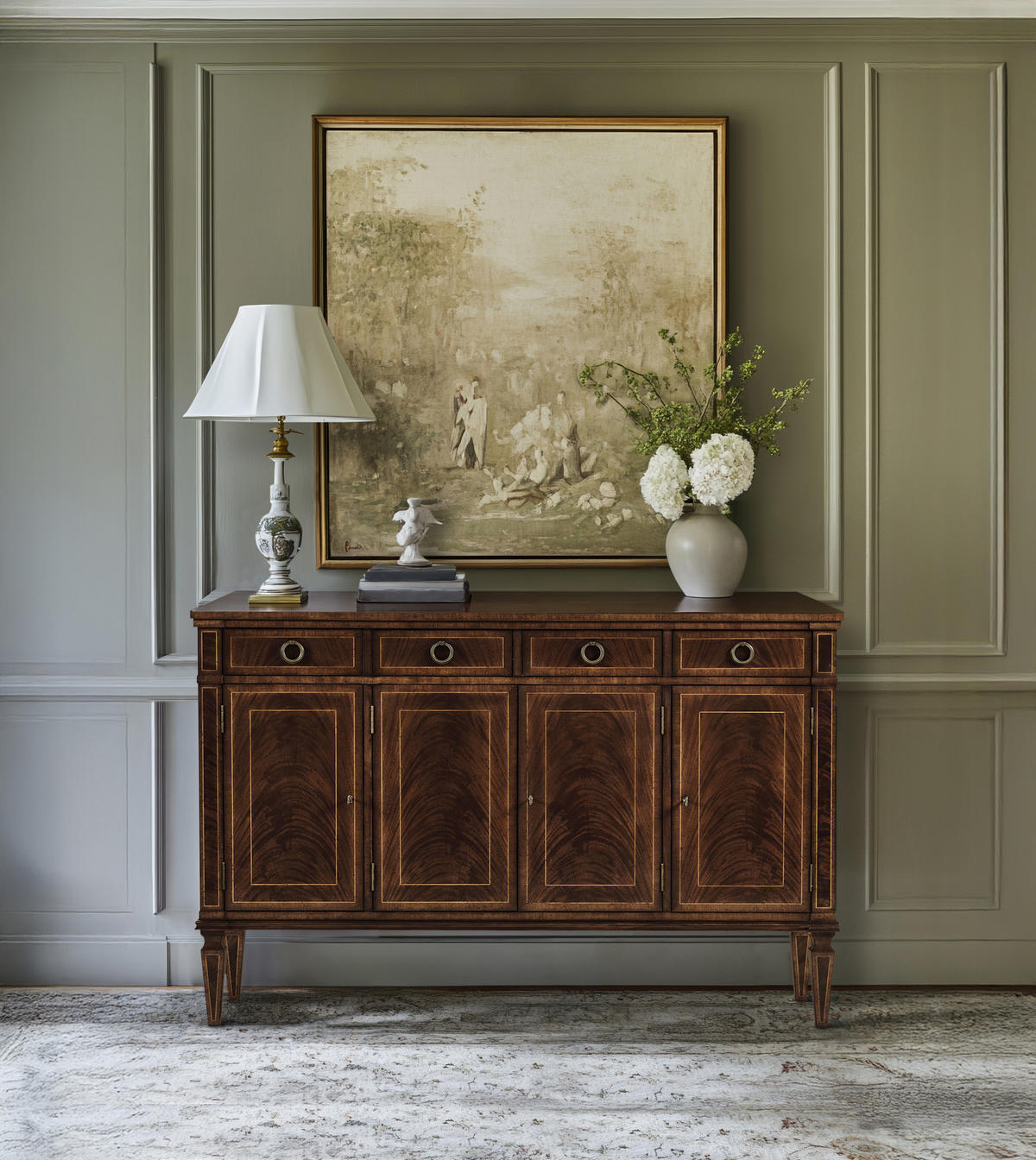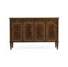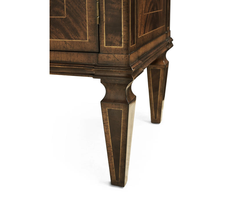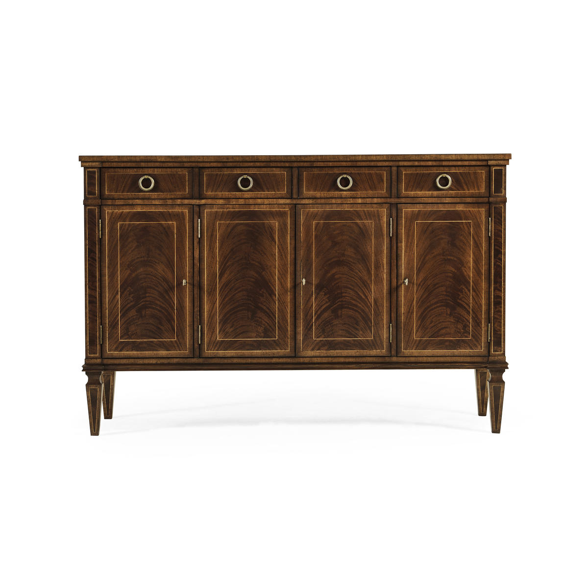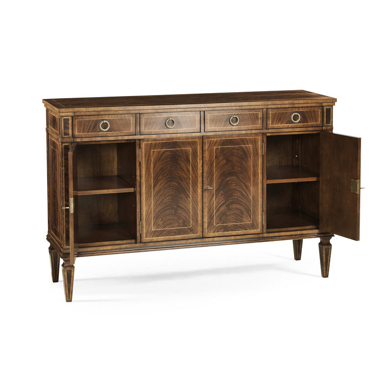 Substantial Regency style flat fronted rectangular sideboard with four doors, flame mahogany veneers, and four drawers to the upper register. Contrasting stringing throughout and raised on square cross-section feet.