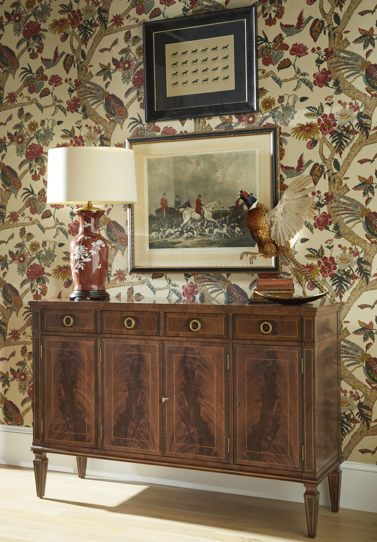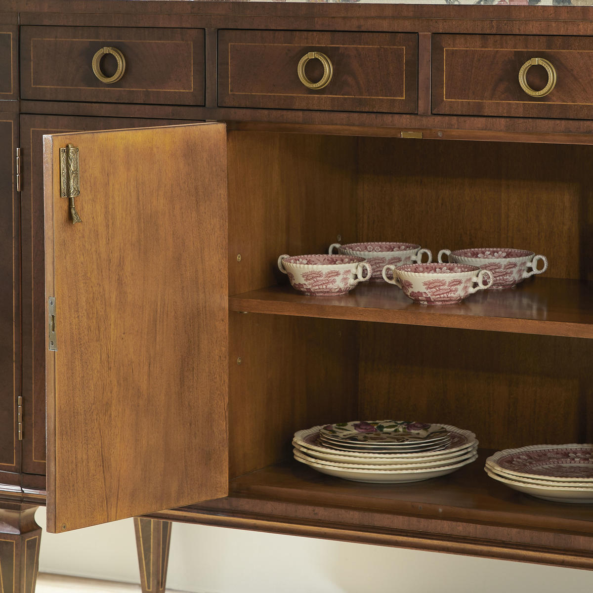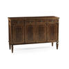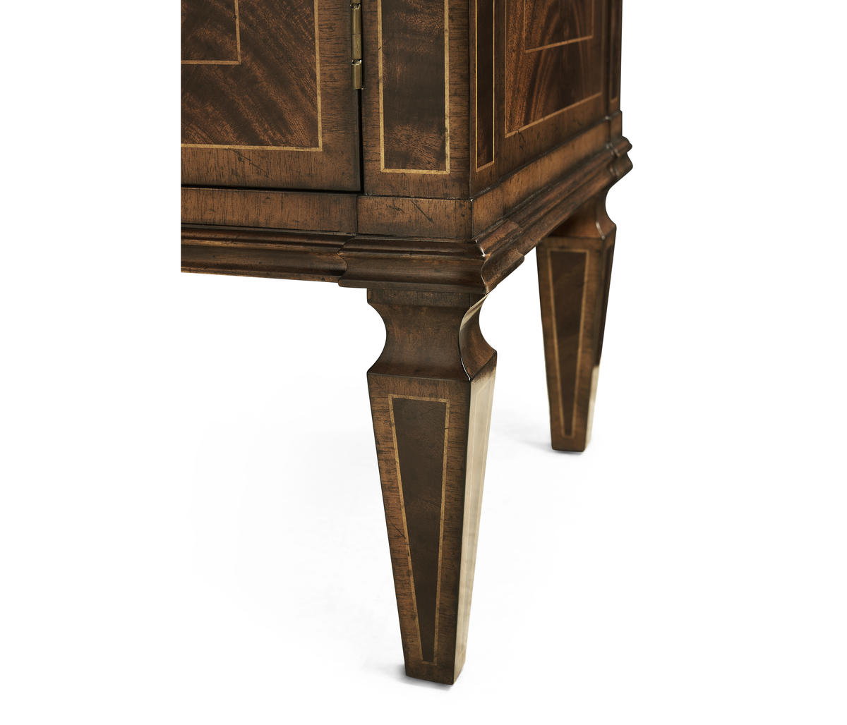 Substantial Regency style flat fronted rectangular sideboard with four doors, flame mahogany veneers, and four drawers to the upper register. Contrasting stringing throughout and raised on square cross-section feet.