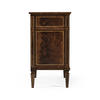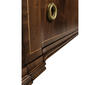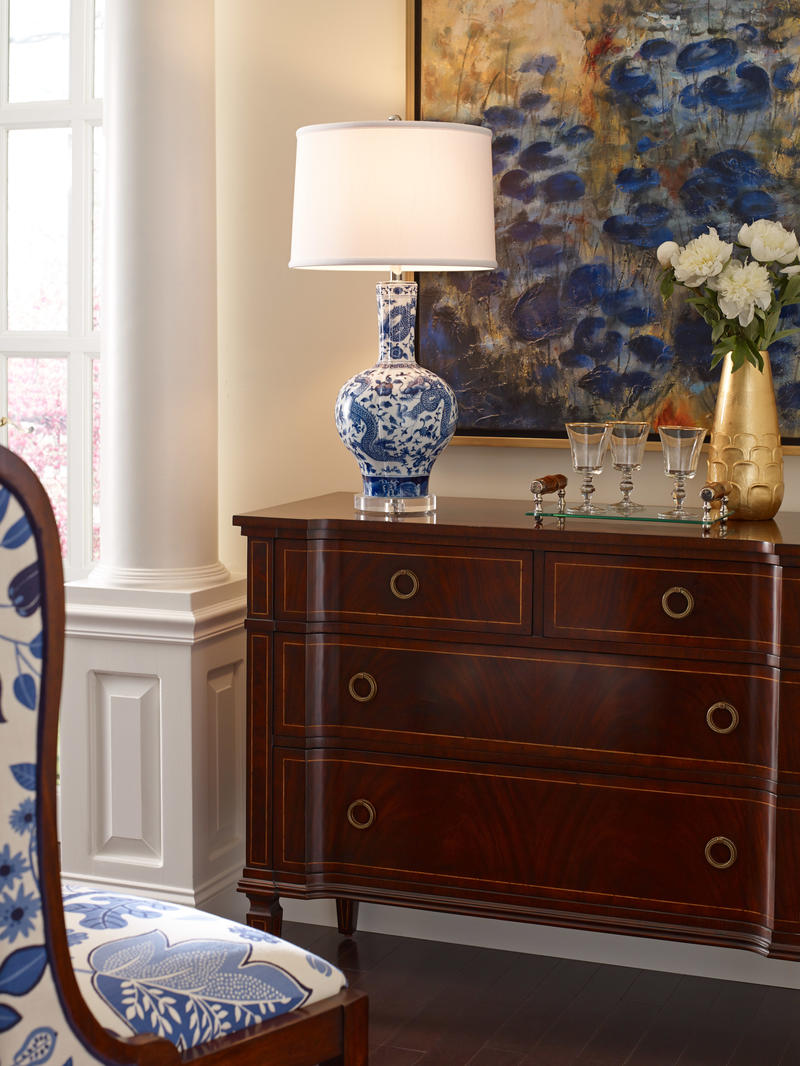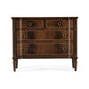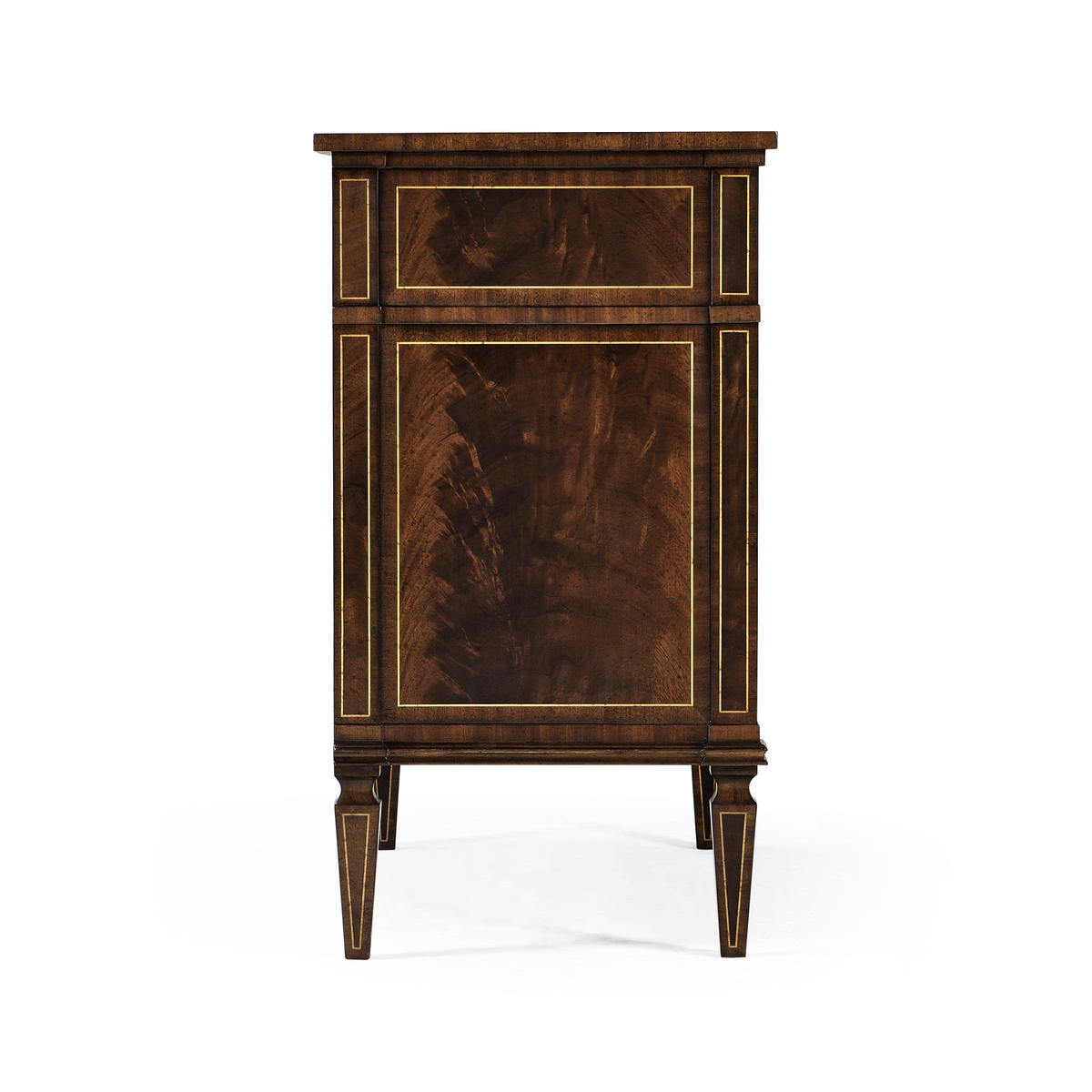 Regency style reverse breakfront chest of four drawers. Two small drawers above two graduated larger drawers. Contrasting stringing throughout and raised on square cross-section feet.