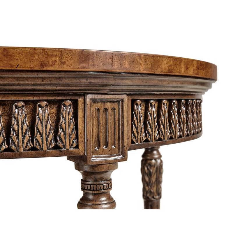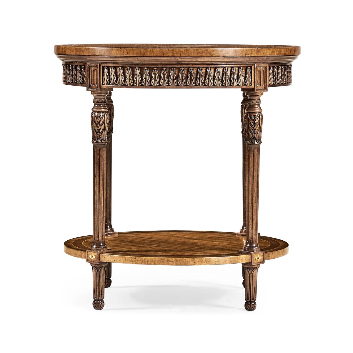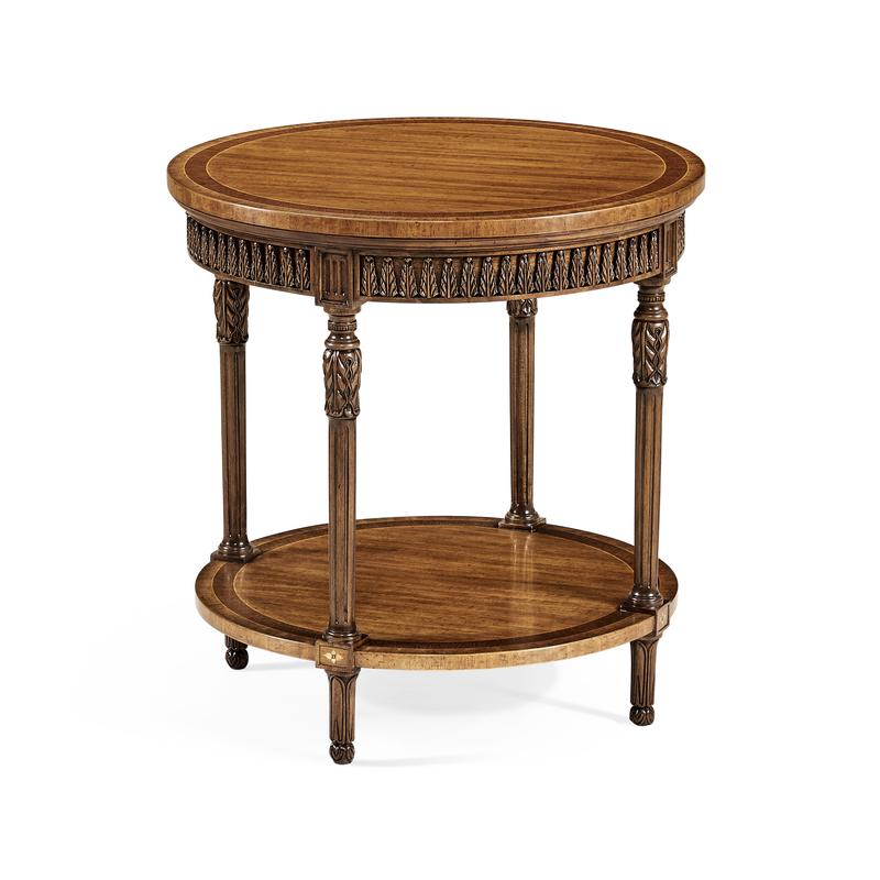 Elegant circular side table in the French style of Naploleon III withfine stringing inlaid to the satinwood top and the slender legs with finely carved decoration. Further inlay to undertier and palmette details to shallow apron. (Old salescode: 495007)