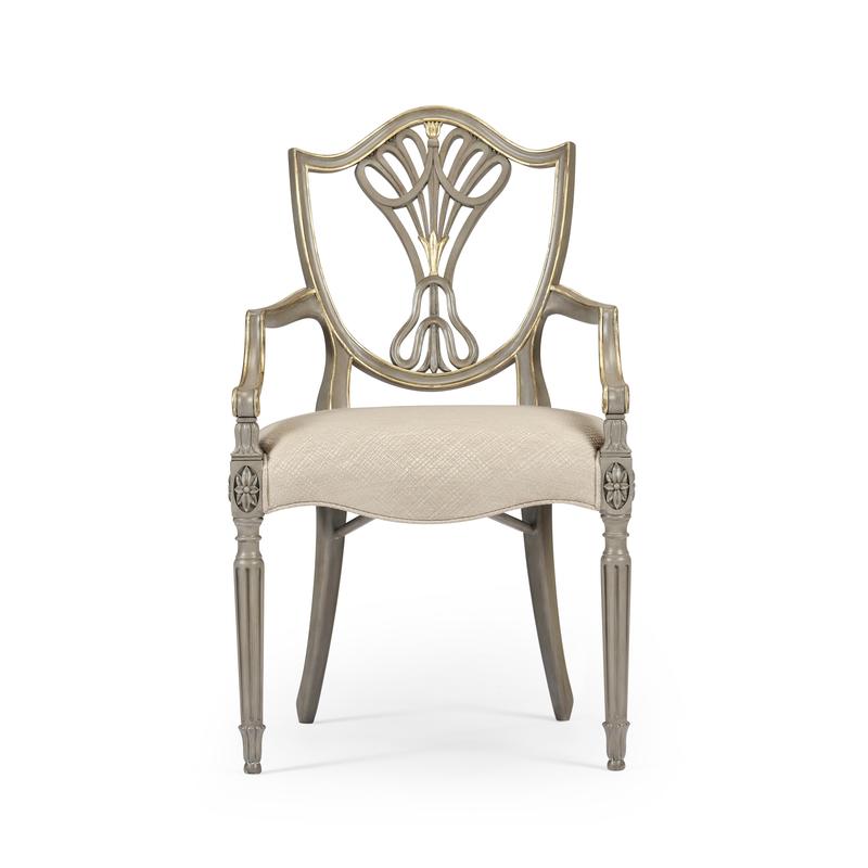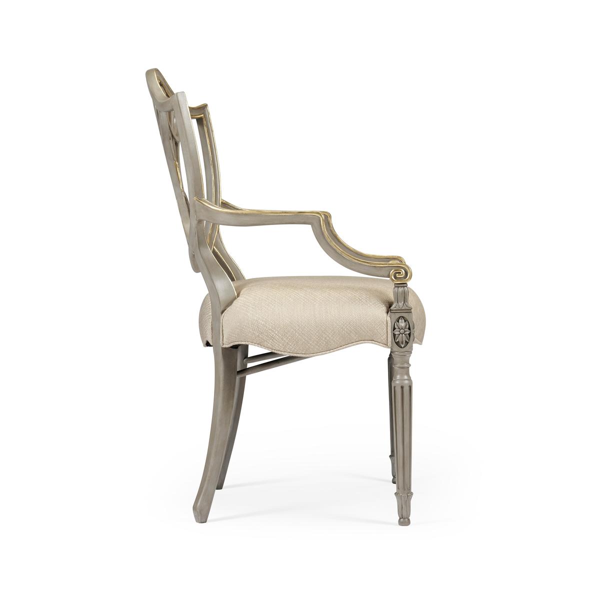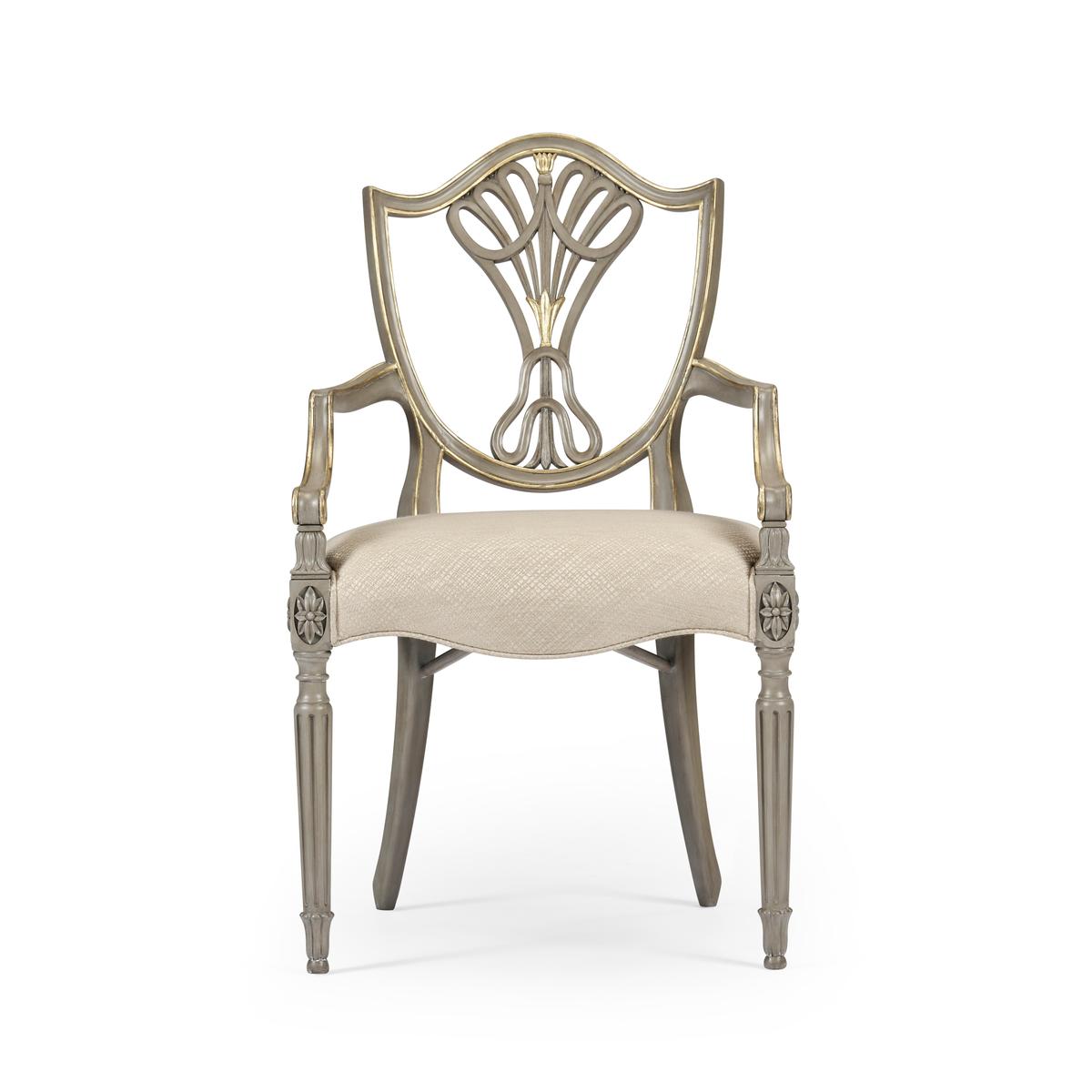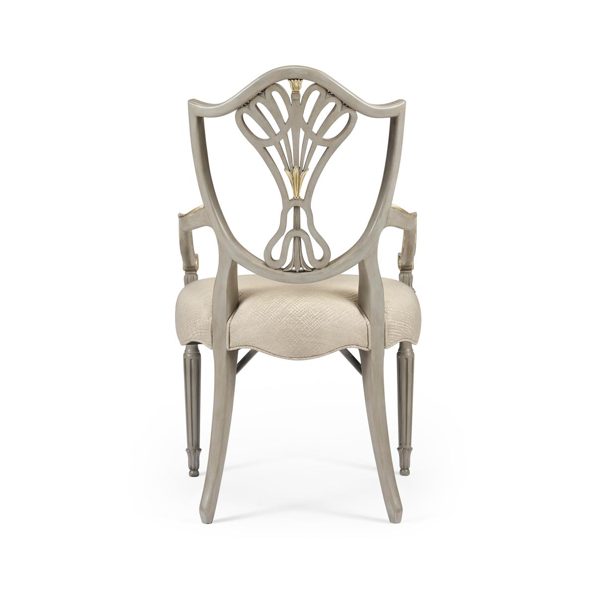 Sheraton dining arm chair with classic painted shield back in buckingham grey and gilded details. Frame is covered in a Jonathan Charles performance fabric Skipper (F200).