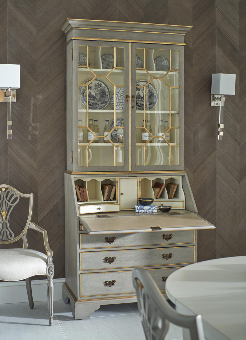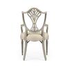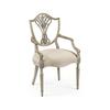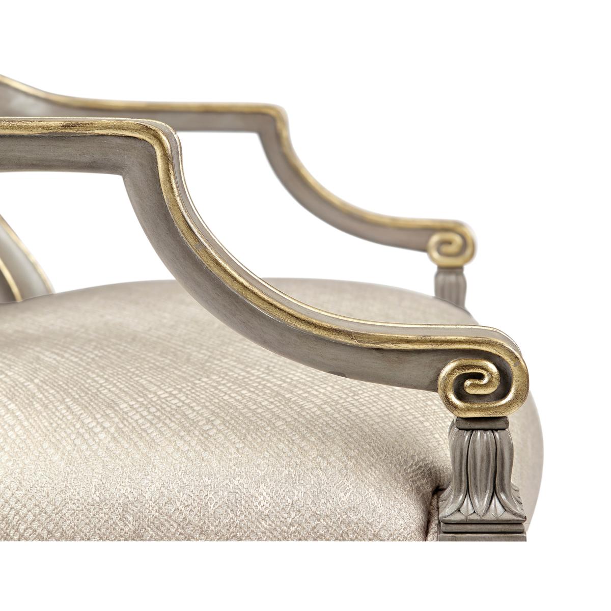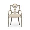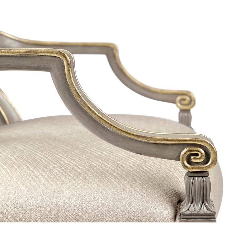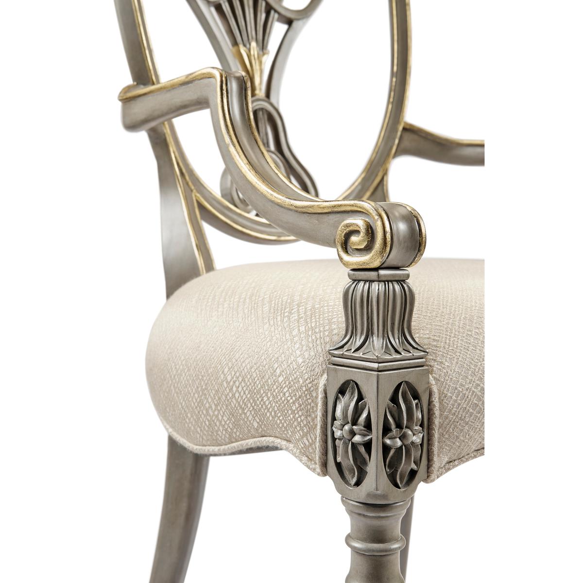 Sheraton dining arm chair with classic painted shield back in buckingham grey and gilded details. Frame is covered in a Jonathan Charles performance fabric Skipper (F200).