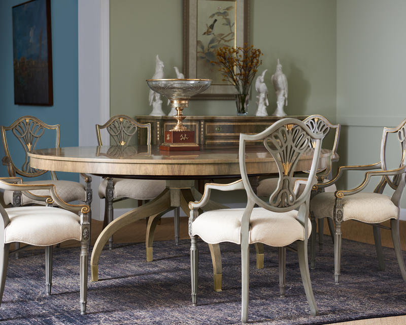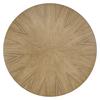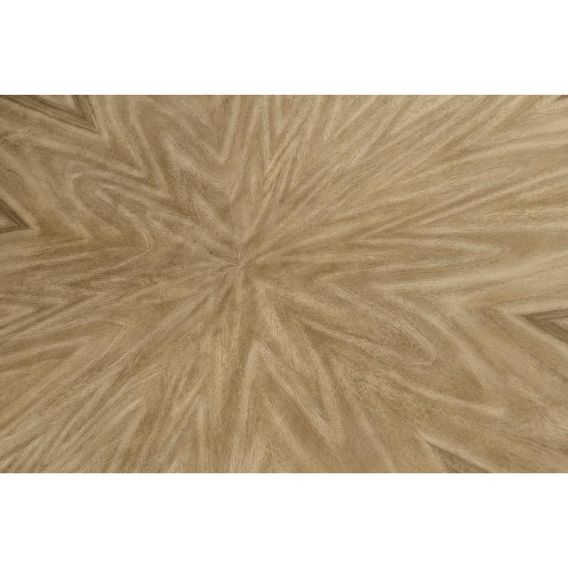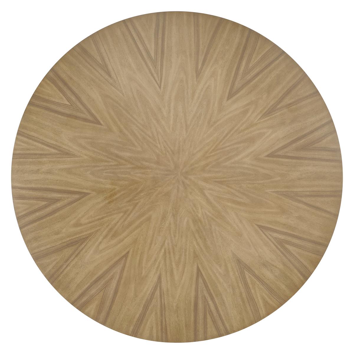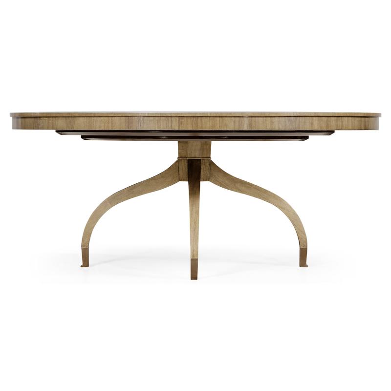 Effortlessly complementing formal and casual interiors alike, Jonathan Charles’ Buckingham dining table boasts a round bleached walnut top with striking radial veneers. Accented with cast brass ferrules, it delivers sophistication and understated glamour, perfect for foyers and dining spaces.