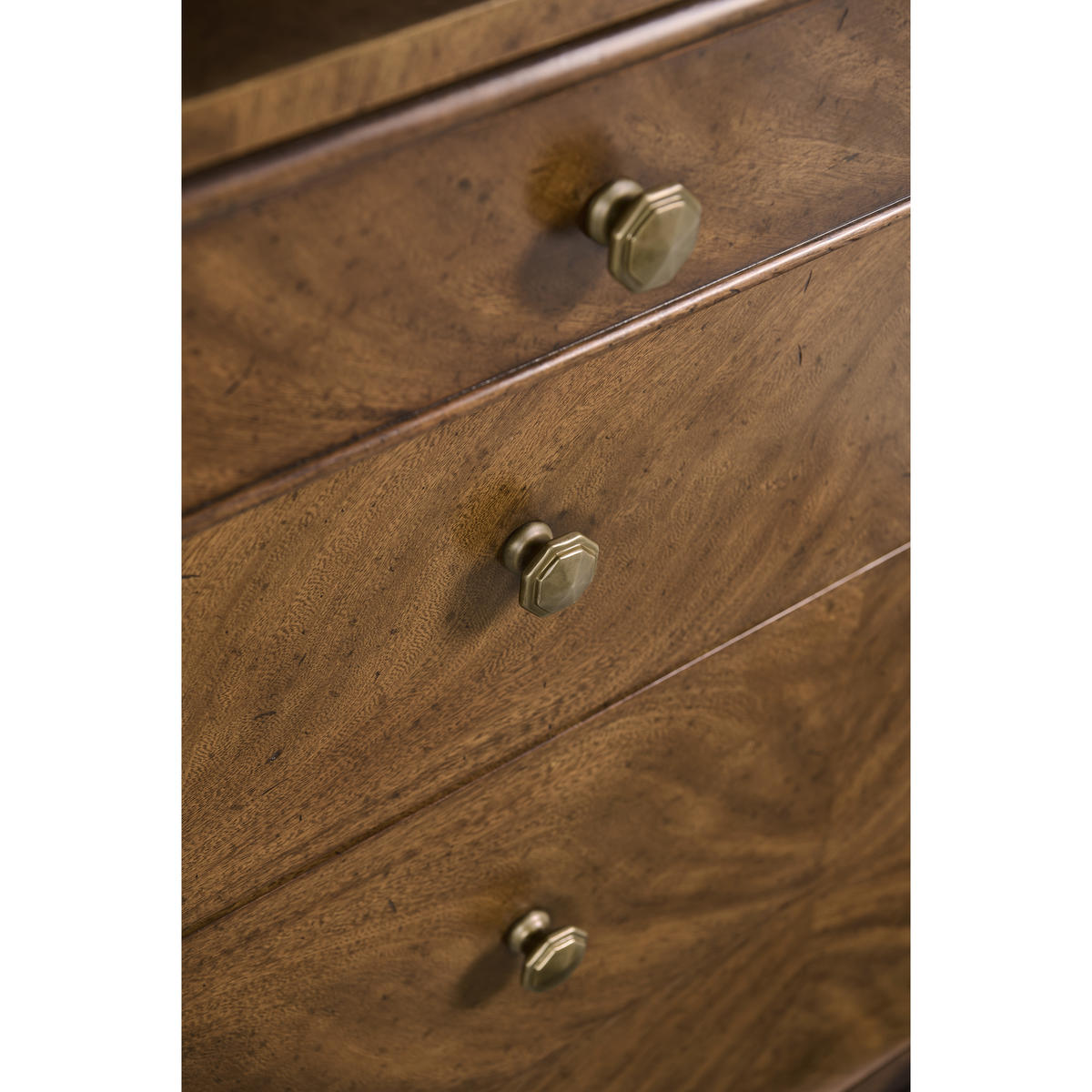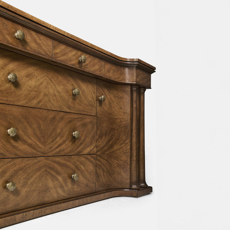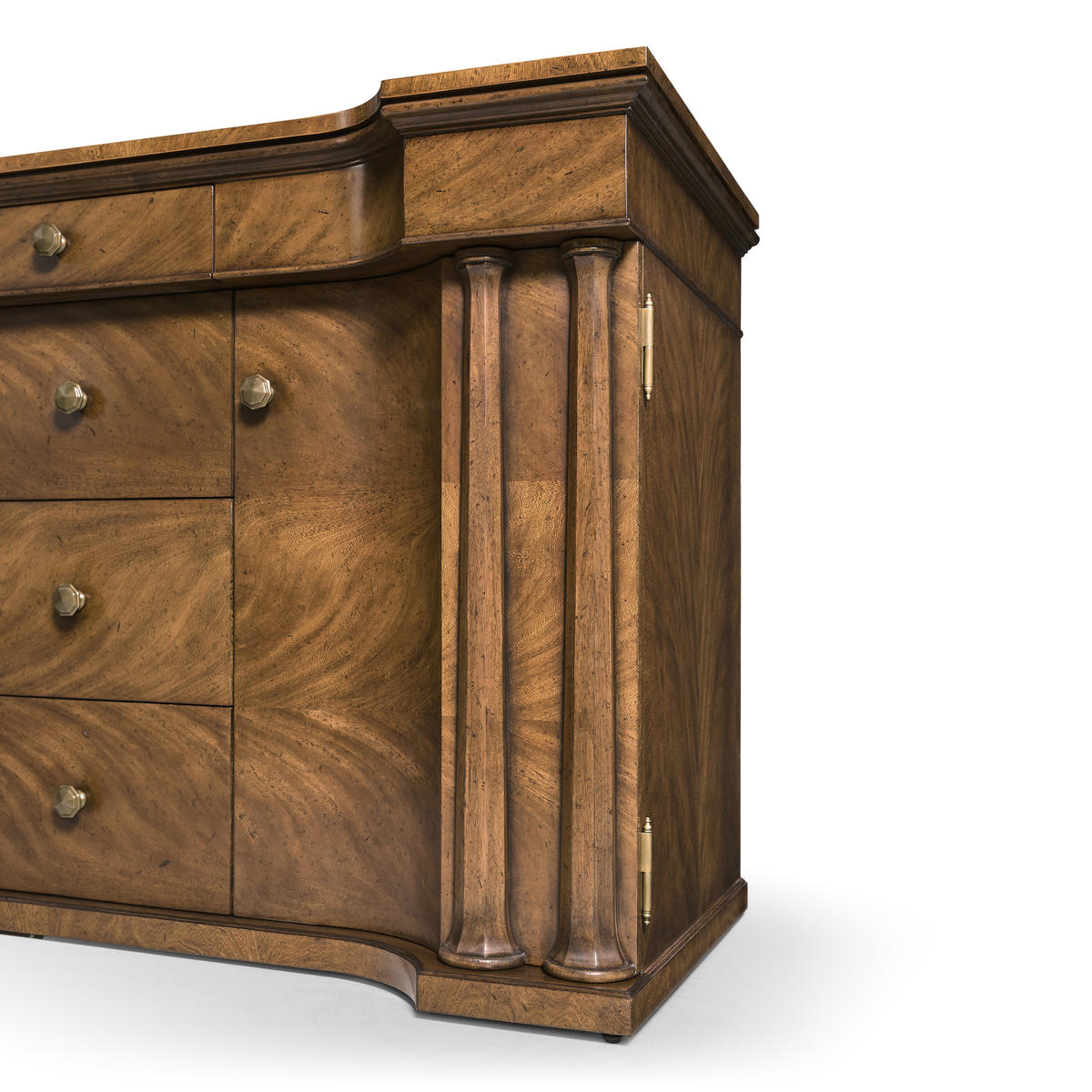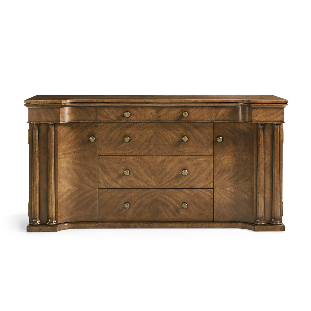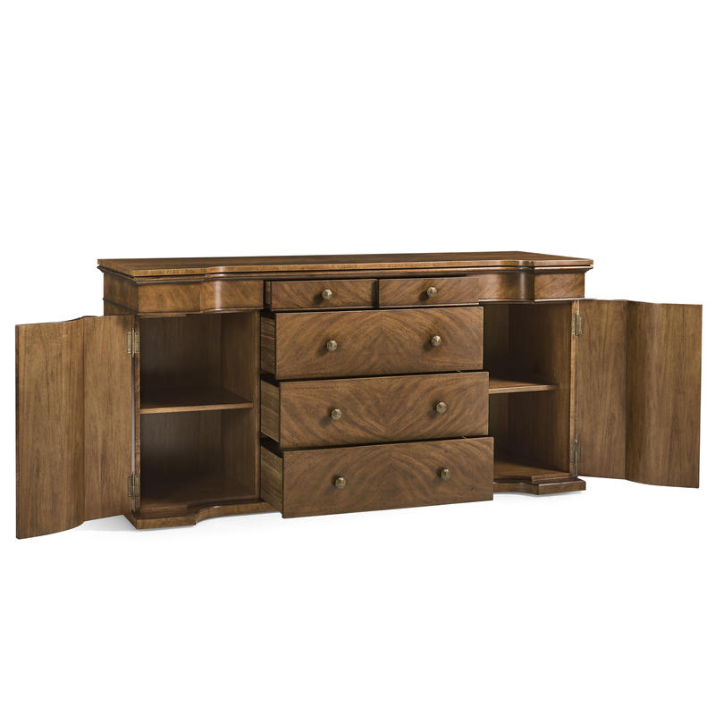 The Hattie Sideboard offers sophisticated storage with a sleek traditional design that complements any classic residence. Crafted from exquisite Cerajera veneers, this sideboard features a warm, natural finish that adds a touch of elegance to any room. With five drawers and two side doors, it provides ample storage space for your dining essentials. Inside the side doors, an adjustable shelf allows for customizable organization, making it both practical and stylish.