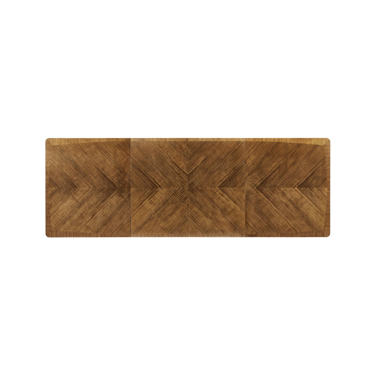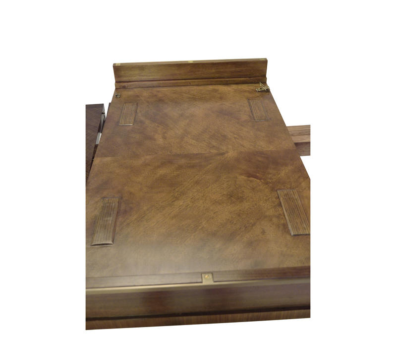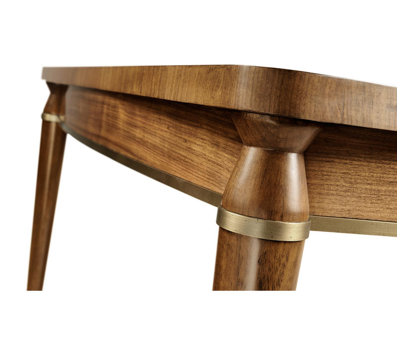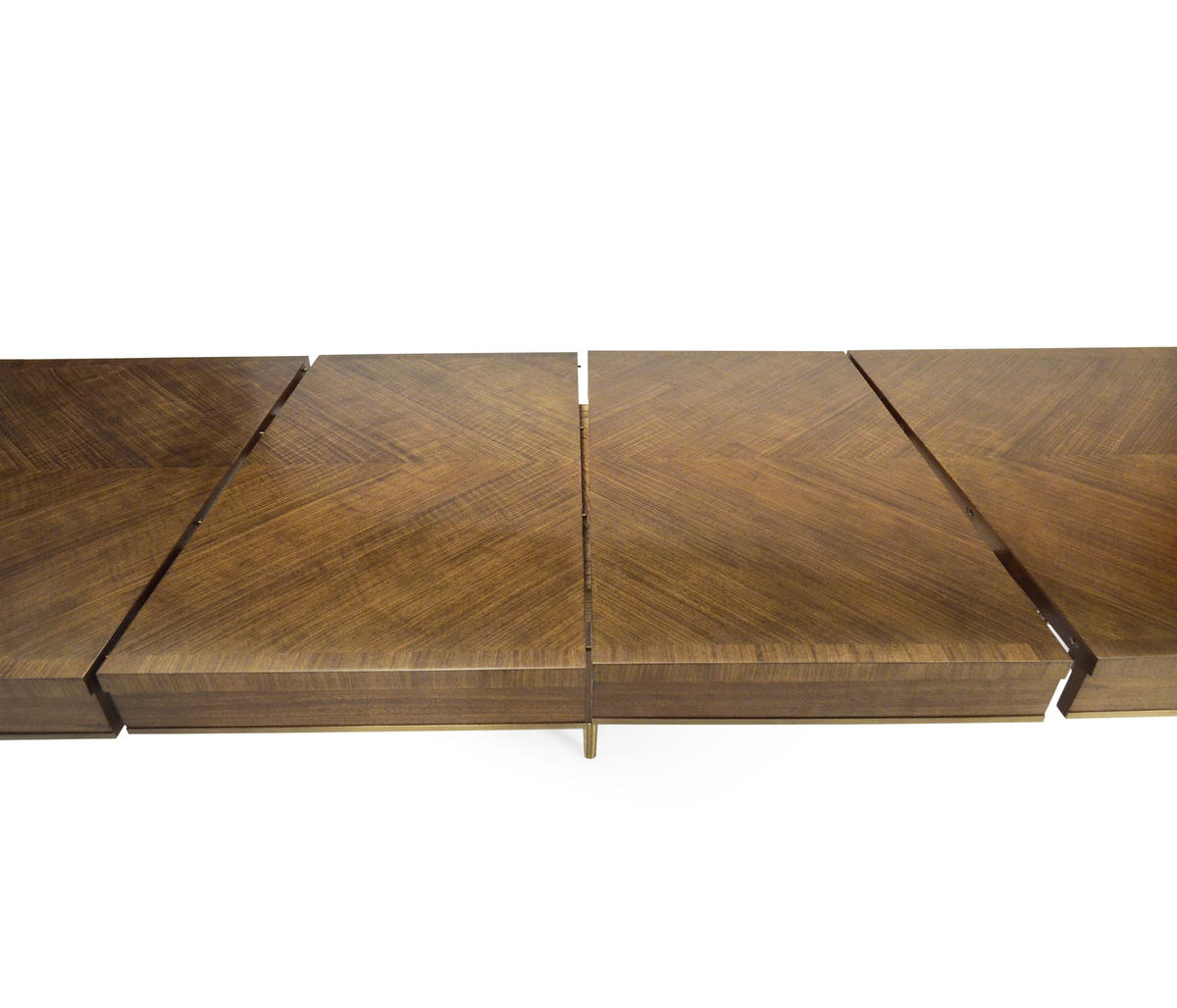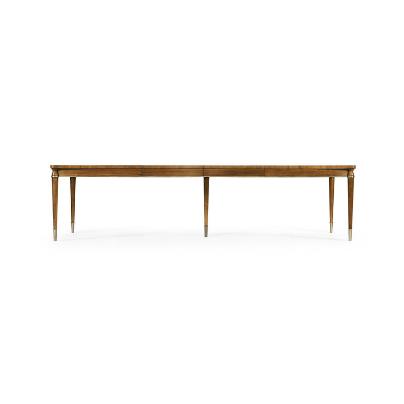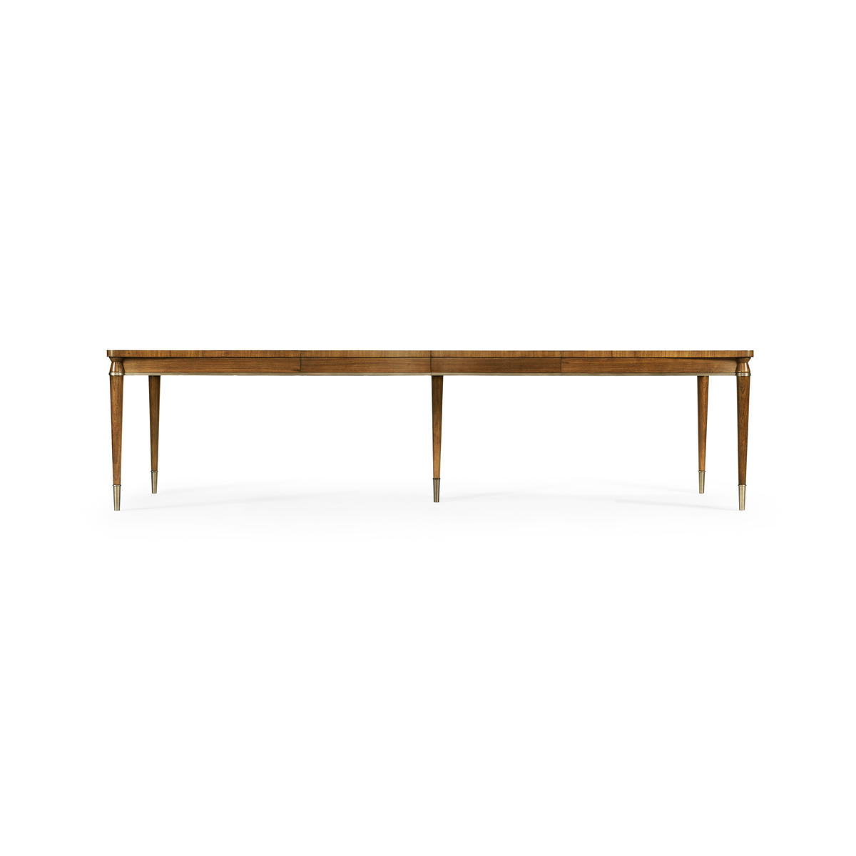 This dining table features figured walnut veneer in a book matched pattern reminiscent of straw work. Brass hardware is cast in the Jonathan Charles foundry where it is acid dipped and hand rubbed to achieve a rich natural patina. This table has two leaves to accomodate up to ten guest..