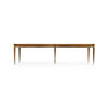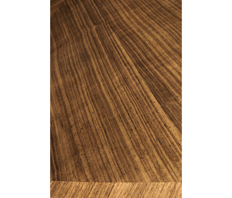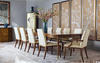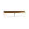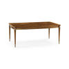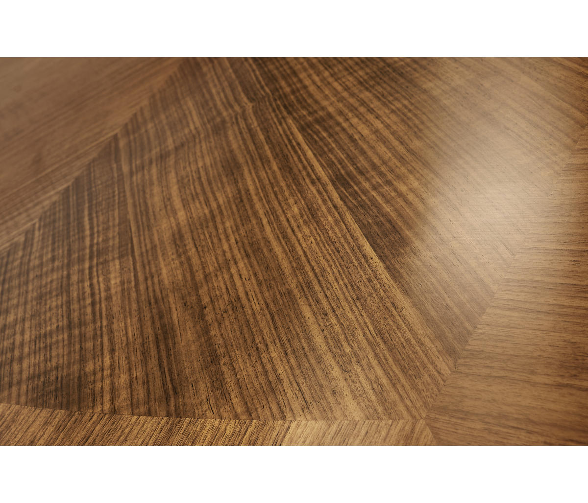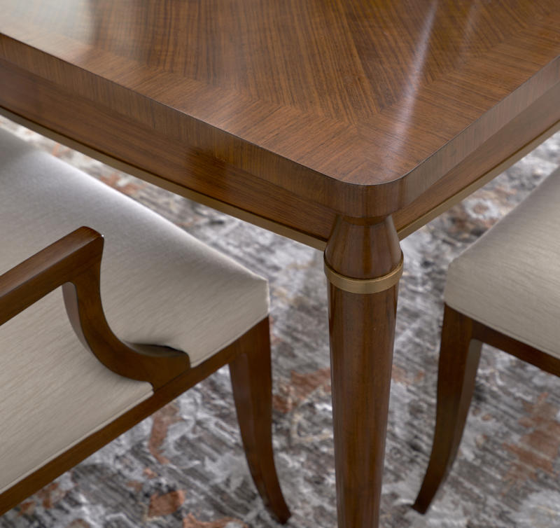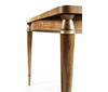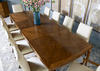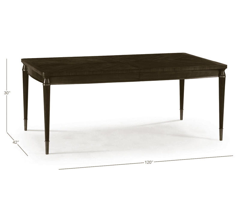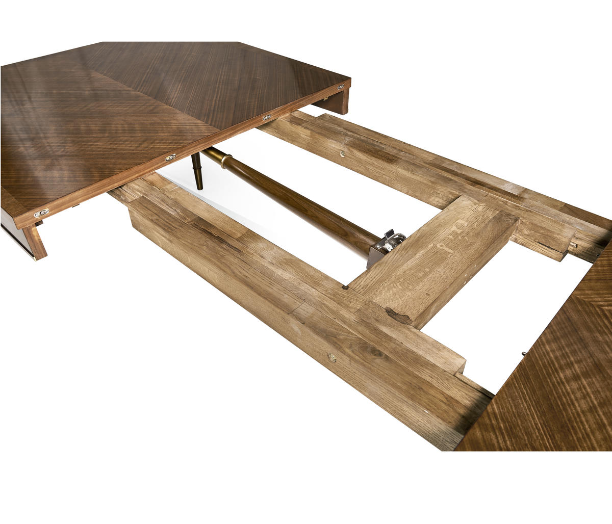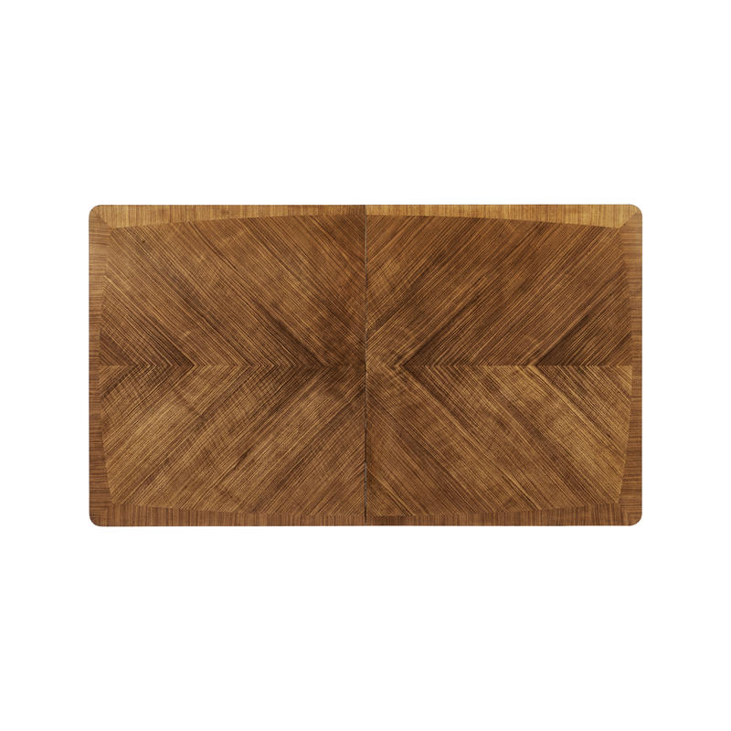 This dining table features figured walnut veneer in a book matched pattern reminiscent of straw work. Brass hardware is cast in the Jonathan Charles foundry where it is acid dipped and hand rubbed to achieve a rich natural patina. This table has two leaves to accomodate up to ten guest..
